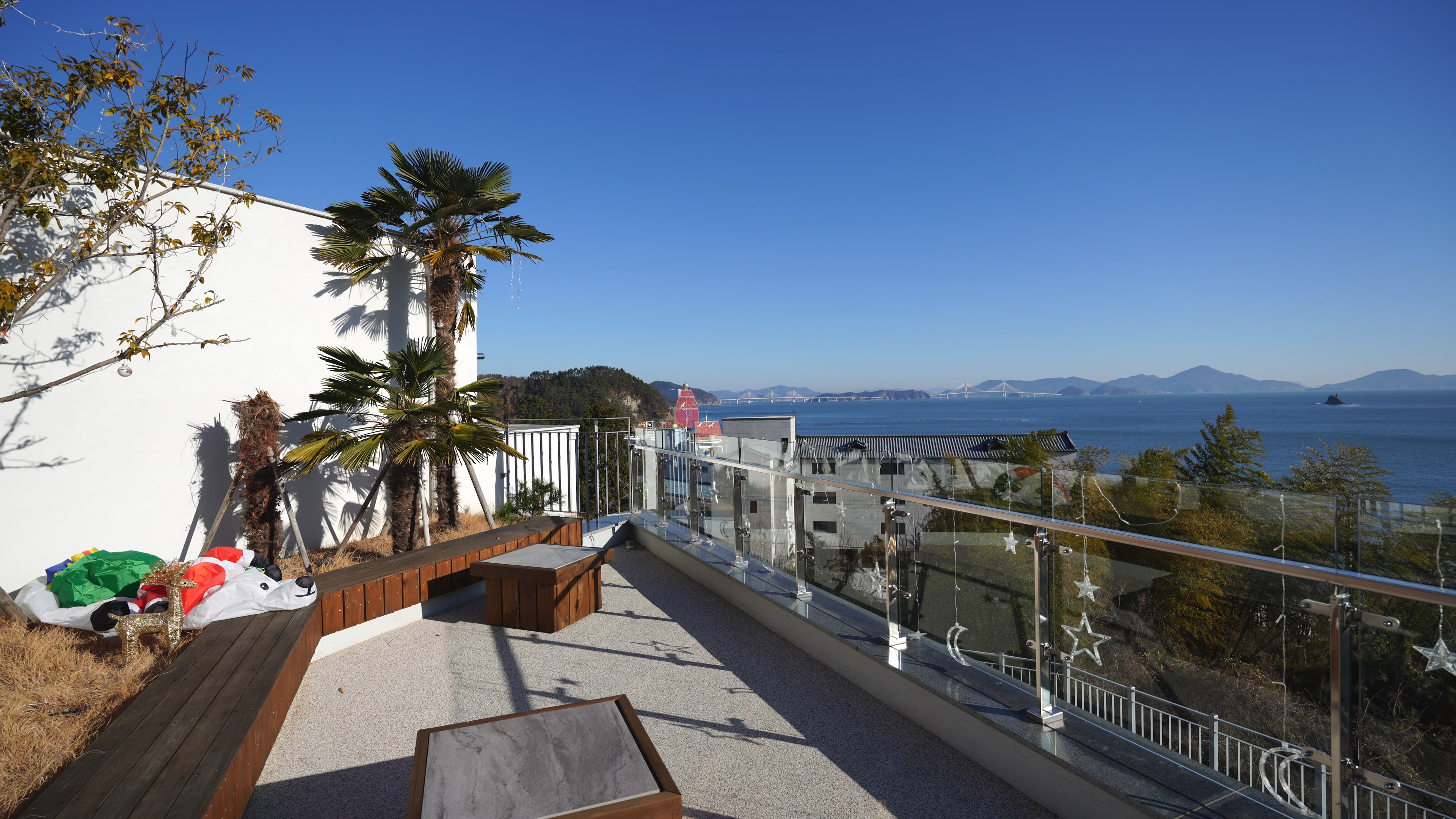 펜션 입구에 있던 쉼터. 거가대교도 보이고, 여기서 일출 감상하기 딱 좋아 보였다.
