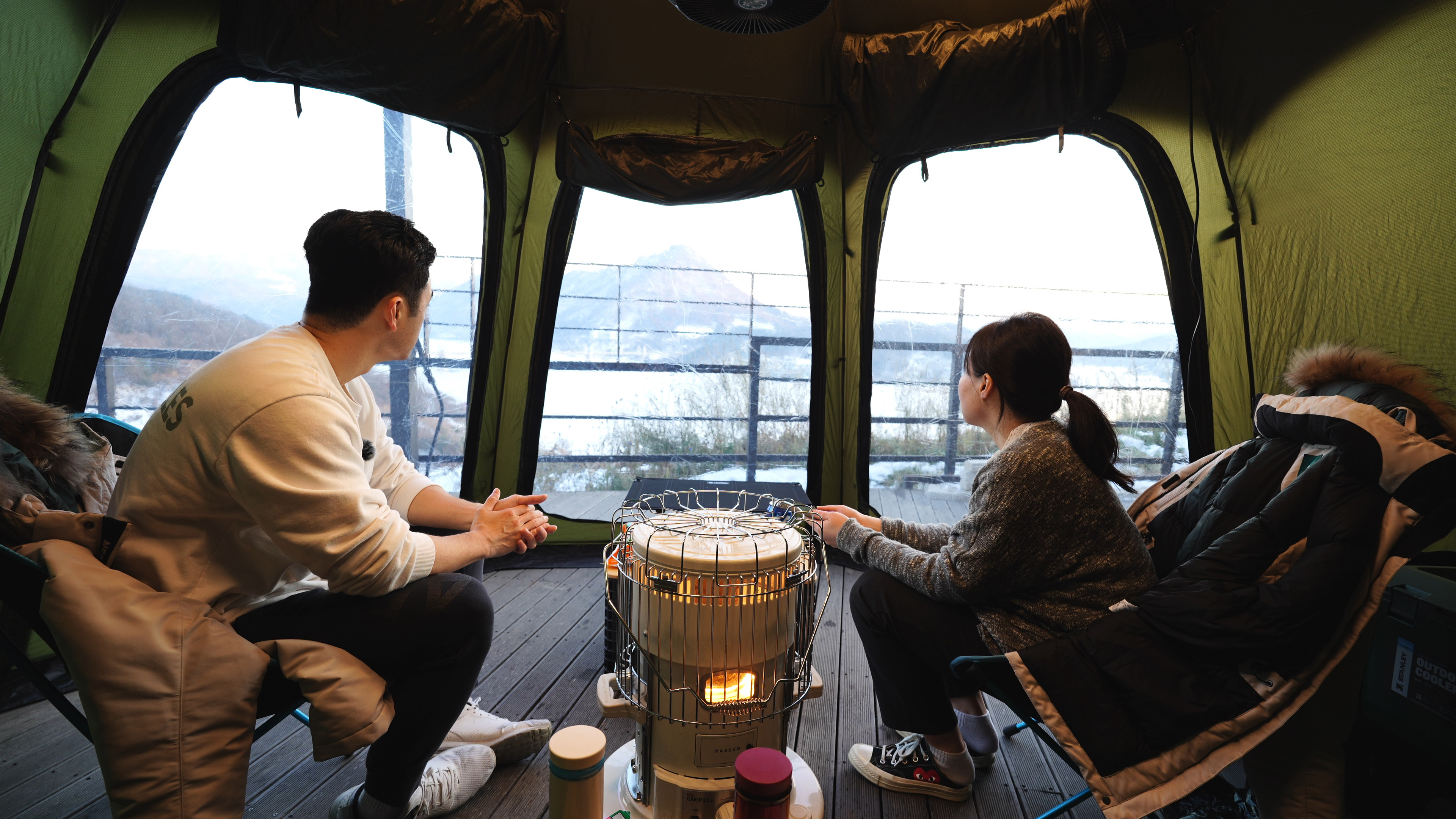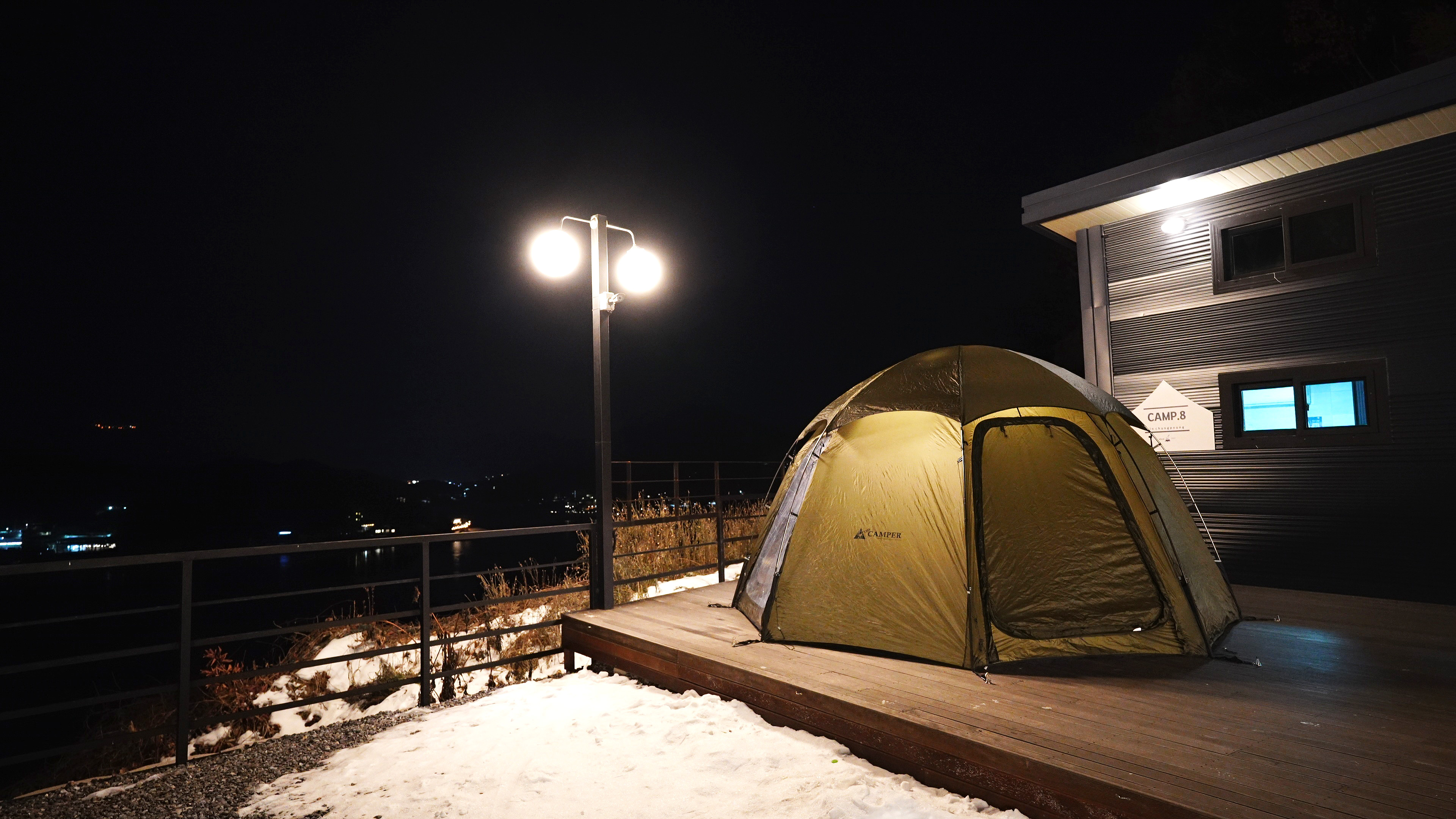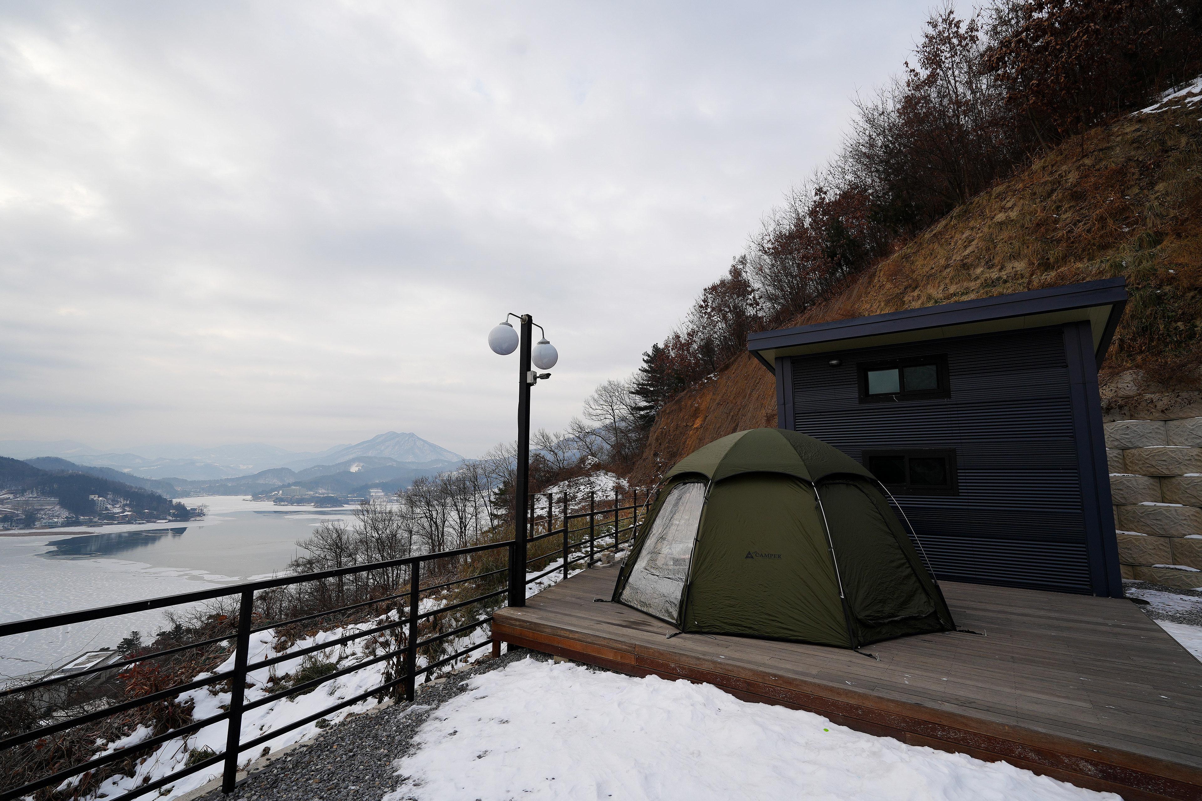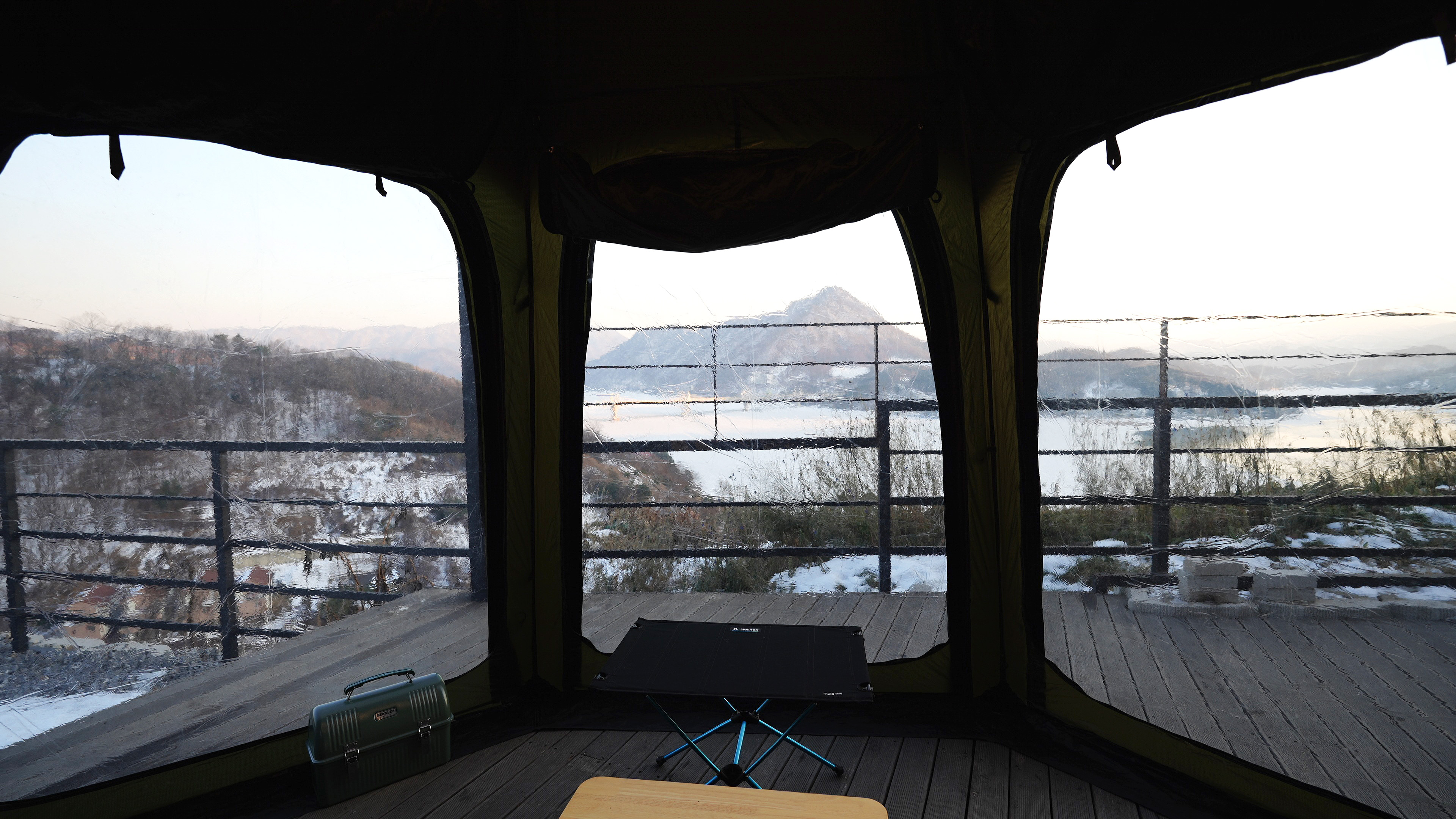 텐트 설치후 내부에서 바라본 호수 뷰. 겨울이라 좀 밋밋한데, 파란 강물이 보이는 봄/여름/가을에는 정말 끝내주는 뷰일 듯