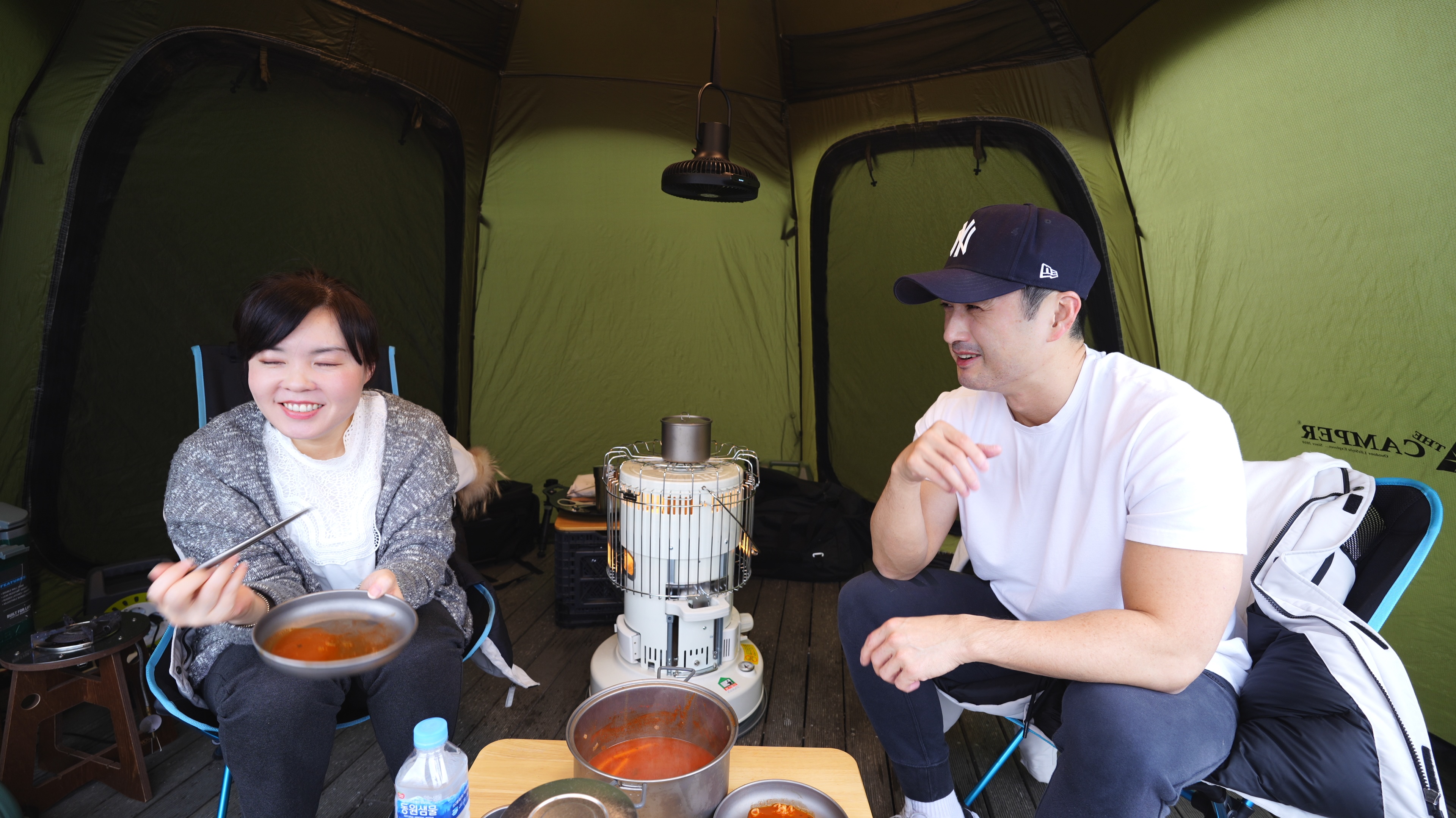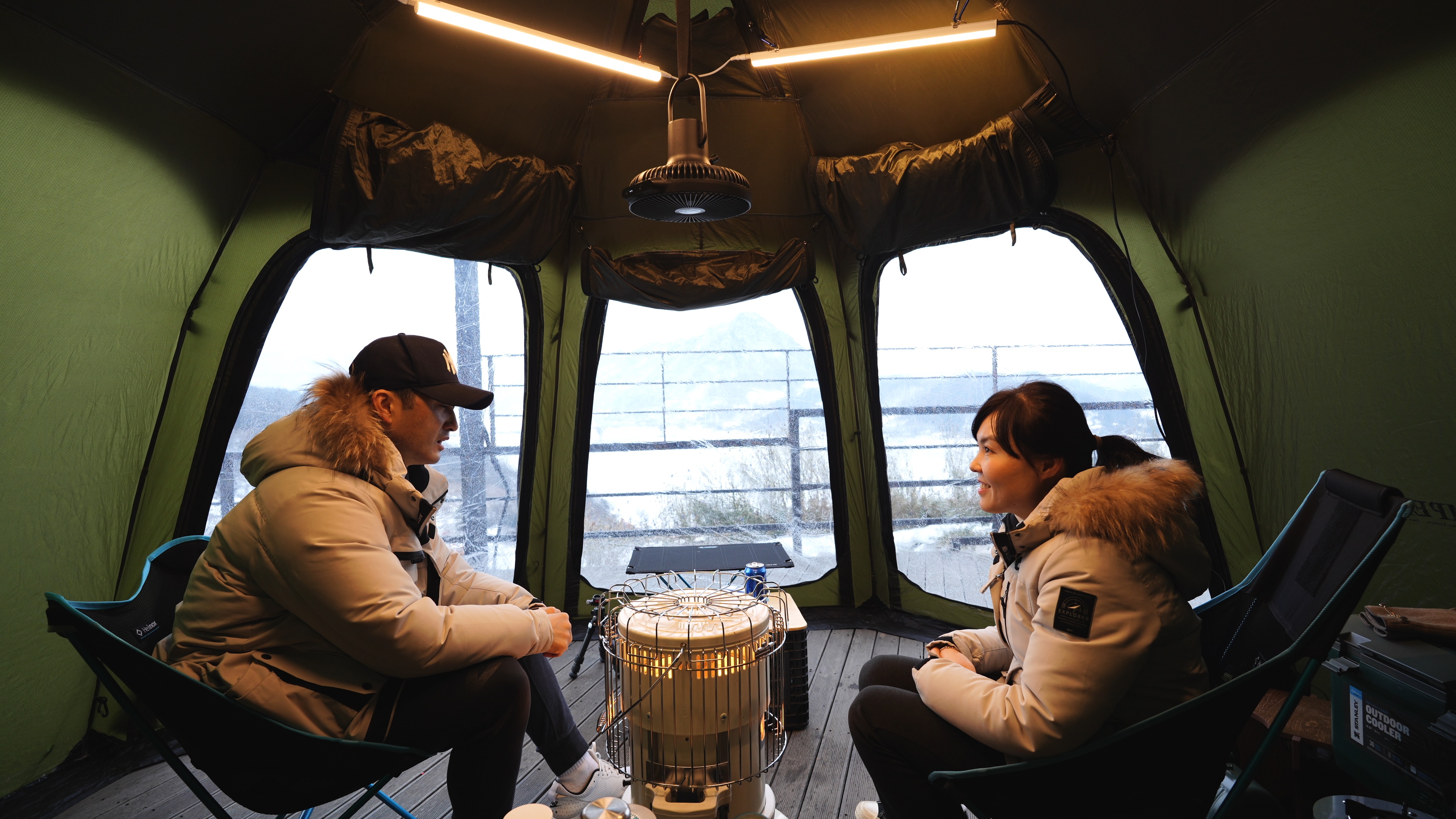 이그니스L 쉘터의 내부세팅. 폴딩박스 2개, 난로 1개, 의자 2개로 끝.