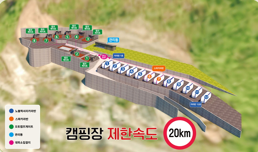 캠핑장 사이트는 왼쪽 구역이 야영캠핑장, 우측이 카라반 사이트로 구성되어 있는 형태. 살펴본 결과 8번 사이트가 가장 뷰가 좋고 명당이라고 알고 찾아갔으나, 8번은 물론, 1,2번도 꽤나 뷰가 좋고 독립적인 사이트라 8번 못지않게 야영하기 좋아 보였으니 참고.
