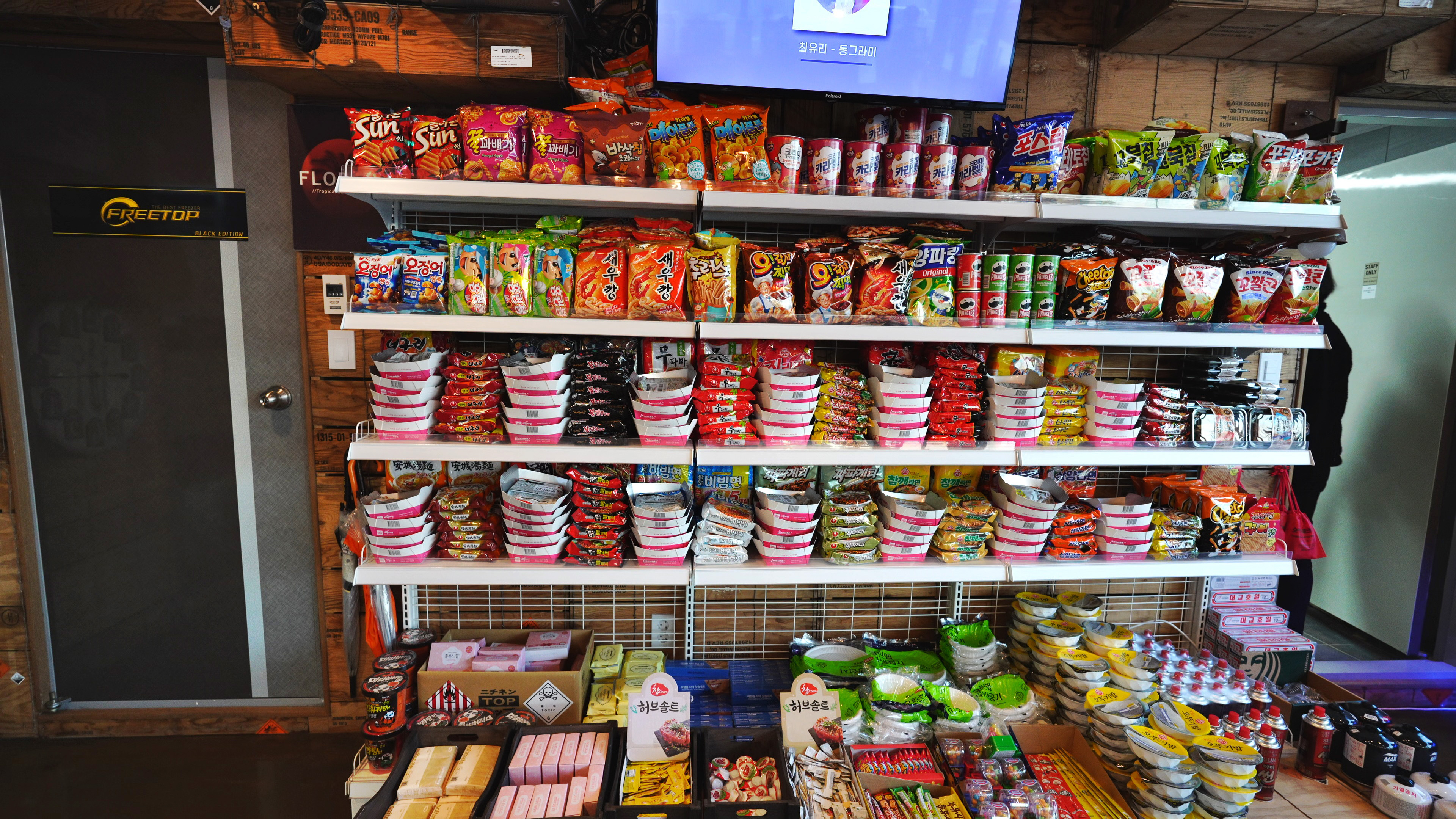 뭐 먹는 것들 부터, 캠핑에 필요한 가스, 숯 등을 판매하고 있어 편리하다.