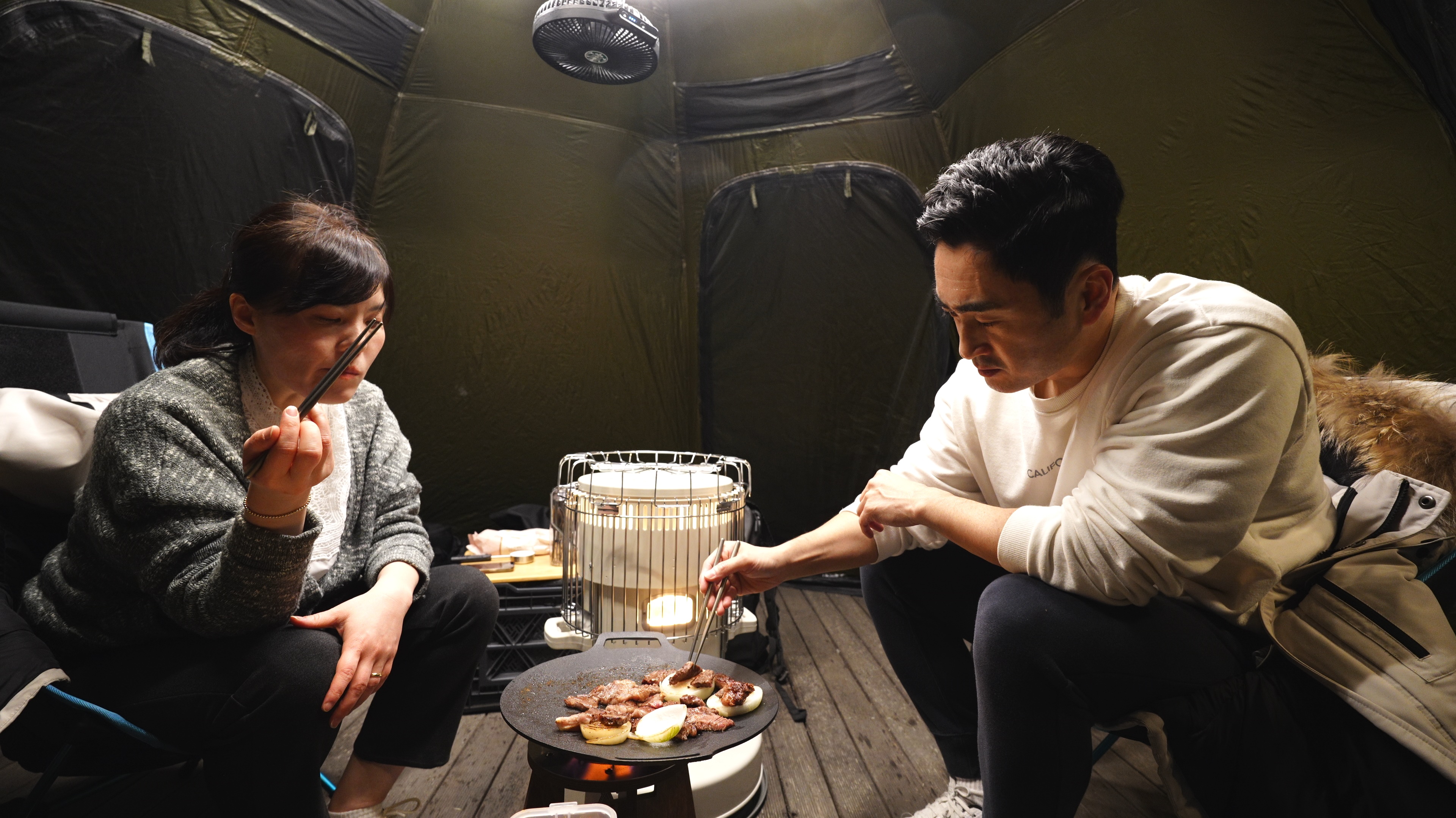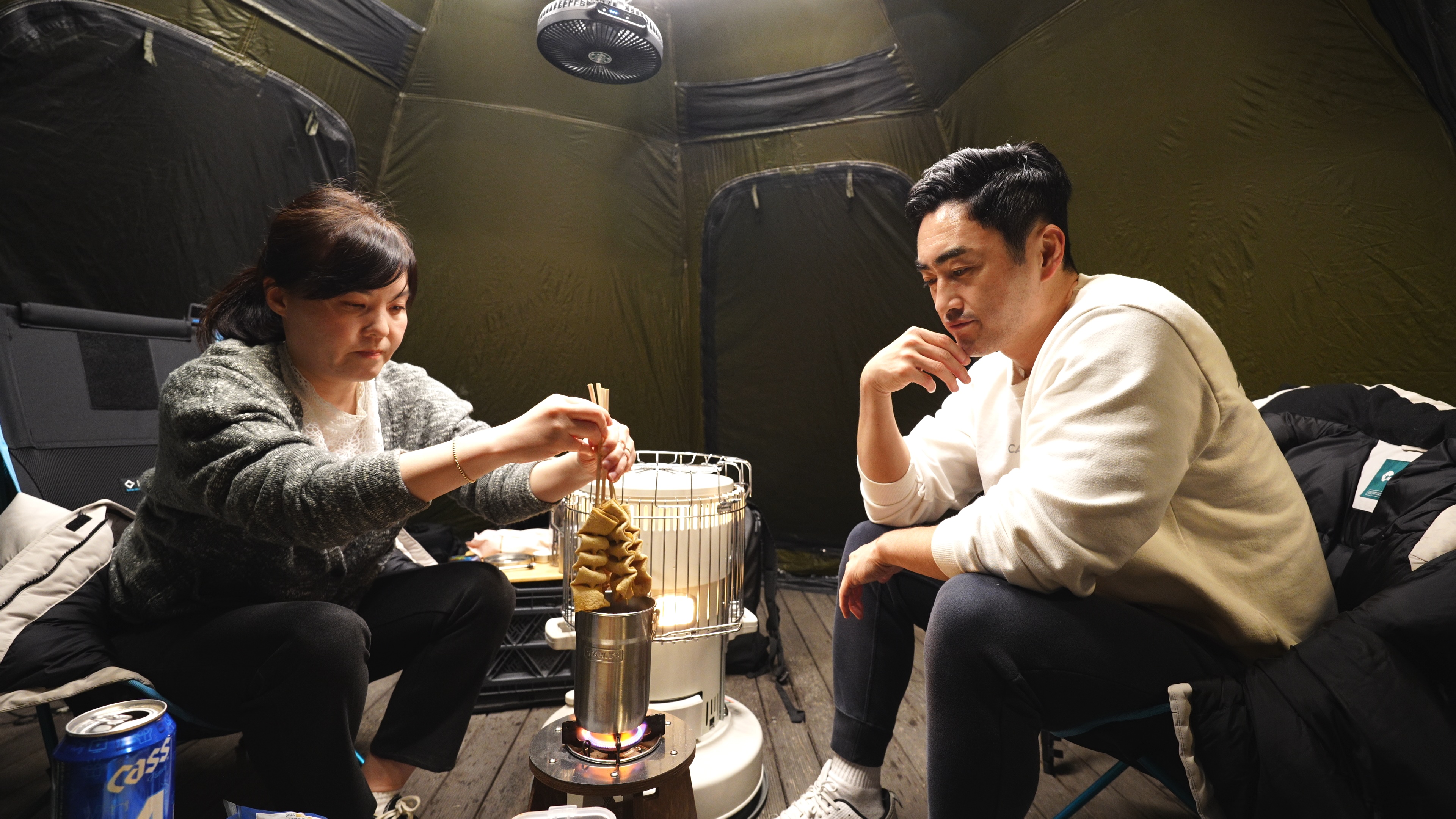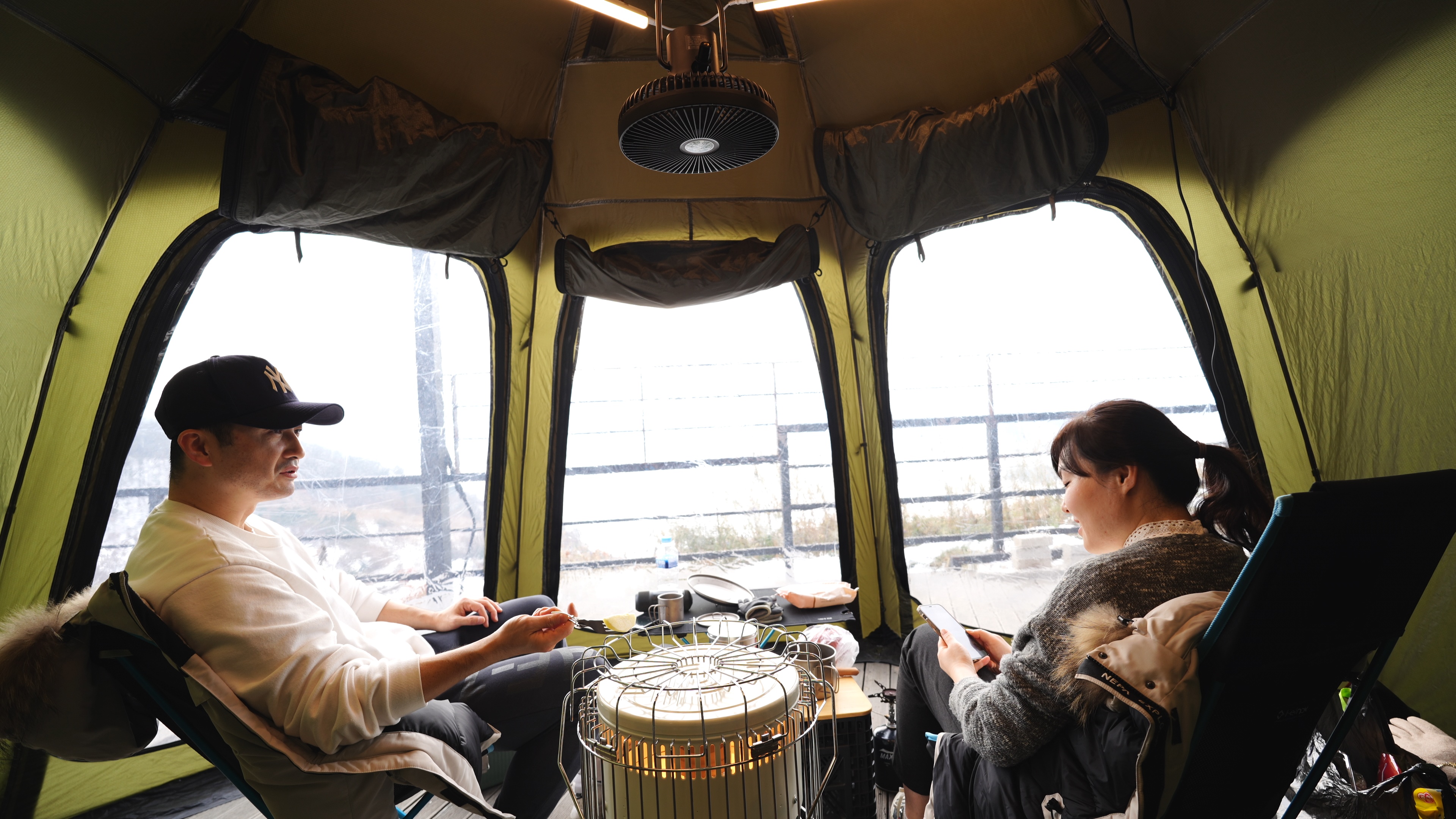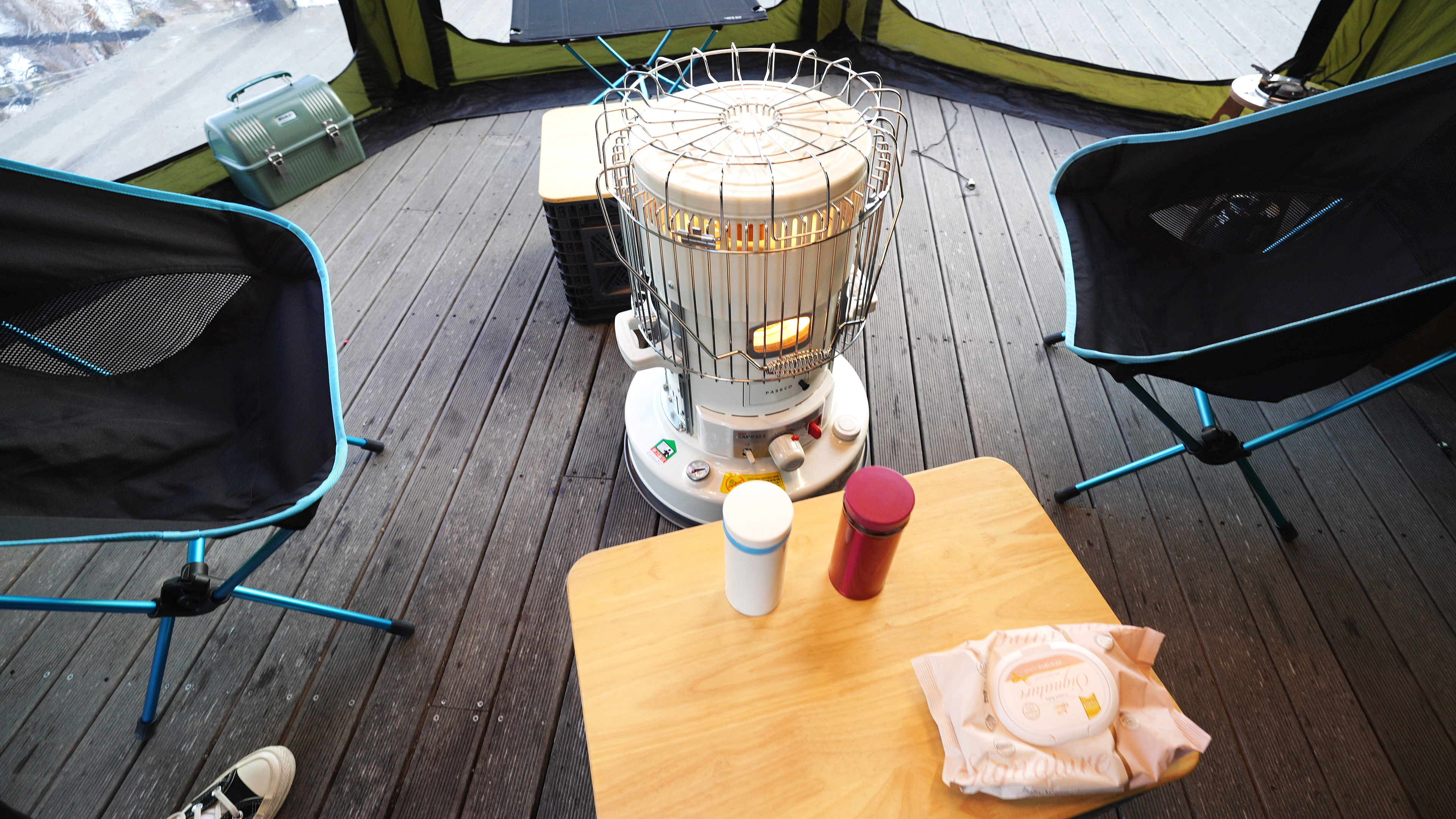 이그니스L 쉘터의 내부세팅. 폴딩박스 2개, 난로 1개, 의자 2개로 끝.