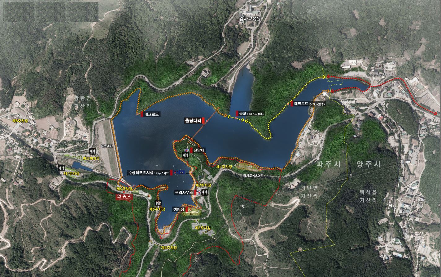 호수 근처로 주차장이 꽤 많은데, 1~2 주차장이 출렁다리와 가까운 곳이다. 평일이라 자리가 많을 줄 알고 갔으나 1,2 주차장은 이미 만차, 3주차장에 주차를 하고 걸어 가 본다. 지도를 보면 주차장들이 대부분 둘레길을 끼고 있어서 어디에 주차해도 상관은 없어 보이나, 출렁다리로 빨리 가고 싶으면 1,2 주차장이 가장 좋은 것 같다.