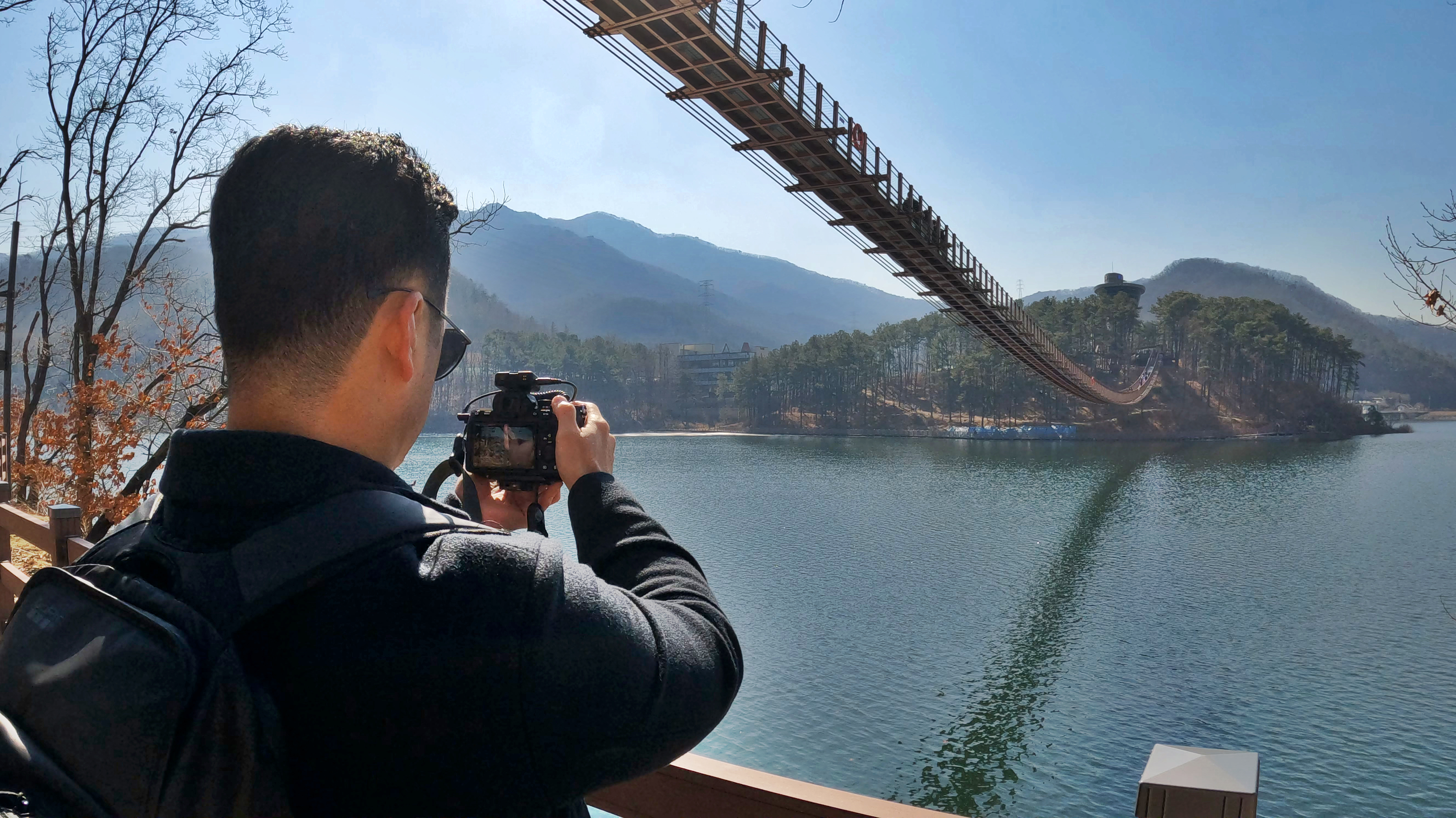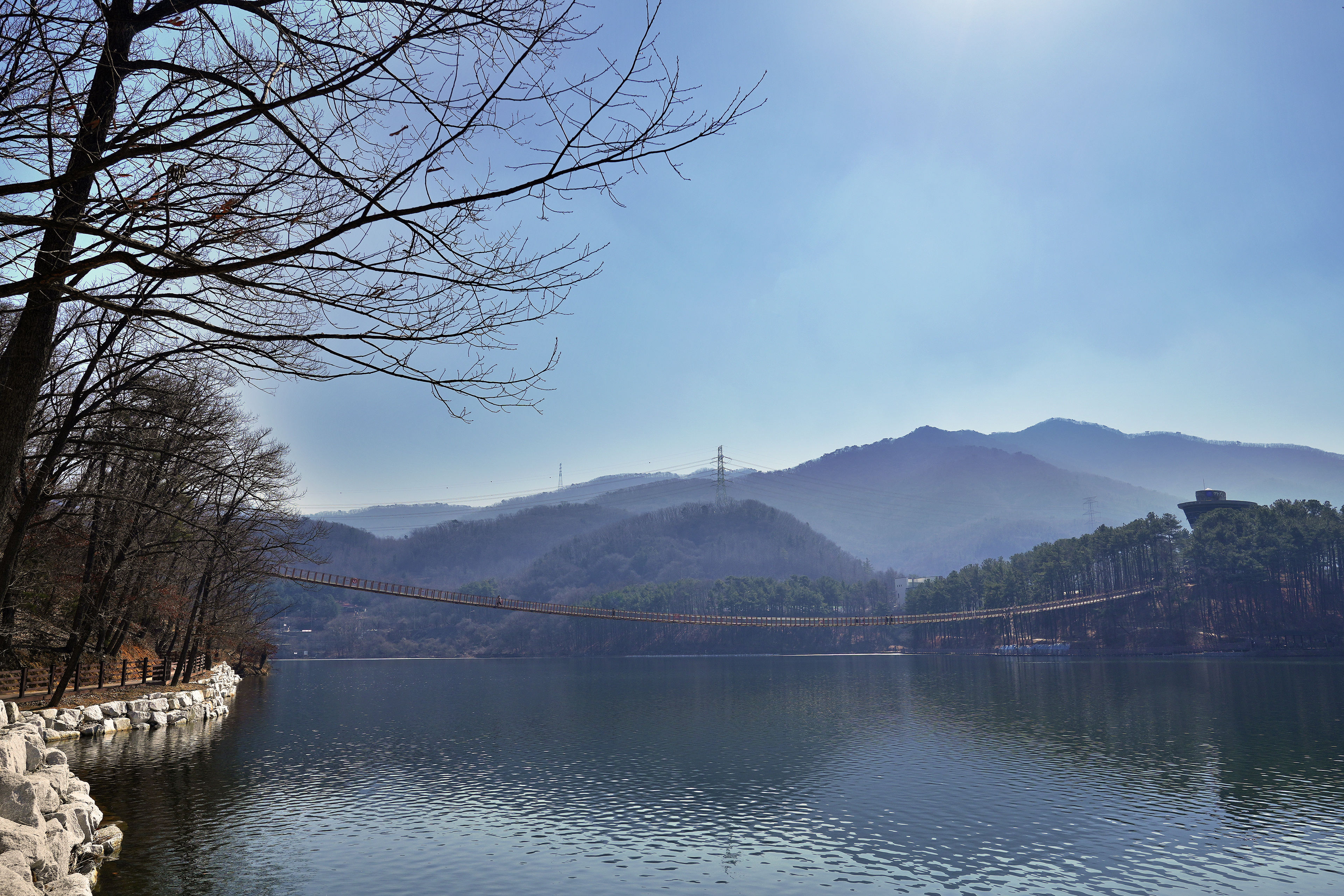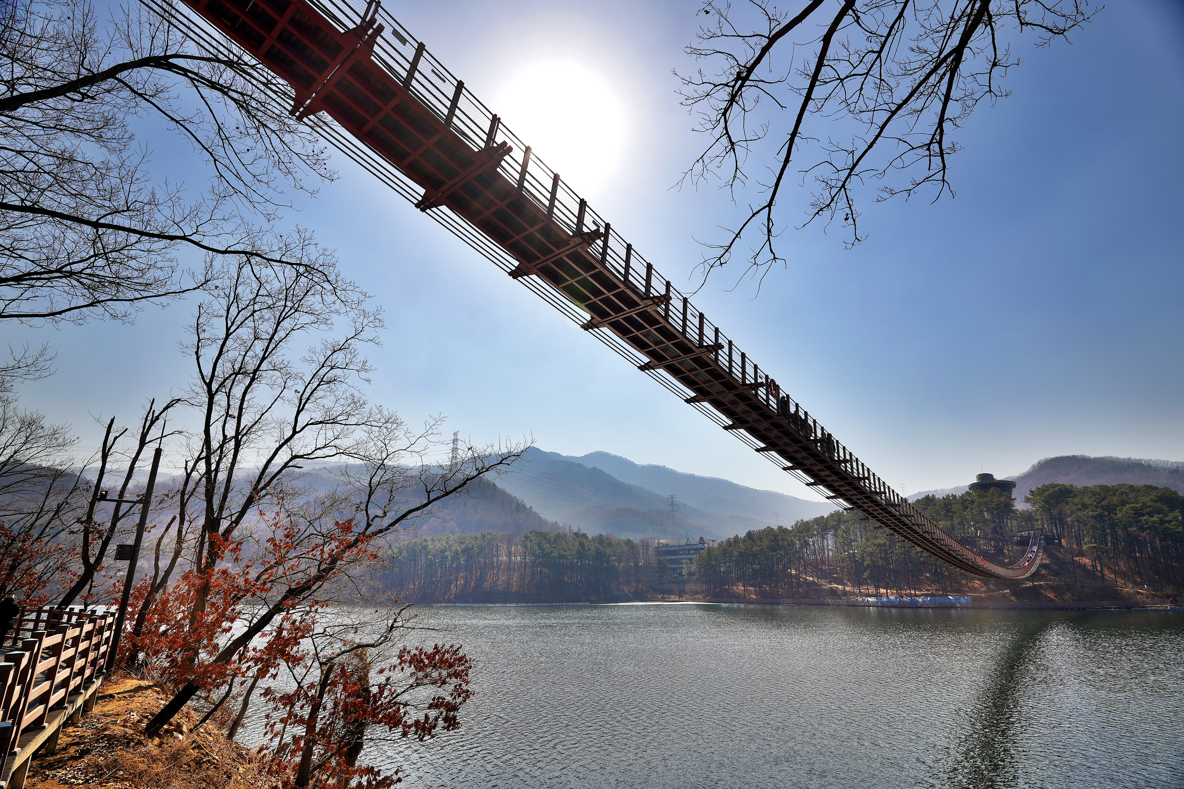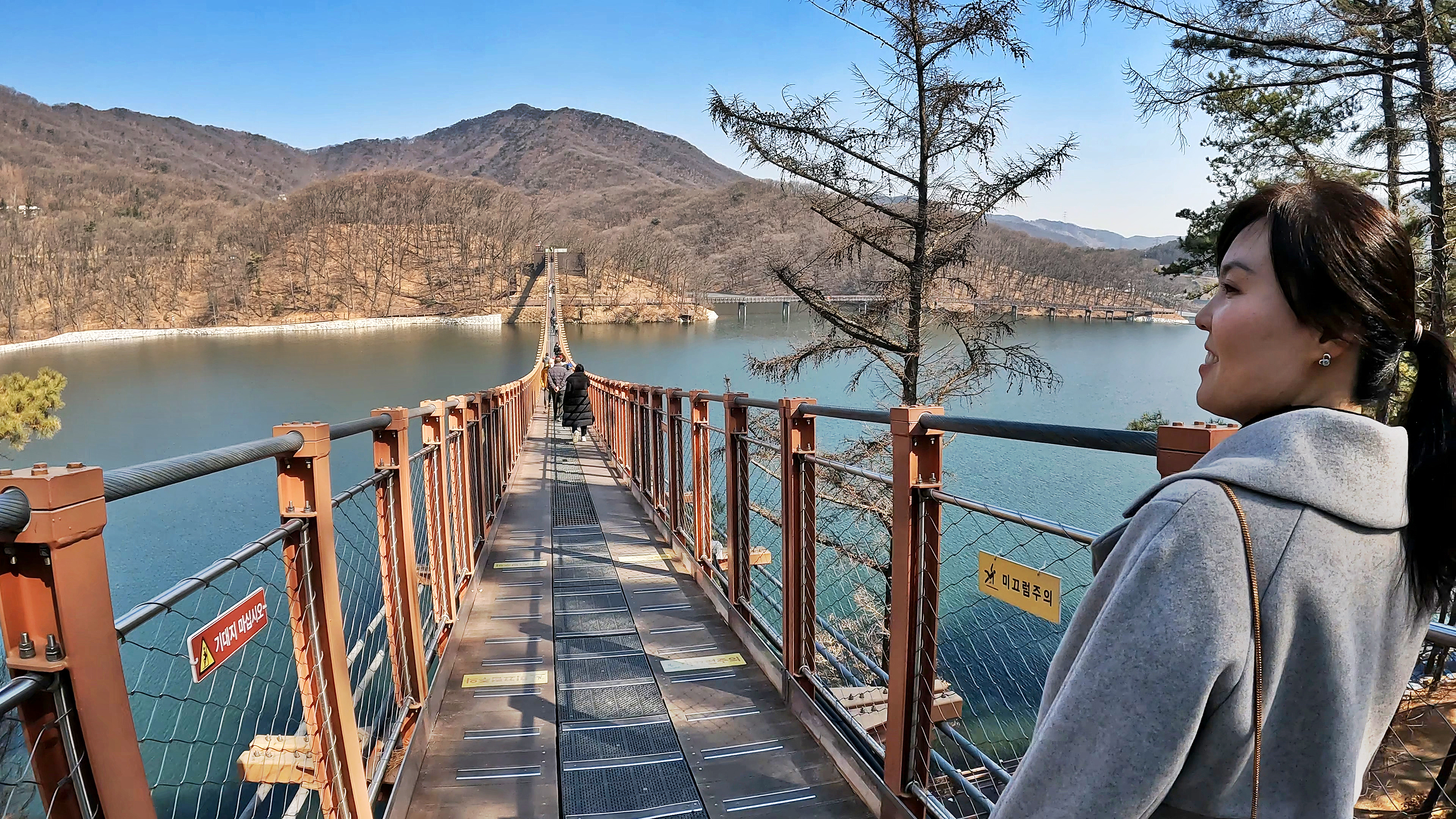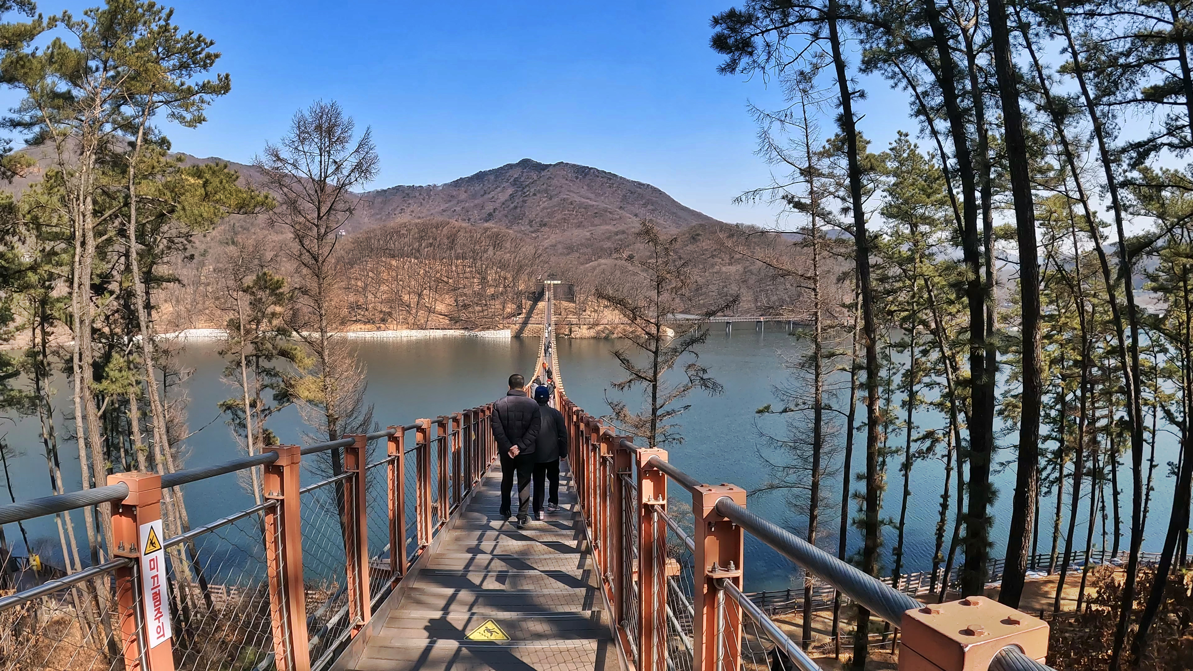 원주 소금강 출렁다리는 꽤나 높은 계곡을 가로지르는 느낌이었다면 이 곳은 잔잔한 호수 위를 지나가는 코스라, 경치는 이 곳이 훨씬 나아 보였다.