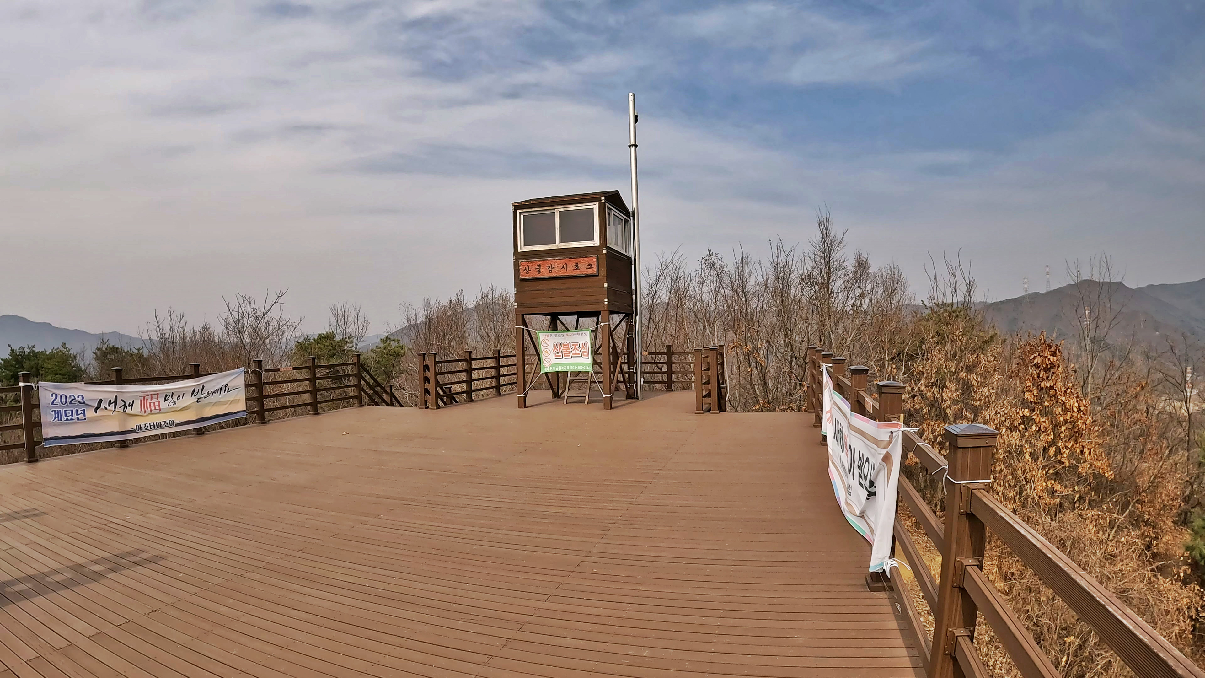 정상에 있는 전망대. 새해맞이 행사 플랭카드로 볼때 동두천에서 매년 새해맞이 행사를 하는 곳임을 알 수 있었다. 온 사방을 둘러볼수 있는 곳이라 언제 와도 일출 감상이 가능해 보였다.