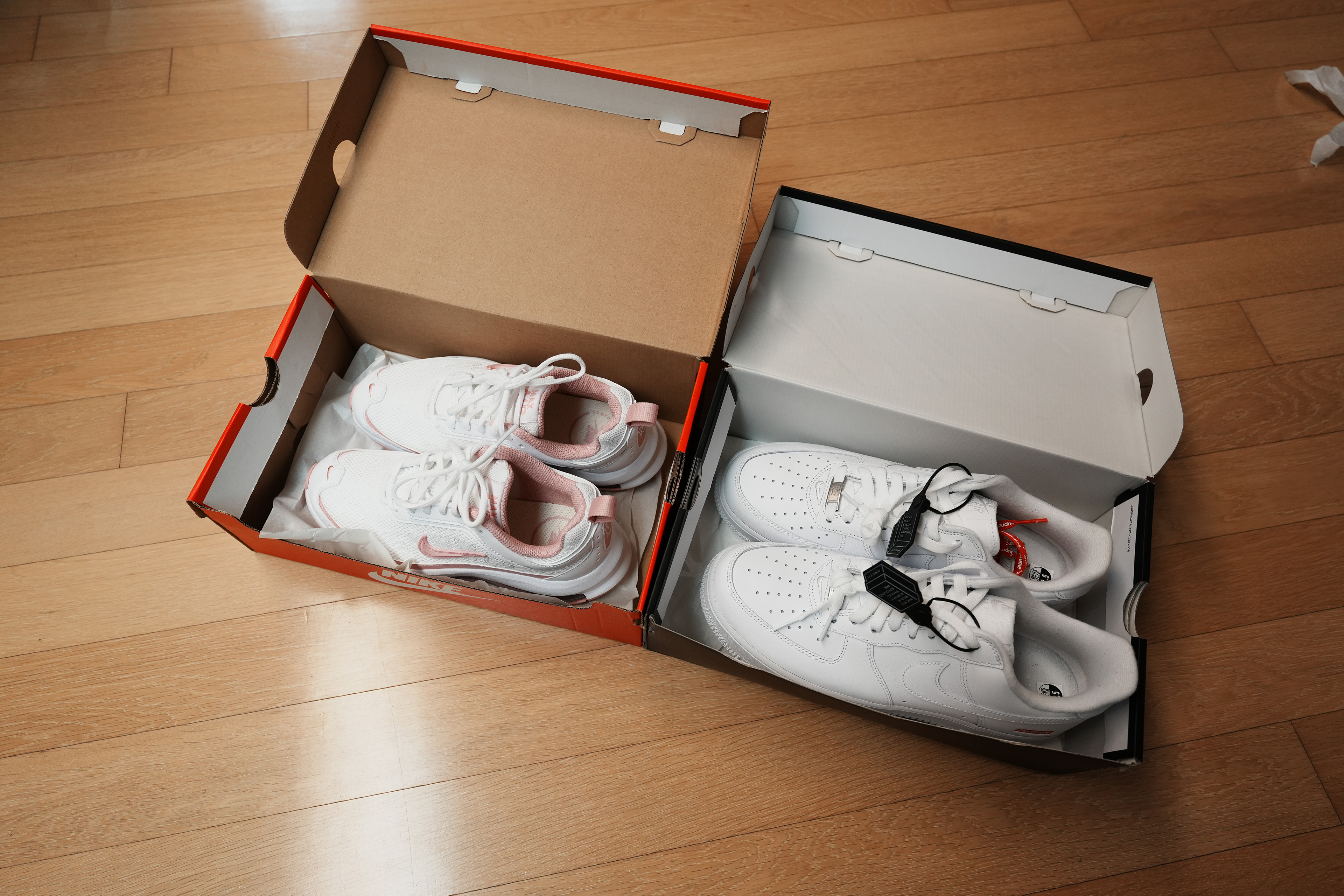 대학생이 된 딸에게 받은 어버이날 선물. 30만원 이내로 각각 하나씩 고르라는 딸의 요청에 커플 운동화로 선택.