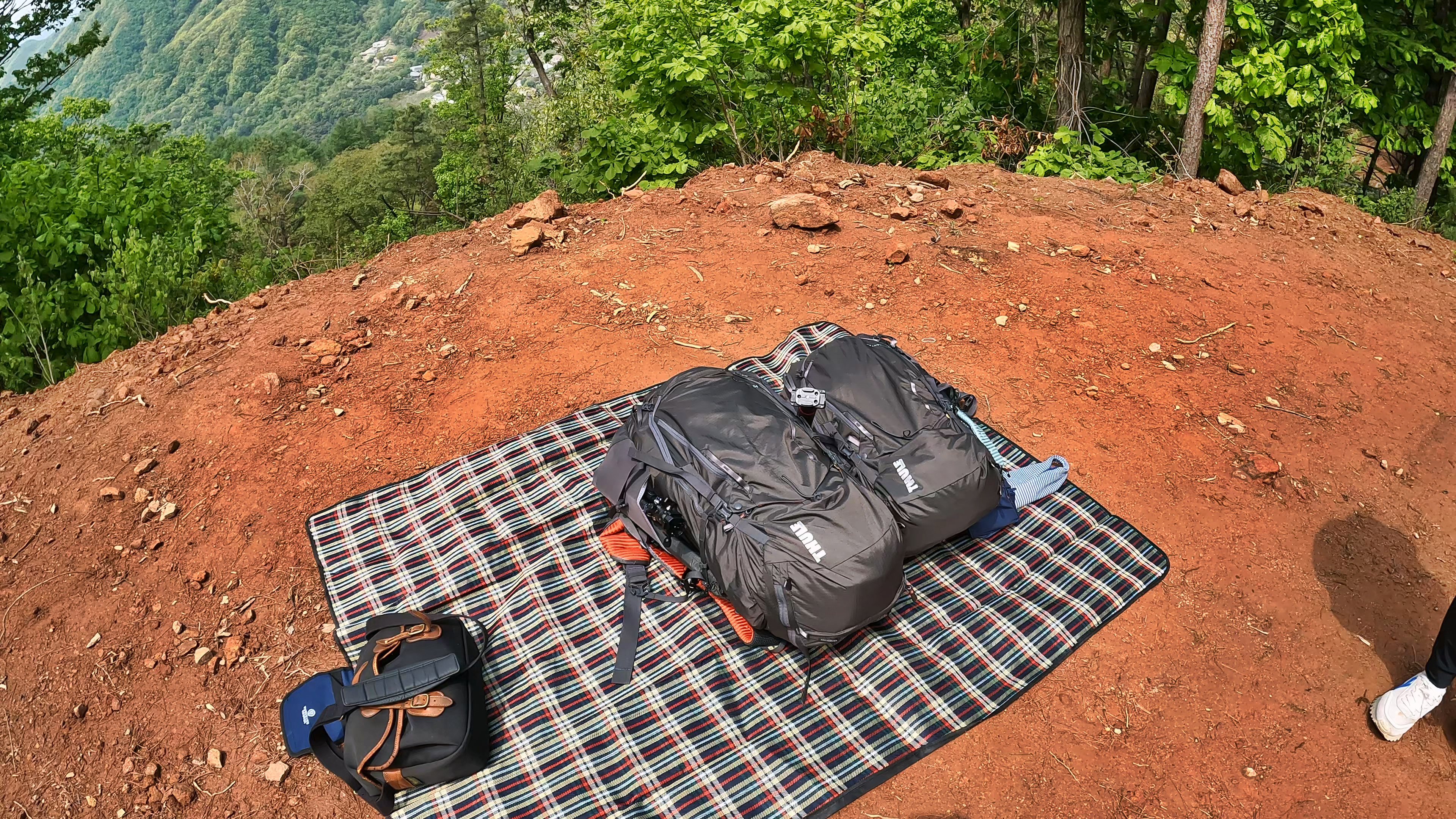 돗자리에 배낭 내려 놓고