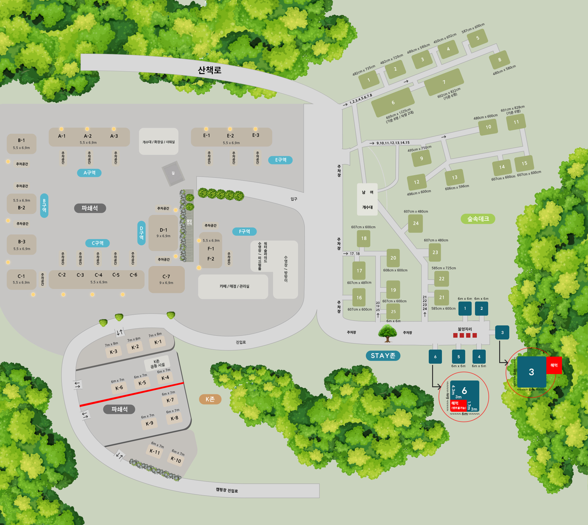 다음날 돌아다니면서 살펴본 결과, A~F구역은 오토캠핑 느낌이고, STAY 존으로 되어 있는 곳은 짐을 옮겨야 하는 형태이긴 하나 숲속 휴양림 느낌으로 캠핑을 할 수 있는 곳이었다. 이 곳은 구역별로 느낌이 워낙 달라 구역별로 한 번씩 와도 될 법해 보인다.