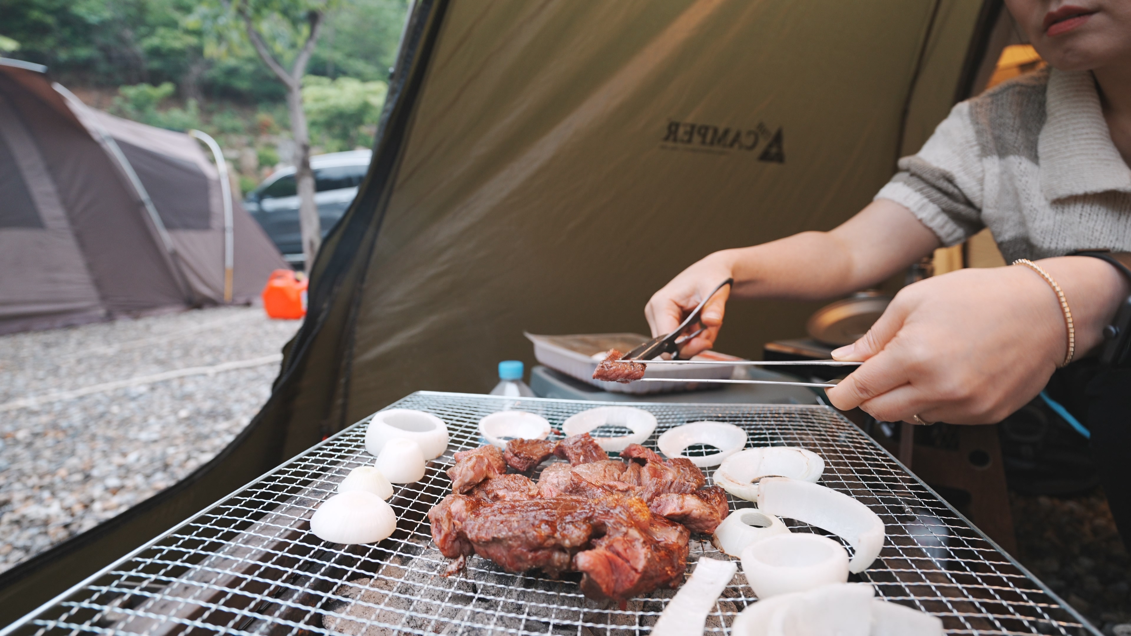 아이들에게 먹일 고기 굽느라 정신이 없다.