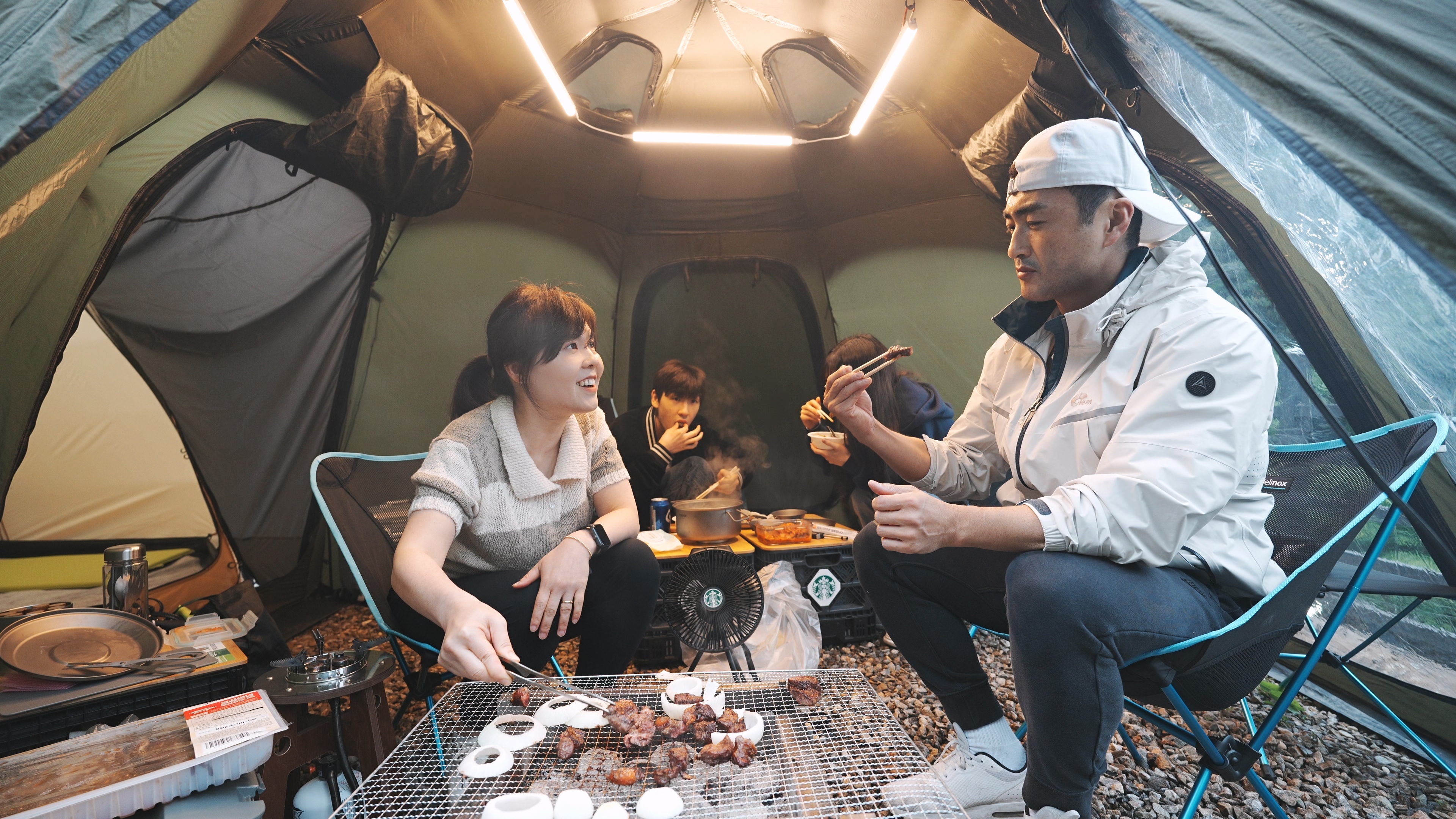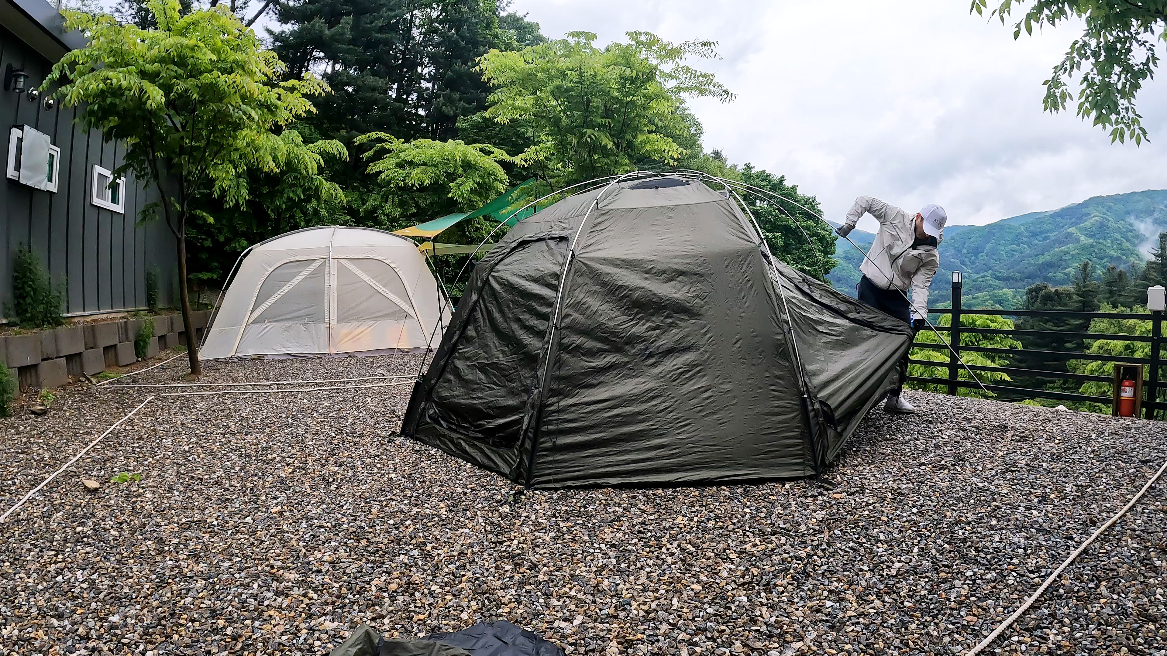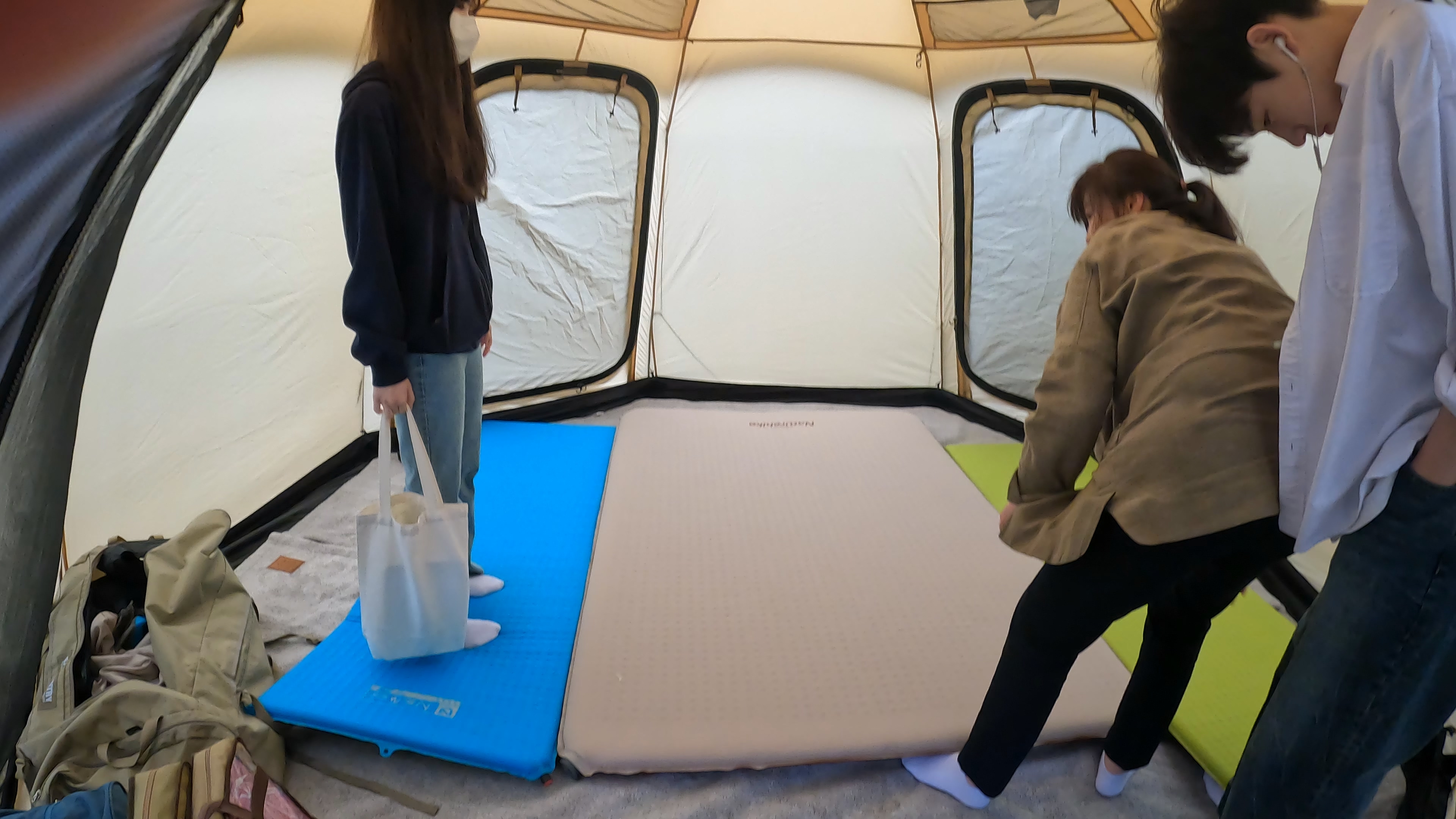 한 동은 좌식모드로 그라운드시트 + 러그 + 매트로 바닥공사를 하였다.
