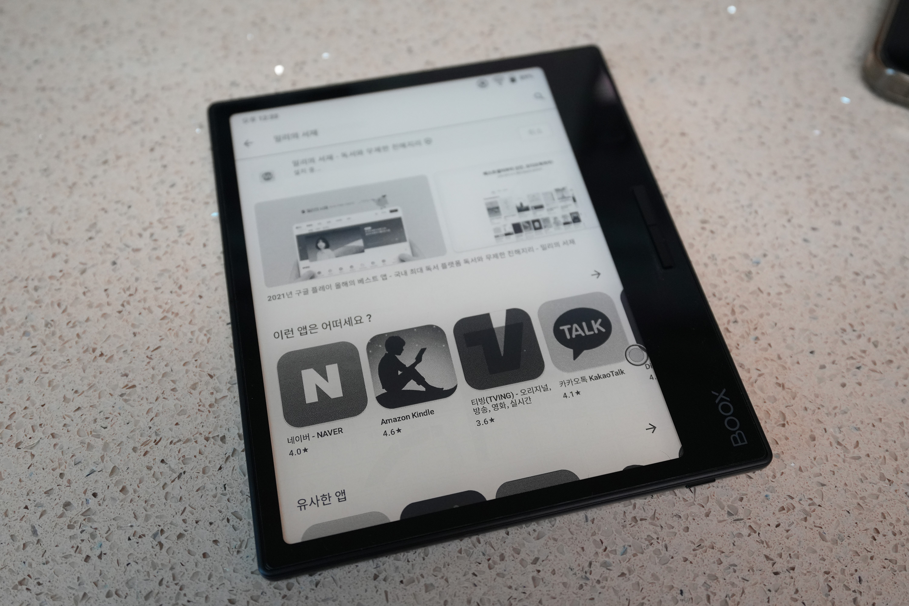 켜서 한글 선택하고 이것저것 세팅하니, 구글 플레이스토어가 있어 거기서 바로 밀리의 서재 앱을 깔아본다. 구글 비밀번호가 아주 복잡해서 한 땀 한땀 키보드로 치는게 힘들었다.