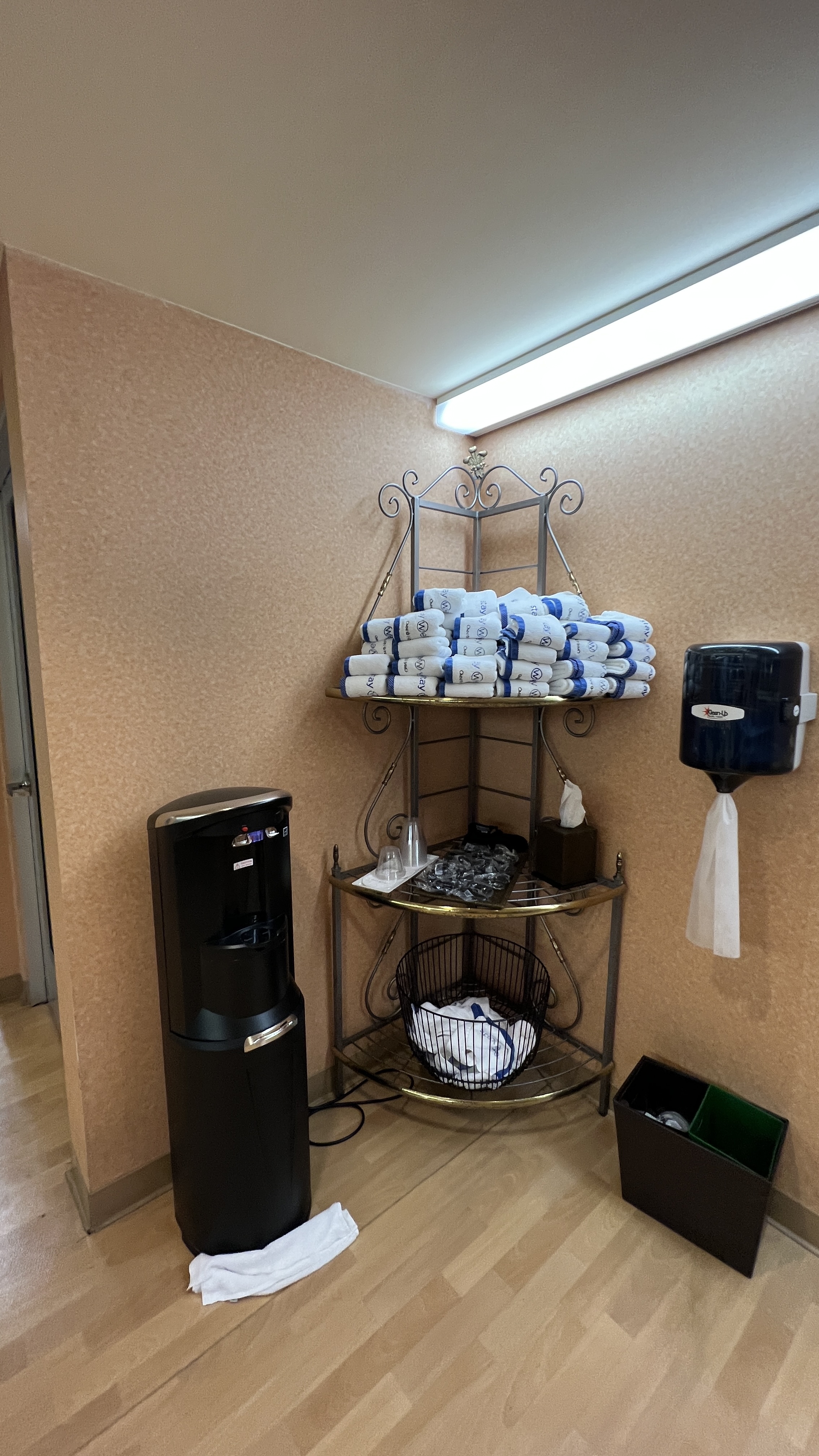 희한하게 생긴 정수기가 있고, 수건제공. 특이하게 트레드밀에 연결될 것 같은 이어폰도 제공되었다. 미국 헬스장 가면 대부분 있는 뽑아 쓰는 세정티슈도 제공.