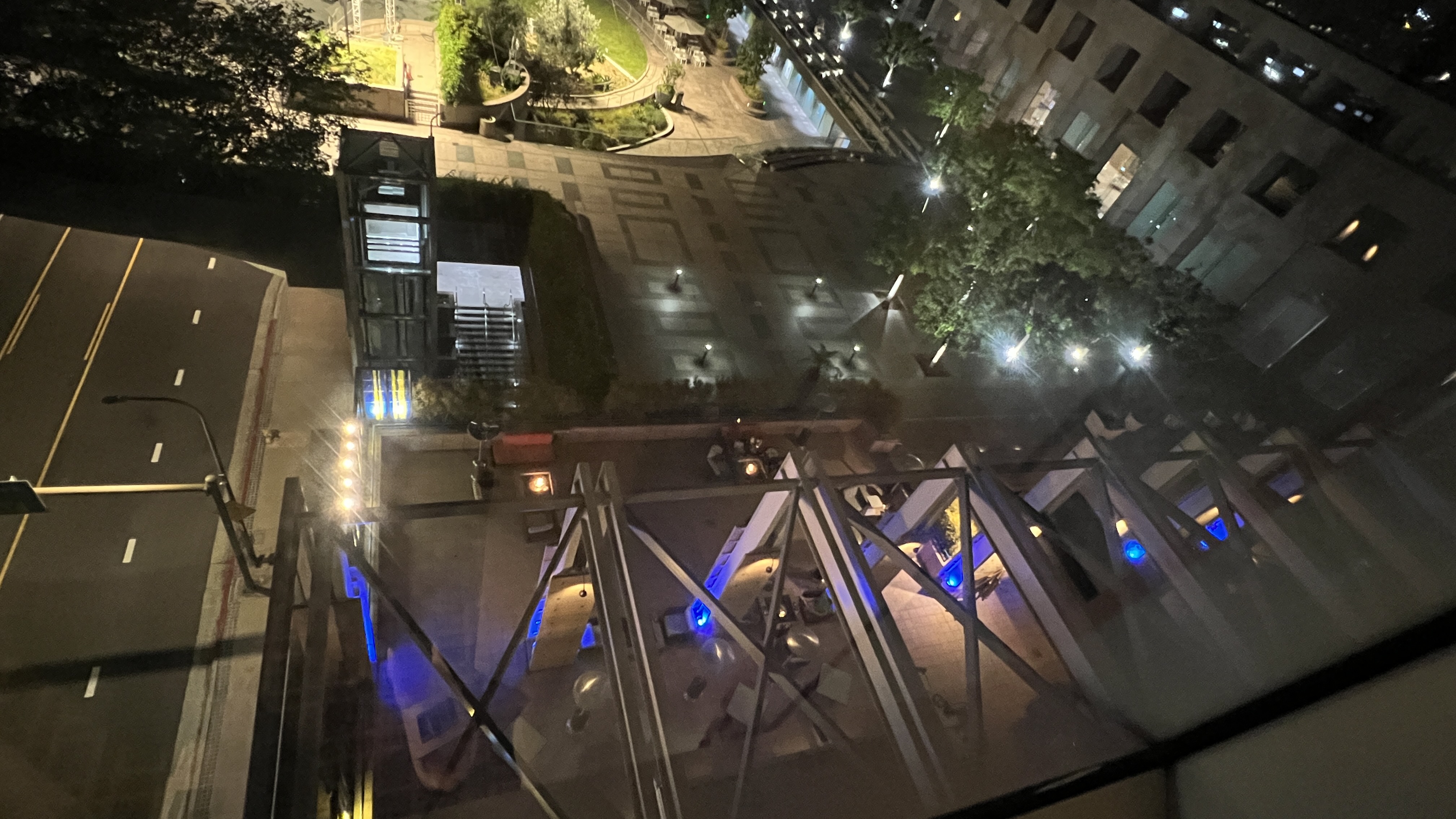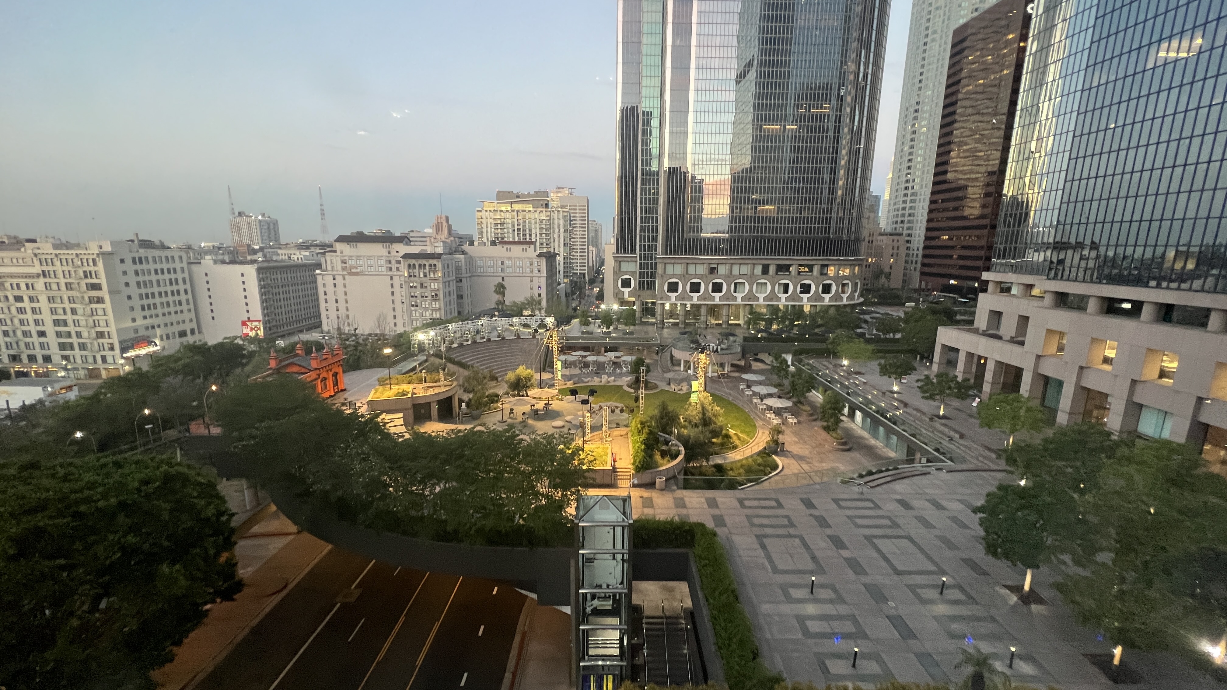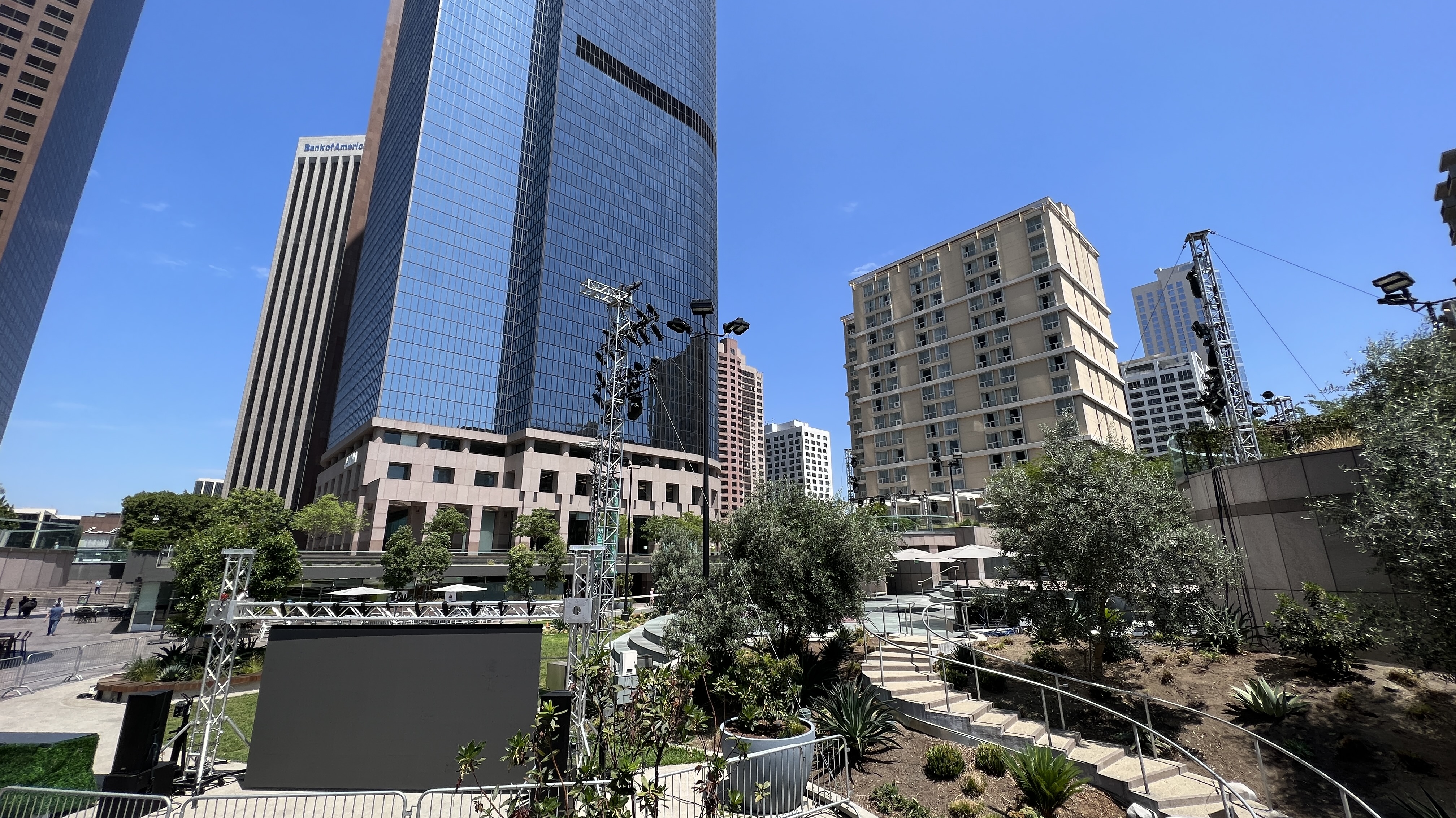 호텔 룸에서 내려다 보이는 광장 (one california plaza). 호텔 3층의 바와 연결되고, 사진 좌측에 빨간색 매표소가 라라랜드에 나왔다는 Angels Flight Railway.