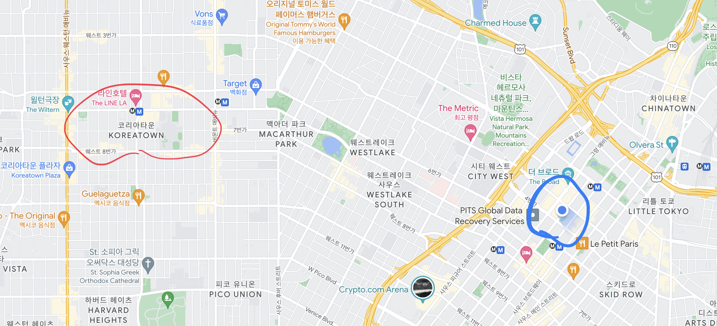 위치는 한인타운에서 차로 10분 정도 거리 (빨간색이 코리아타운, 파란색이 호텔)이다. 다운타운이라 교통이 좀 복잡한 구역이고 높은 건물이 좀 많은 곳에 위치해 있다.