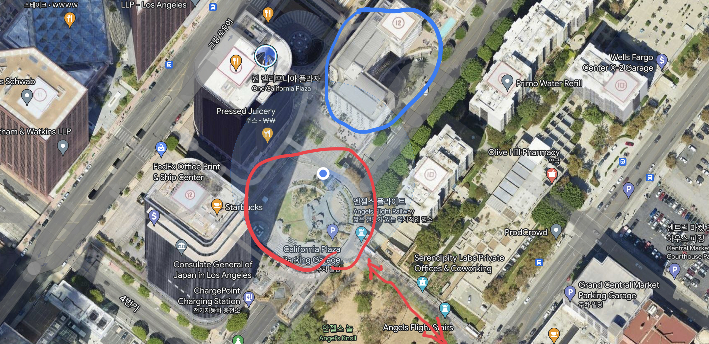 투숙하고 나서 알게된 것인데, 호텔 (위 사진 파란영역)앞이 큰 광장(위 사진 빨간부분) 이 있어서 시간나면 광장 의자에 앉아 여유를 즐길수도 있고, 그리고 라라랜드에 나온 미니열차를 탈수 있는 곳(빨간화살표부분, Angels Flight Railway) 이 바로 앞에 있었다. 그리고 그 곳 건너편에는 그랜드 센트랄마켓이 있어 간단한 식사를 하기 좋은 곳이다.