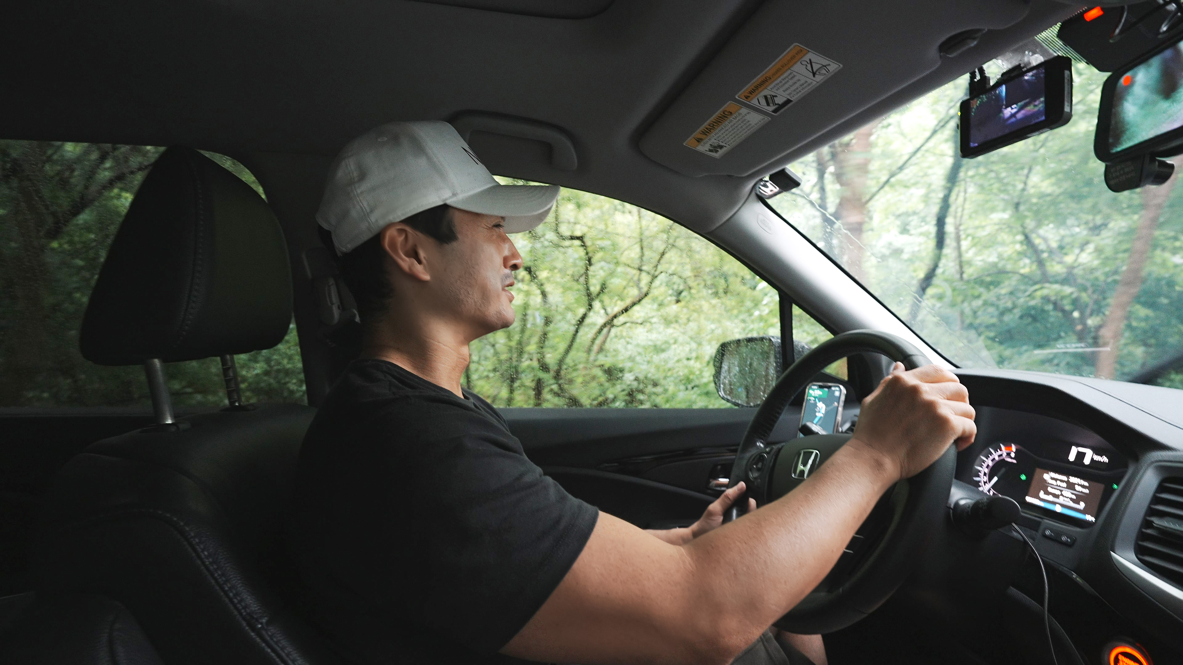 유튜브 촬영을 위한 카메라 설치 중. 비가 오는 관계로 우산을 씌우는 와이프의 모습과 그 모습을 귀엽게 지켜보는 나.