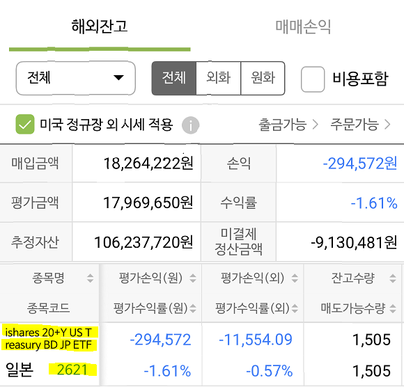 여하튼 나는 무작정 엔화로, 미국 채권을 천만원 단위로 나누어 사고 팔기 시작했다. 감사하게도 나의 외화(엔화) 예수금이 늘고 있다. 사고 팔고를 몇차례 했더니 아래와 같이 마이너스로 표기되나, 실제는 두차례 수익 실현(+삼십여만원)으로 그렇게 보일 뿐이다. 엔화 입장에서 총알은 아직도 엄청나게 남아 있다. 투자에 관심을 끄지 않는 것이 성공의 지름길인 것 같다.
