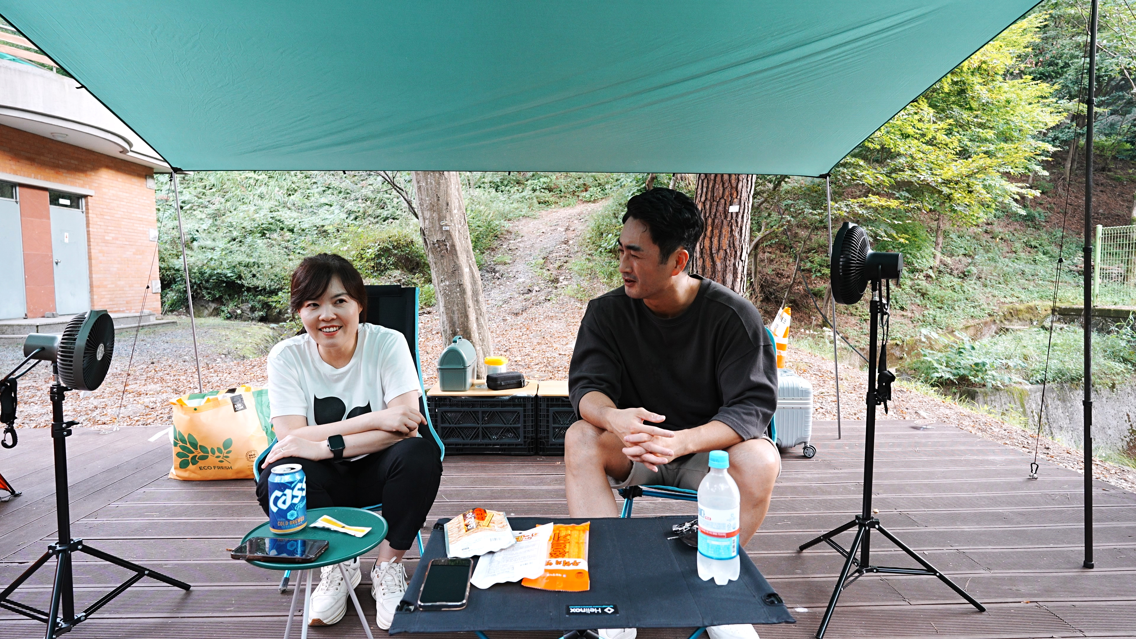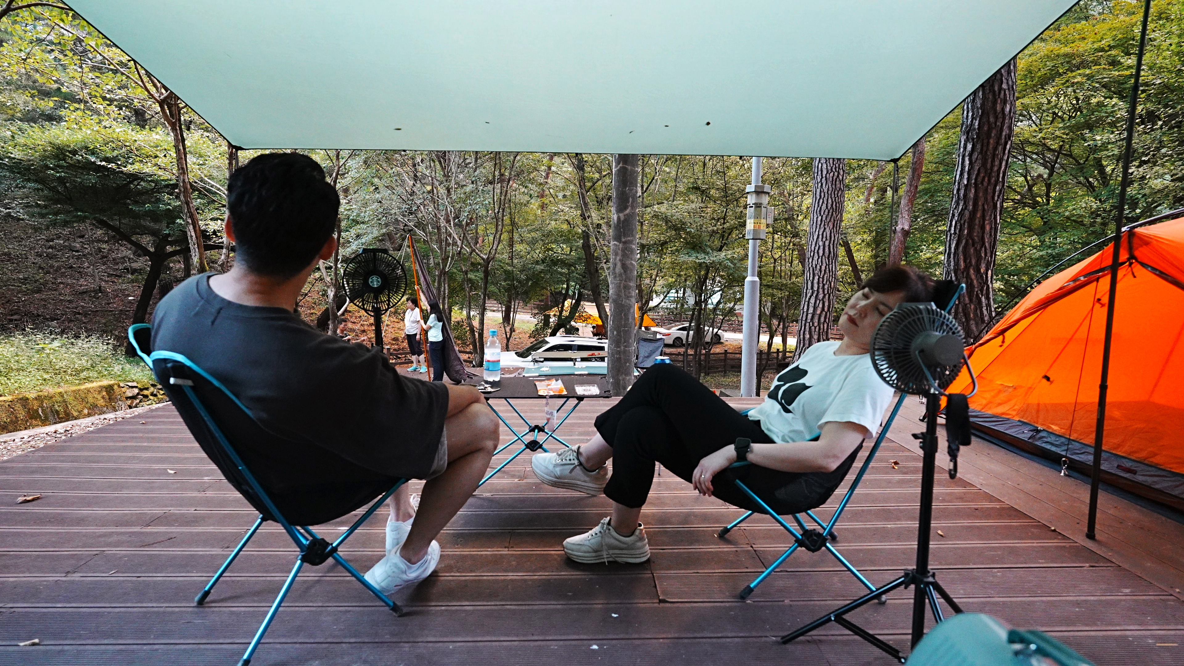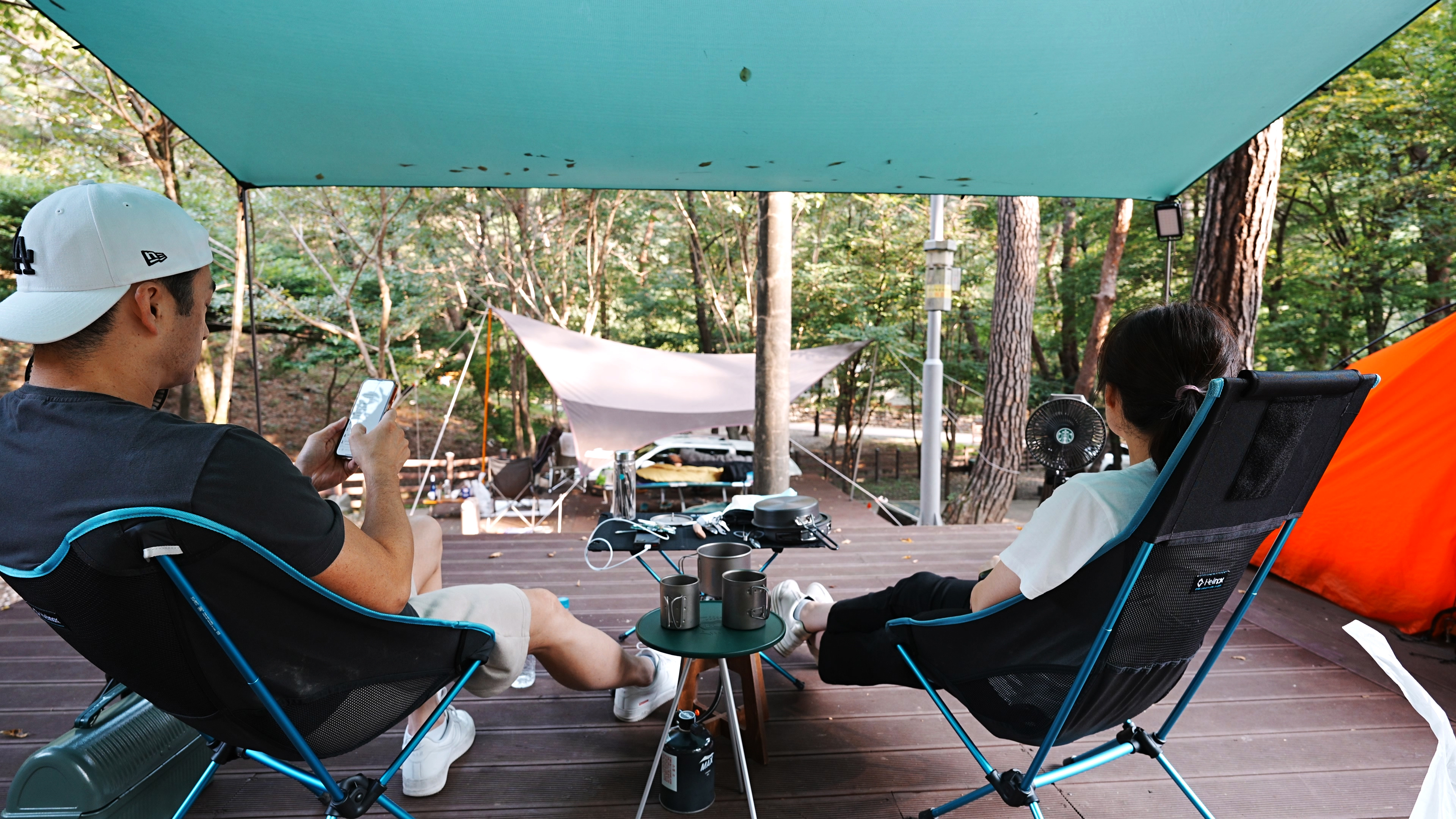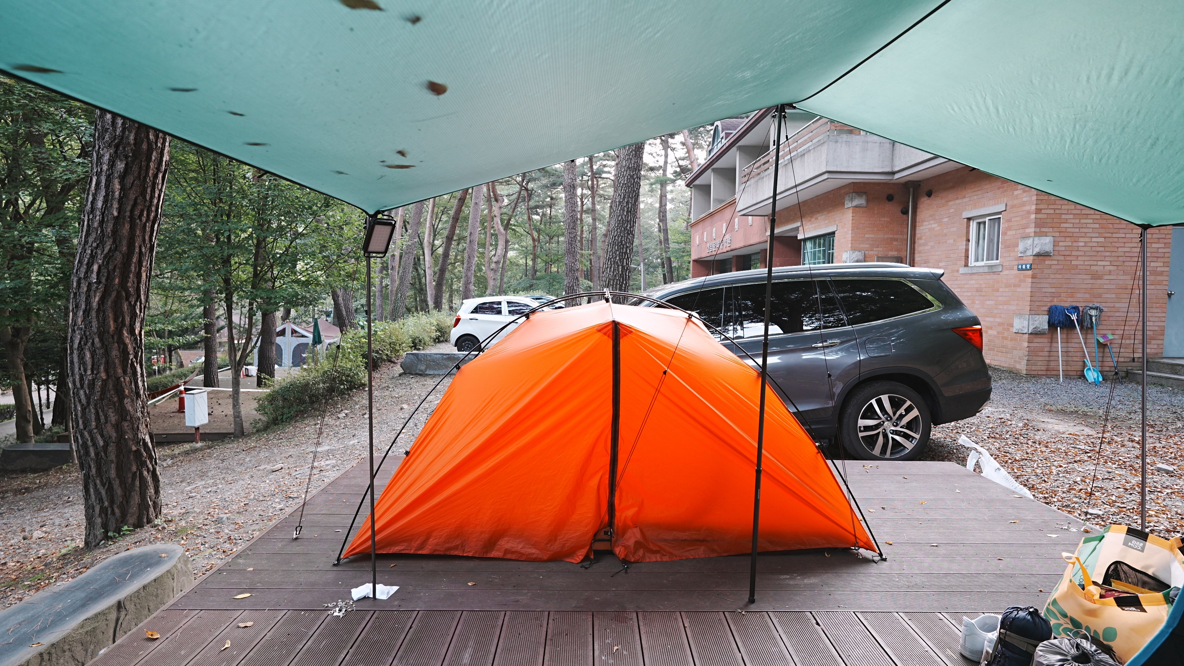 텐트 설치 끝. 휴양림임에도 불구하고 데크 사이즈는 4M * 6M 로 제법 넉넉하고, 차를 옆에 댈수 있는게 장점이다.