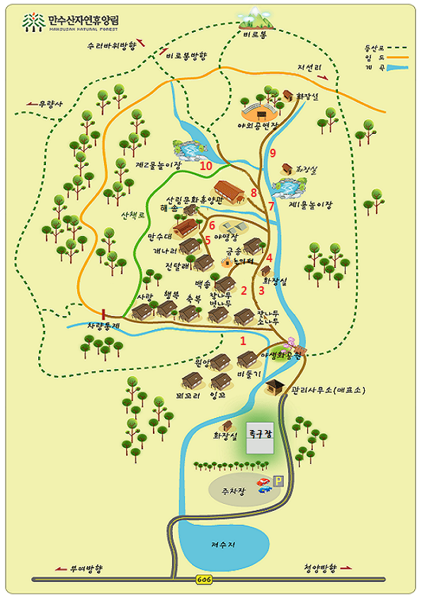 만수산 자연휴양림 배치도. 휴양림 가기전에 지도를 잘 보고 가야 하는데, 항상 제대로 알아보지 않아서 산책로가 많이 있는데도 못 찾아서 후회하는 경우가 종종 있다.
