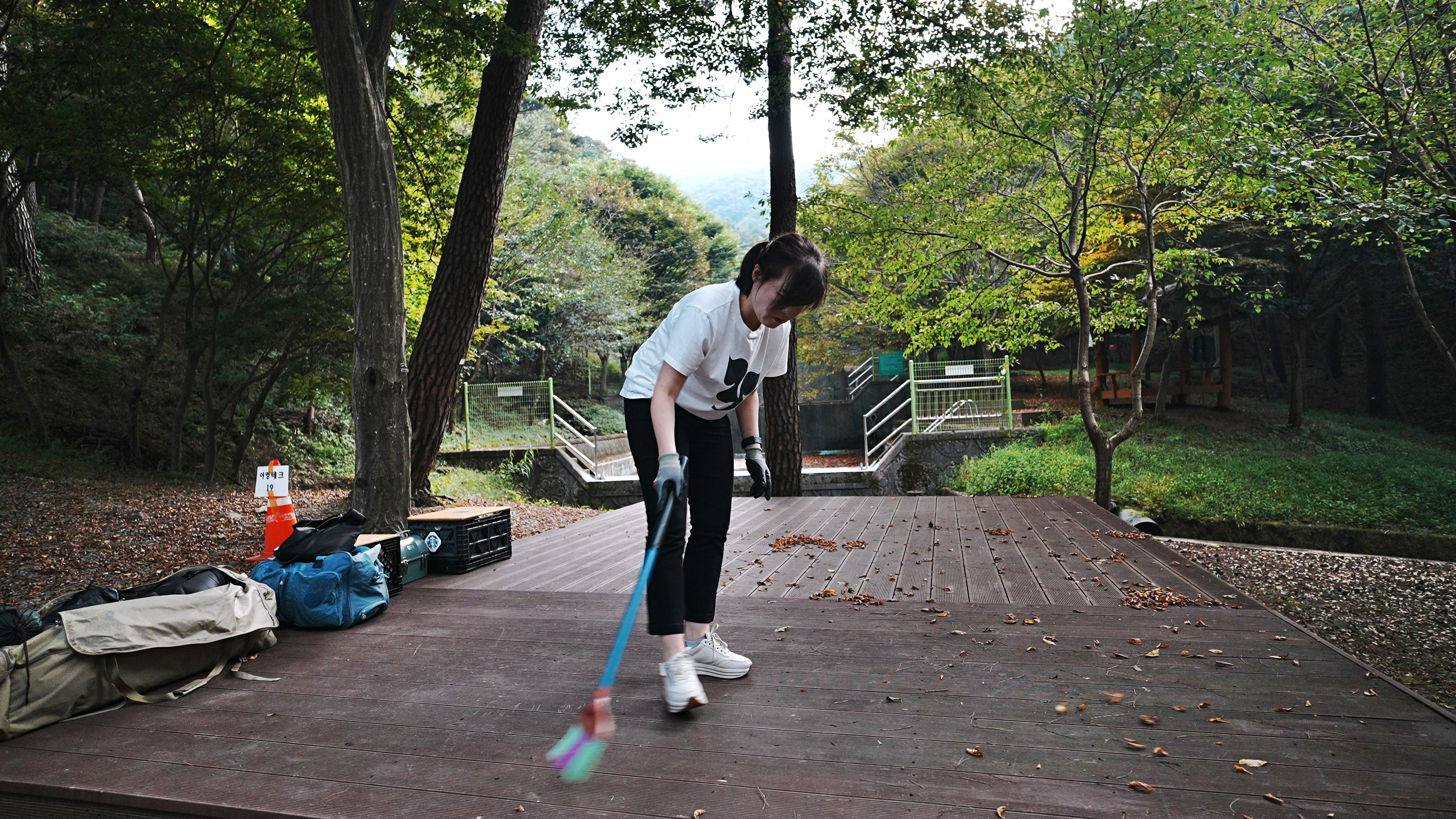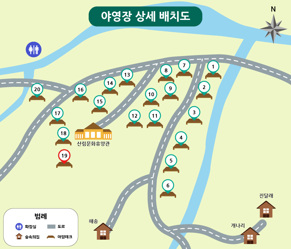1박2일 캠핑할 자리는 19번 데크. 만수산 자연휴양림의 최고 명당은 독립적으로 혼자 있는 20번 데크라고 하는데, 다녀와본 결과 19번도 꽤 좋은 자리였다.