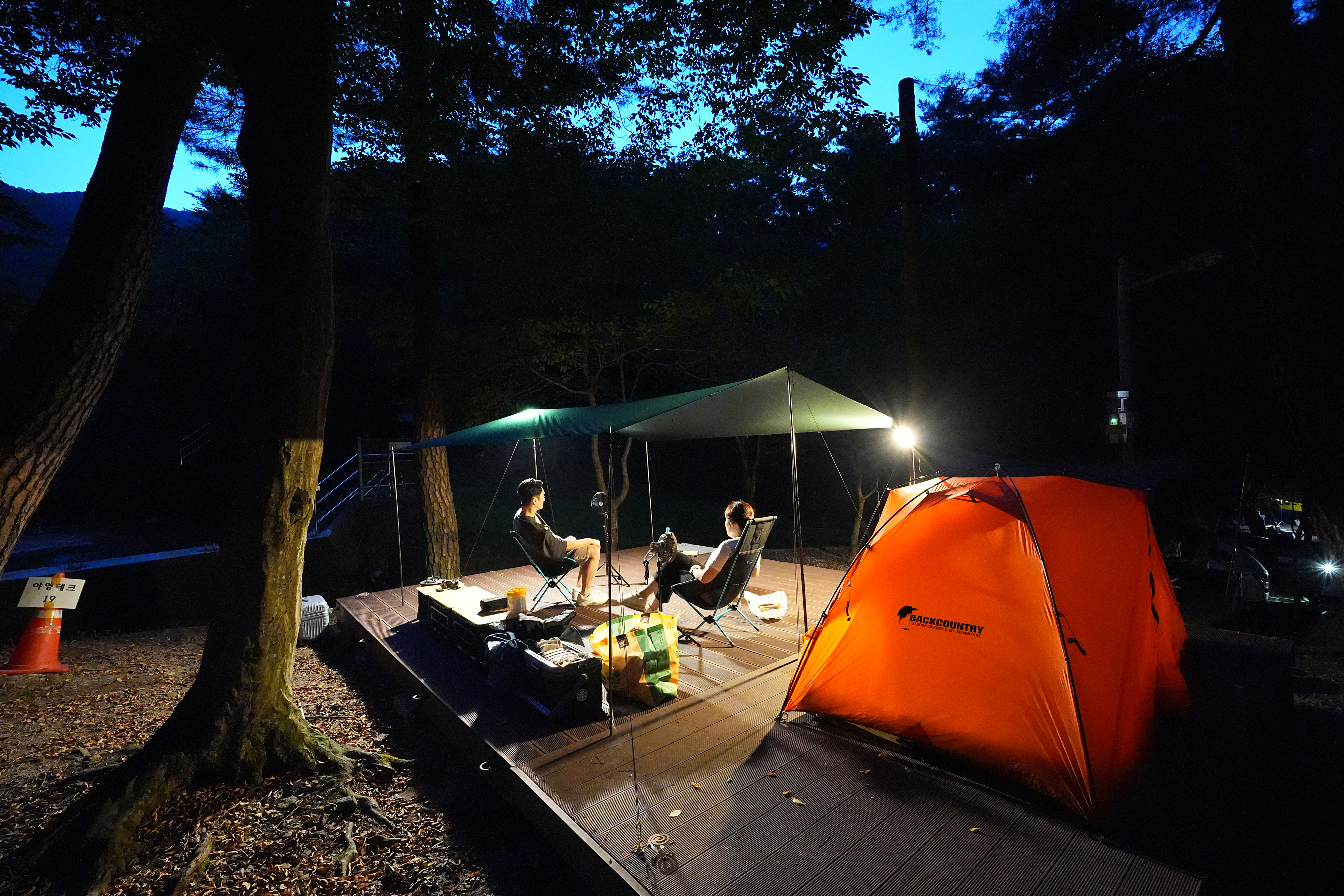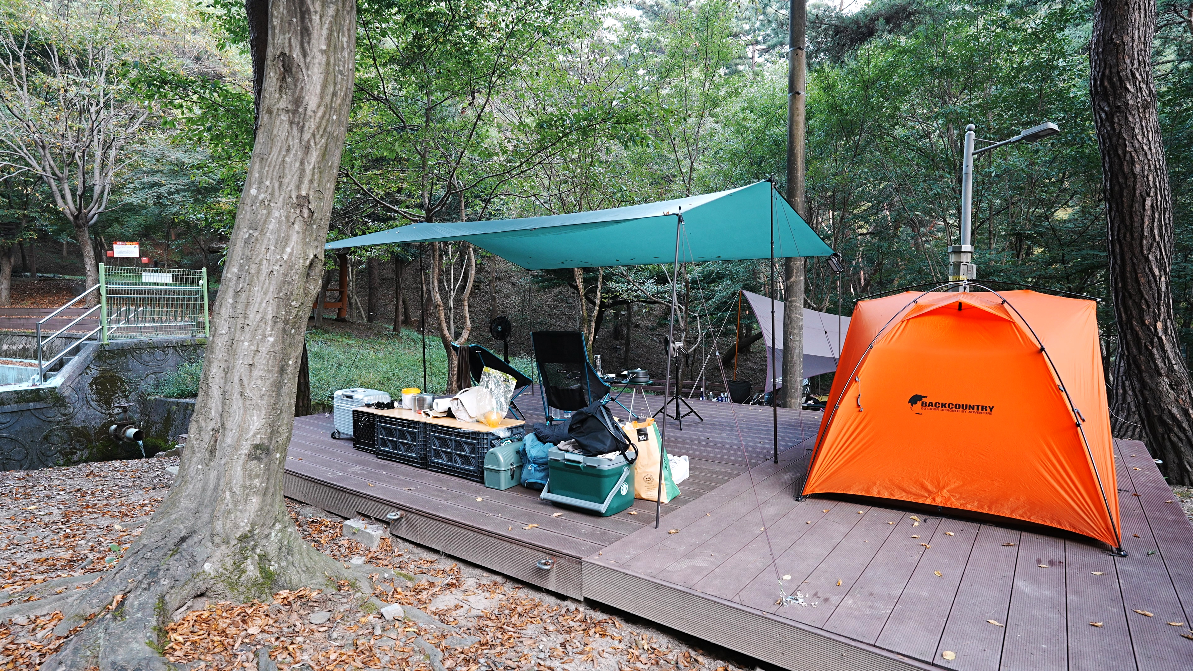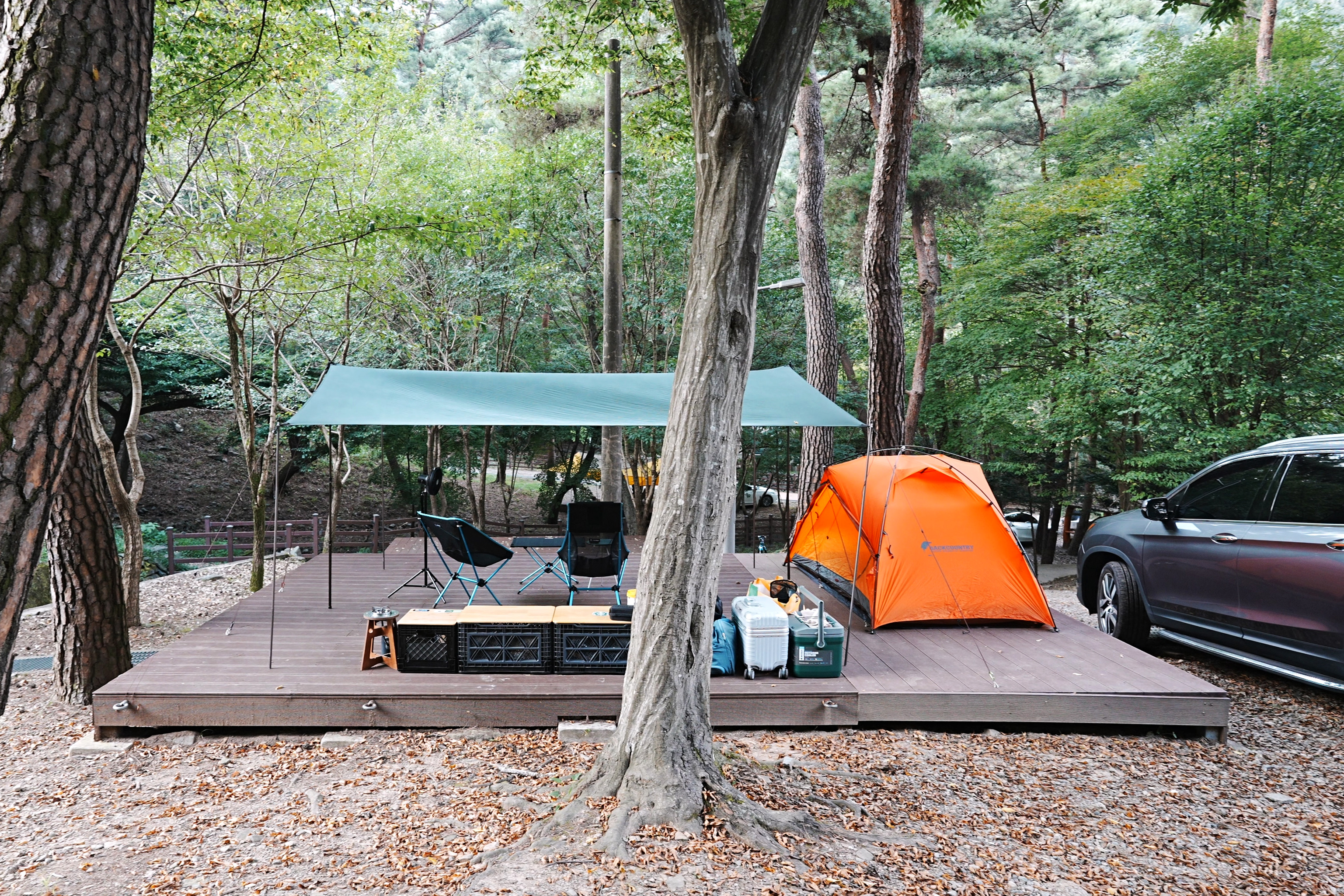 텐트 설치 끝. 휴양림임에도 불구하고 데크 사이즈는 4M * 6M 로 제법 넉넉하고, 차를 옆에 댈수 있는게 장점이다.