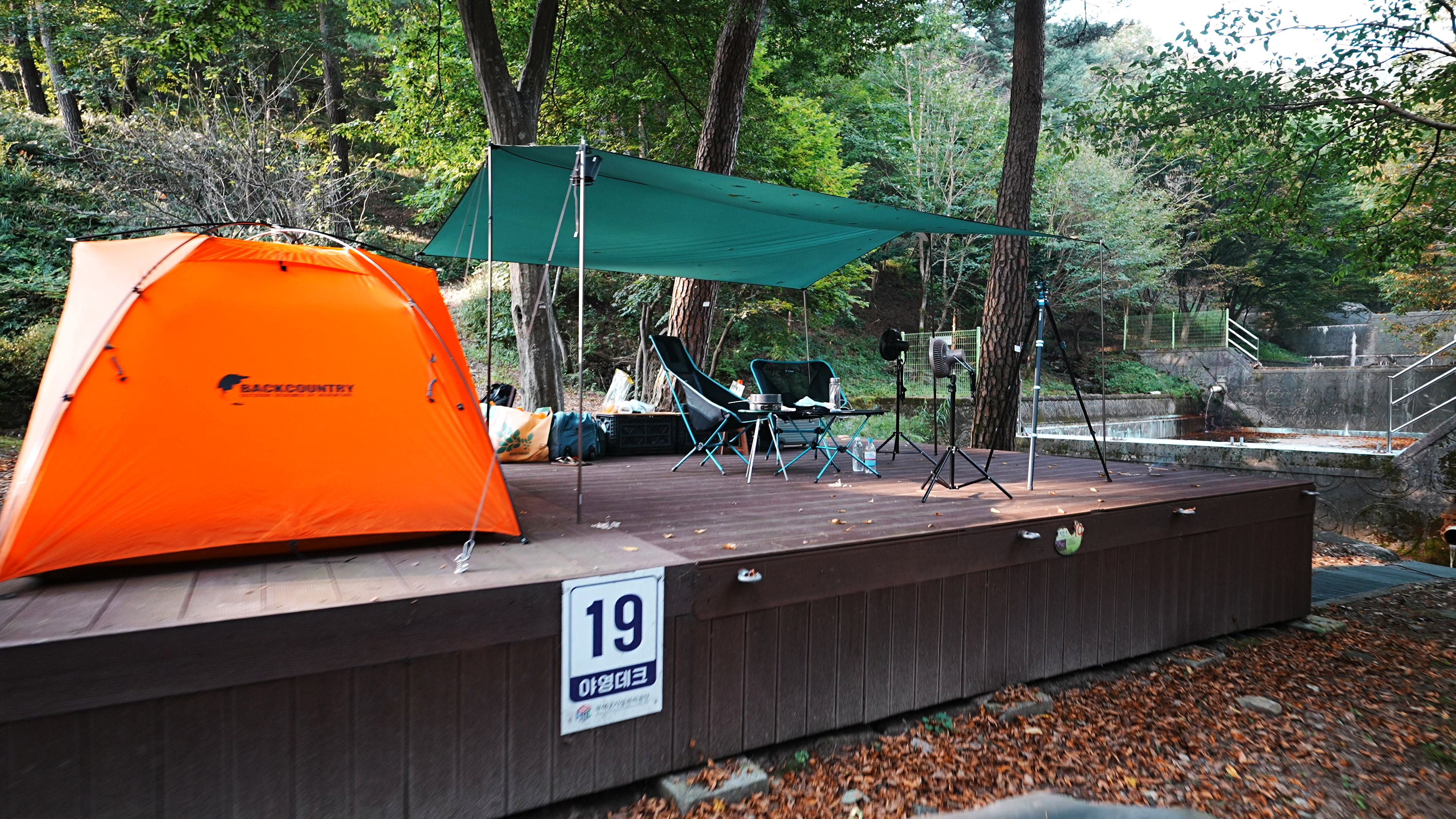 1박2일 캠핑할 자리는 19번 데크. 만수산 자연휴양림의 최고 명당은 독립적으로 혼자 있는 20번 데크라고 하는데, 다녀와본 결과 19번도 꽤 좋은 자리였다.