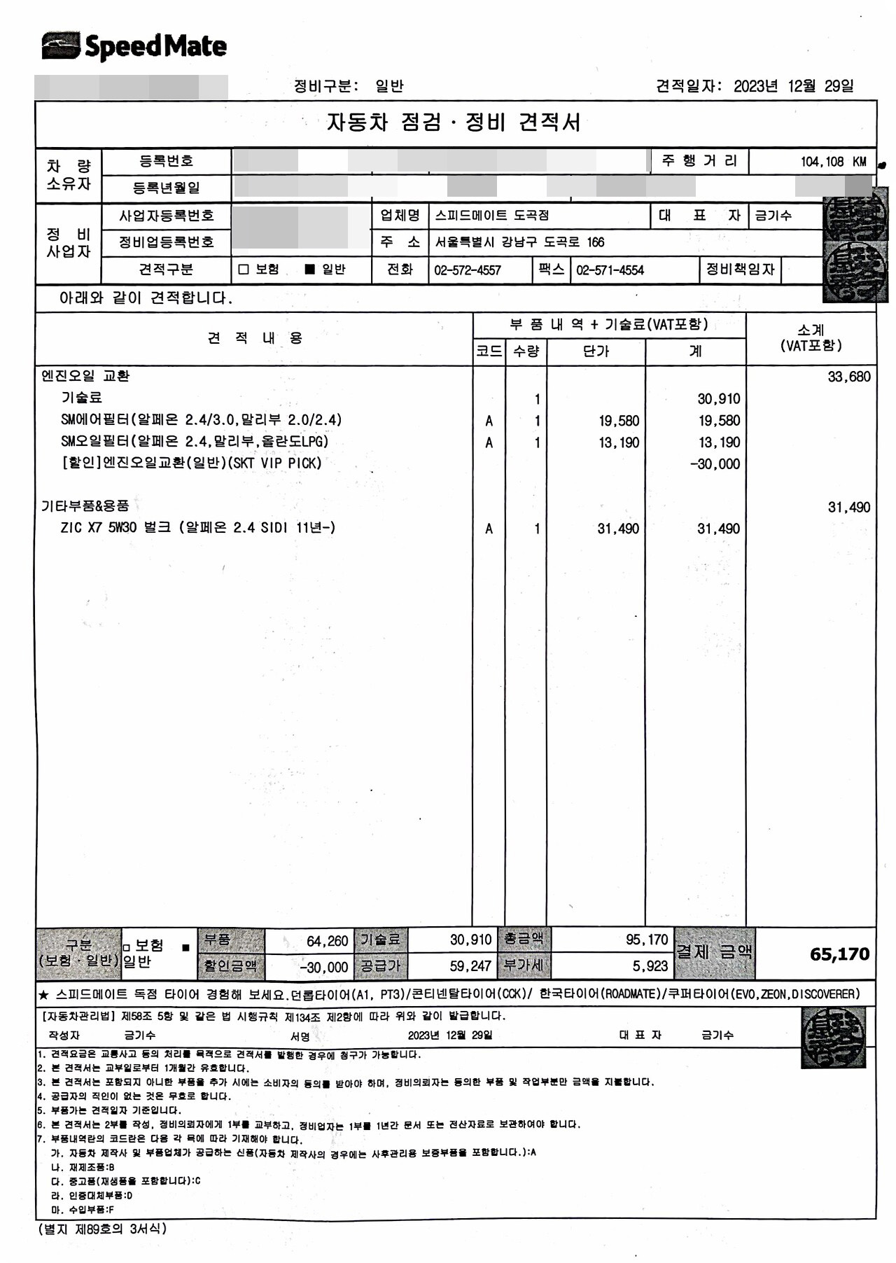 이 쿠폰을 적용하기 위해서 speedmate.com 에서 정비예약을 하니, 현장결제하면서 쿠폰 3만원을 적용한 금액 과 온라인 예약 금액이 크게 차이 나지 않아 보인다.