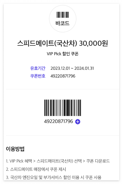사용하고 있는 통신사 SKT의 멤버쉽에 차량관련 서비스가 있겠거니 해서 찾아보니 매월 하나씩 고를수 있는 VIP Pick 이라는 혜택중 스피드메이트 엔진오일 할인권이 있다.