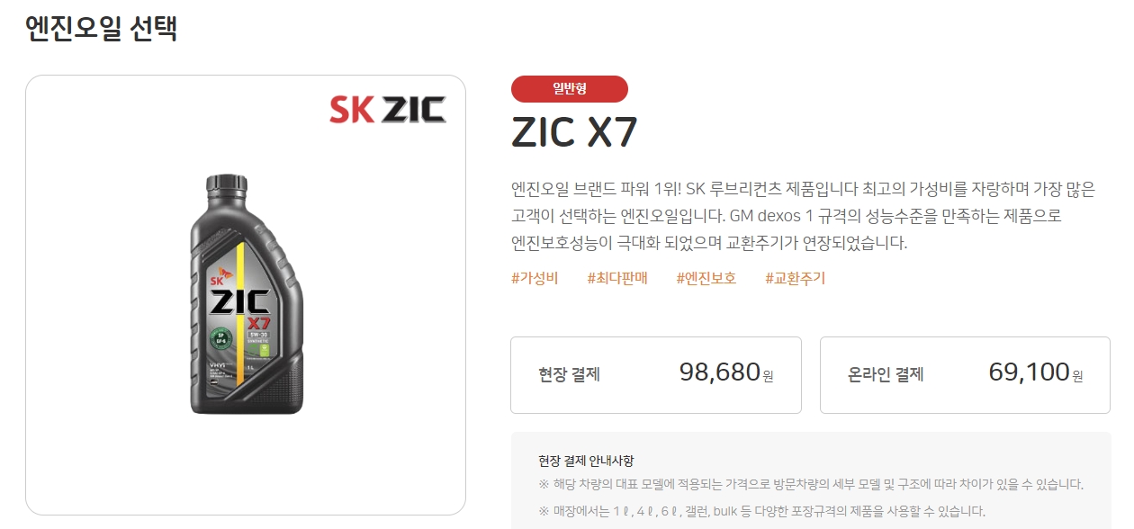 홈페이지에서 예약시 ZIC X7 이라는 엔진오일이 떠서 그걸로 예약을 하고 갔는데, '엔진오일 저렴한걸로 해드릴까요?' 라고 물어보는게, 예약은 예약이고 현장에서 이것저것 골라서 할 수 있는 걸로 보인다.