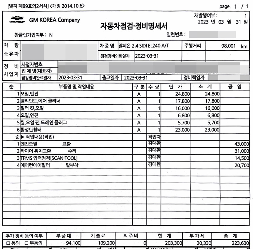 쉐보레 바로정비에서는 그것도 지점마다 공임비가 약간 차이나긴 하지만, 자주 찾는 정비소서는 위와 같이, 뭔가 알수 없는 것들이 덕지덕지 붙어서 20만원이 넘게 나오는 경우가 있었다. 대략 불필요한 것들 제외하고 엔진오일만 교환하게 되면 쉐보레 바로정비에서 15만원돈 나오는것 같은데, 생각보다 비싼 느낌이다.