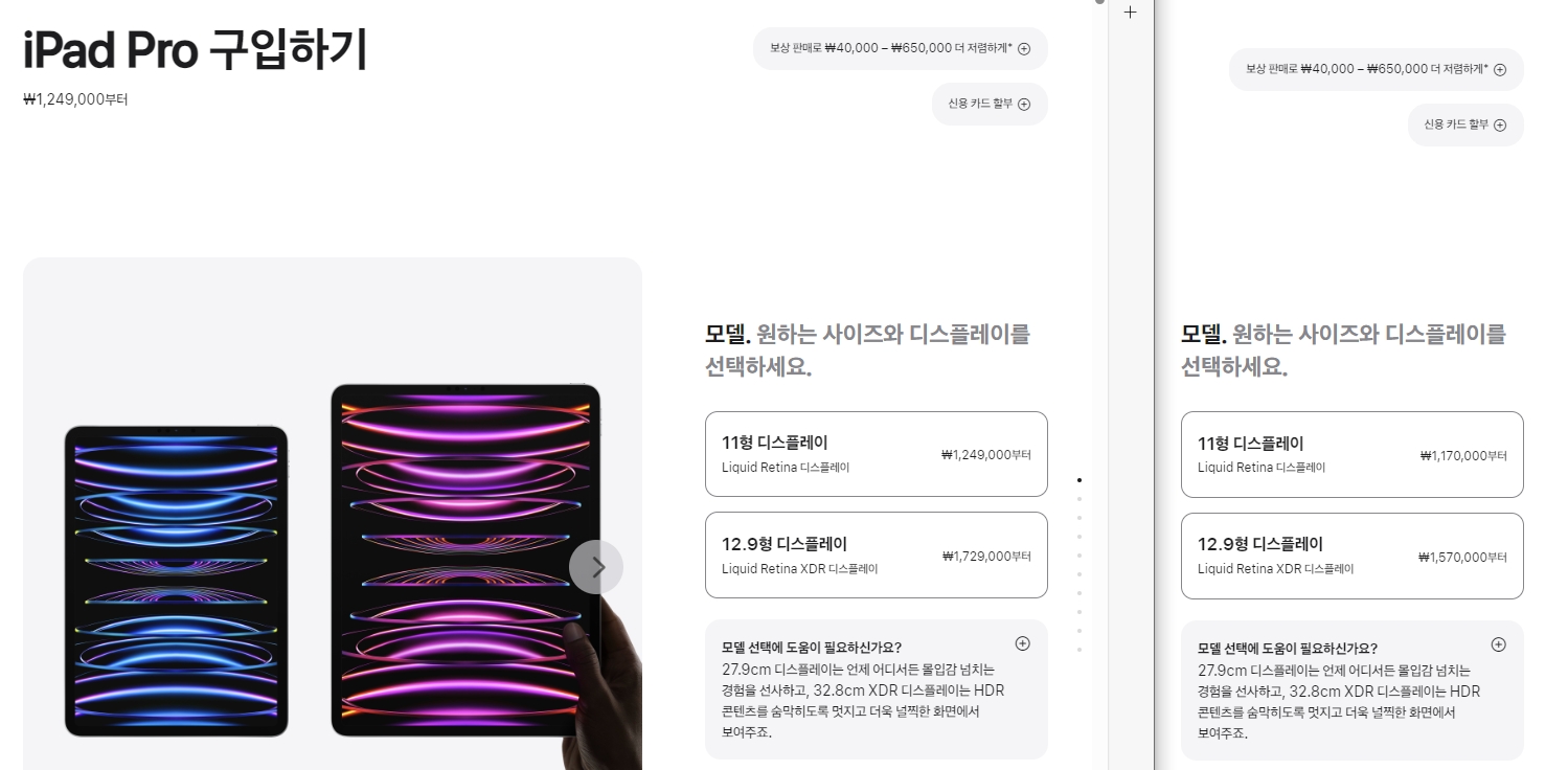 11인치 iPad Pro 256GB + 애플펜슬 정가 구매시 139.9 + 19.5 = 159.4만원이 공홈 가격이나, 132만원에 구매가 가능하니 약 27만원이 할인되는 셈