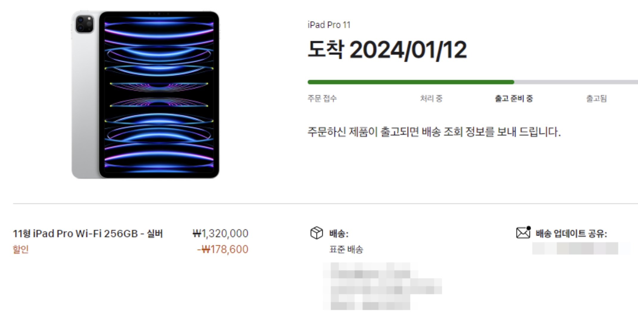 아이패드 프로 11인치 256GB WIFI 모델을 132만원에 애플펜슬 포함하여 교육할인으로 최종 구매하였고, 구매한 날로부터 이틀뒤 배송하는 걸로 안내되었다..