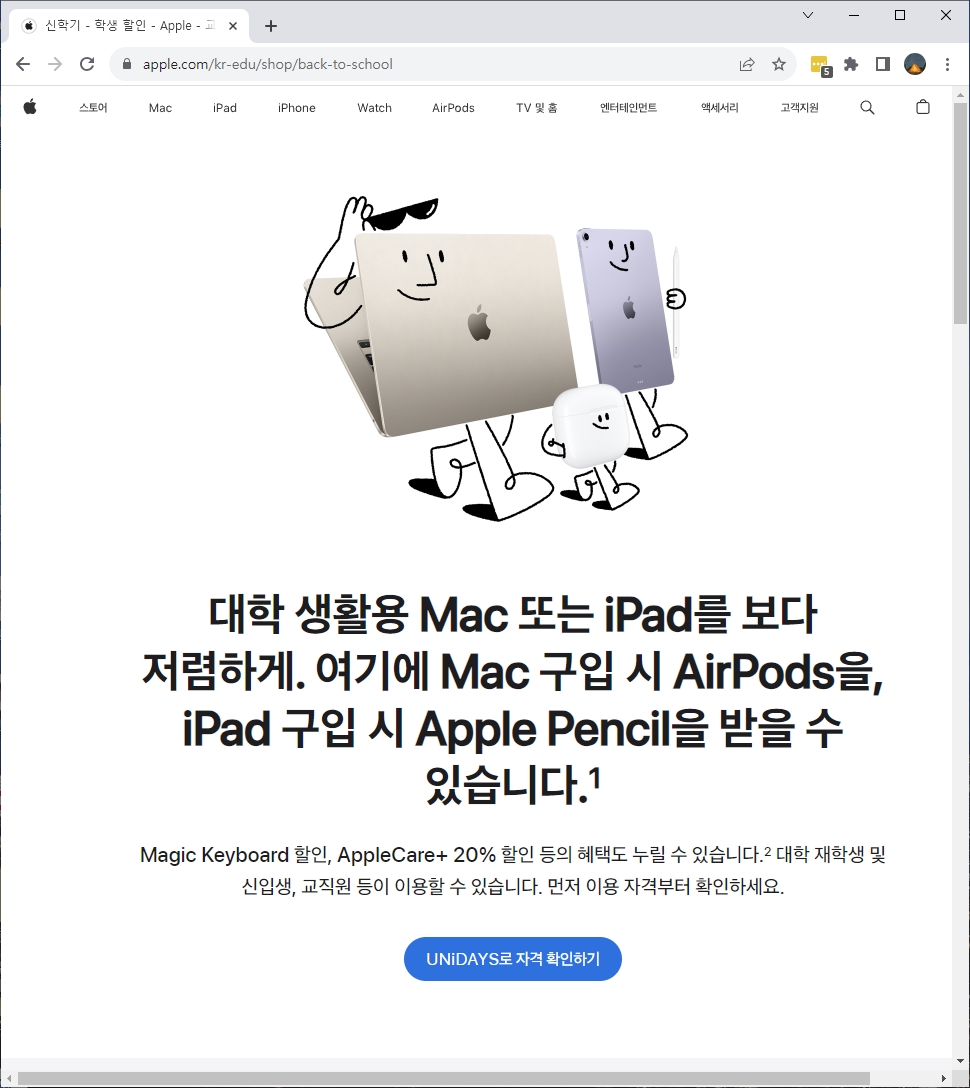 - 대학 재학생, 신입생, 교직원 등. 자격 확인은 공홈 이벤트 페이지에서 "unidays 로 자격 확인하기" 를 통해 인증을 거치면 할인 혜택으로 구매 가능