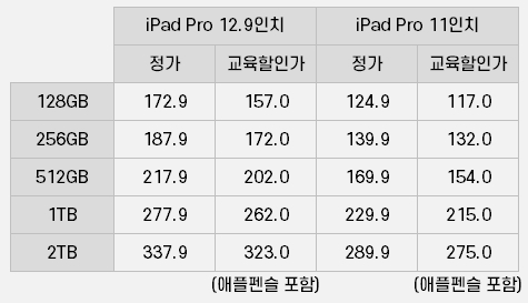 iPad 를 기준으로 정가와 교육할인가를 비교해보니, 대략 7~10% 할인된 가격으로 나오는데, 여기서 17.8만원의 애플 펜슬이 제공되는 것을 감안하면 상당히 많은 금액이 할인된 금액이다.