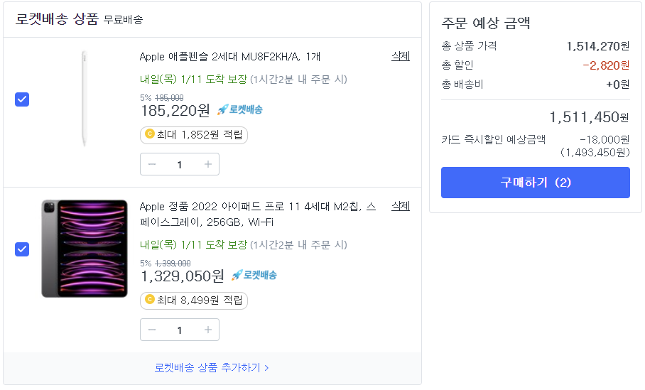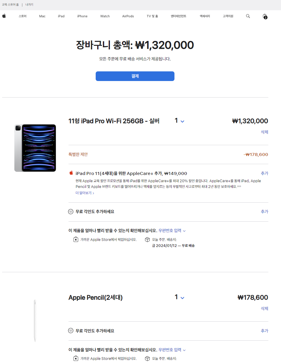 아이패드 프로 11인치 256GB WIFI 모델을 132만원에 애플펜슬 포함하여 교육할인으로 최종 구매하였고, 구매한 날로부터 이틀뒤 배송하는 걸로 안내되었다..