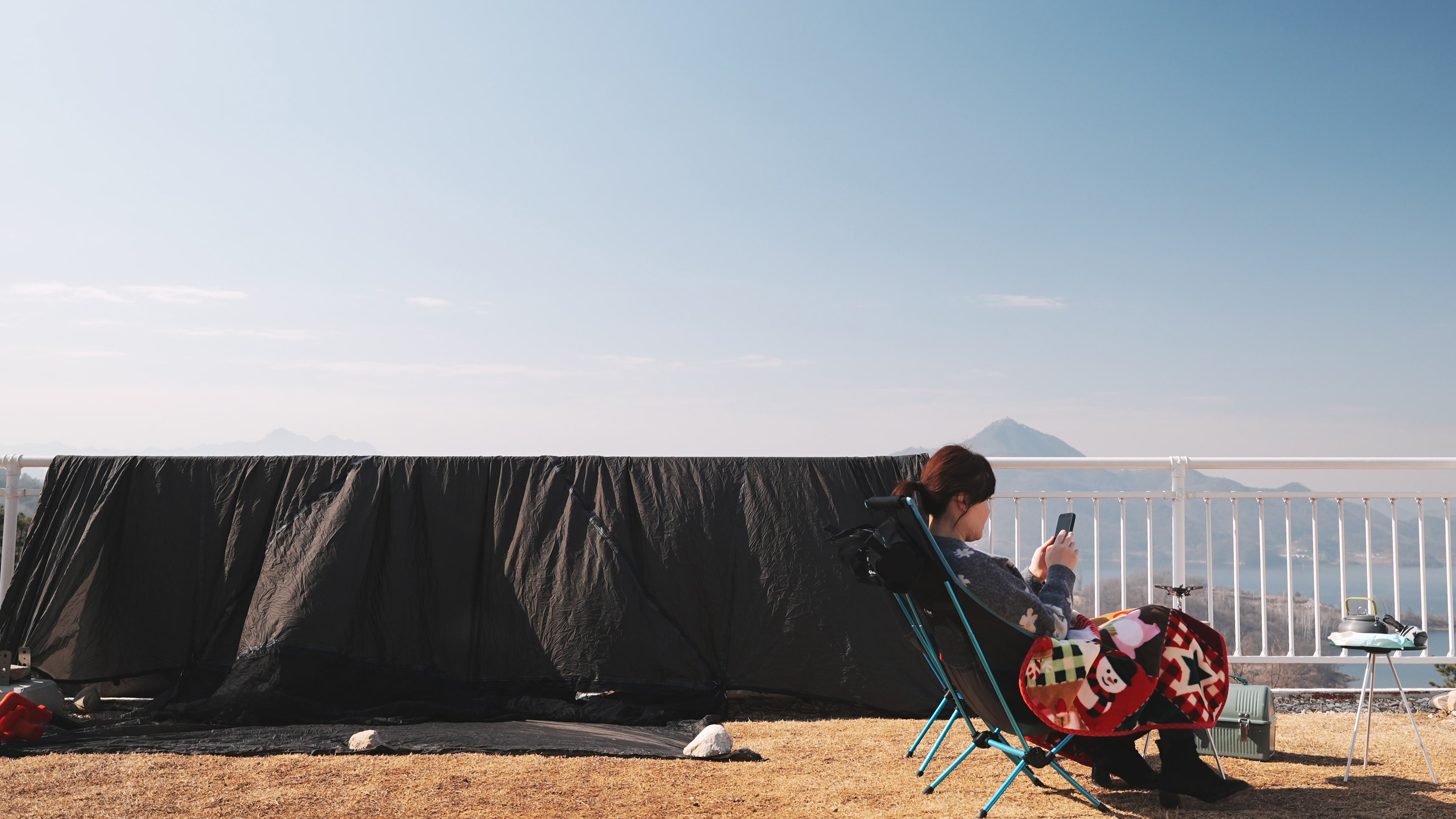 텐트에 결로가 생겨, 말리는 동안 좋은 경치와 함께 커피 한잔