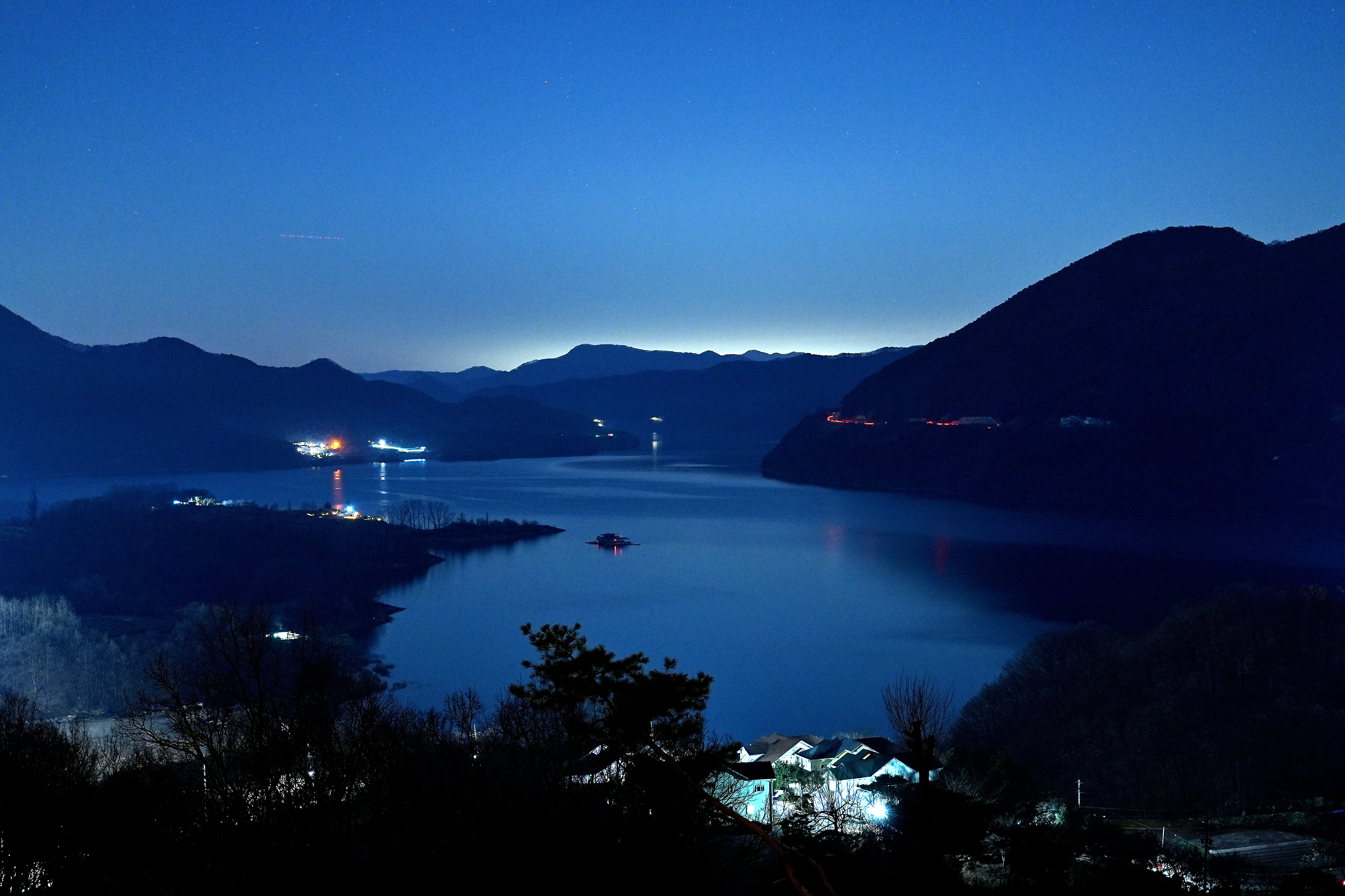 늦은 밤 청풍호 풍경. 아래쪽의 펜션쪽 불이 환하다.
