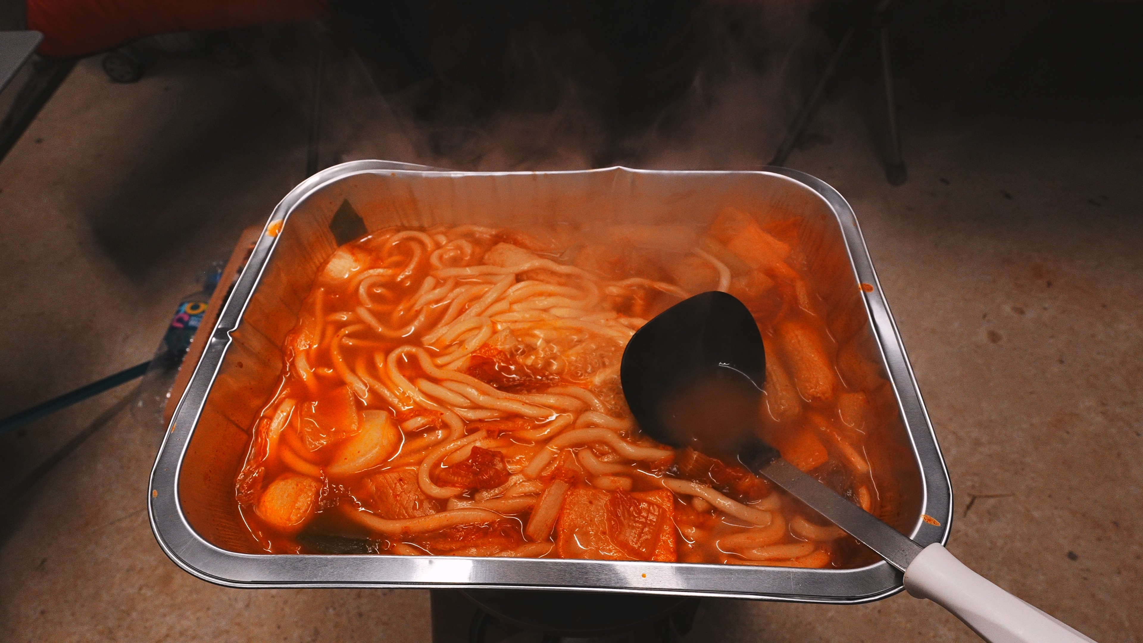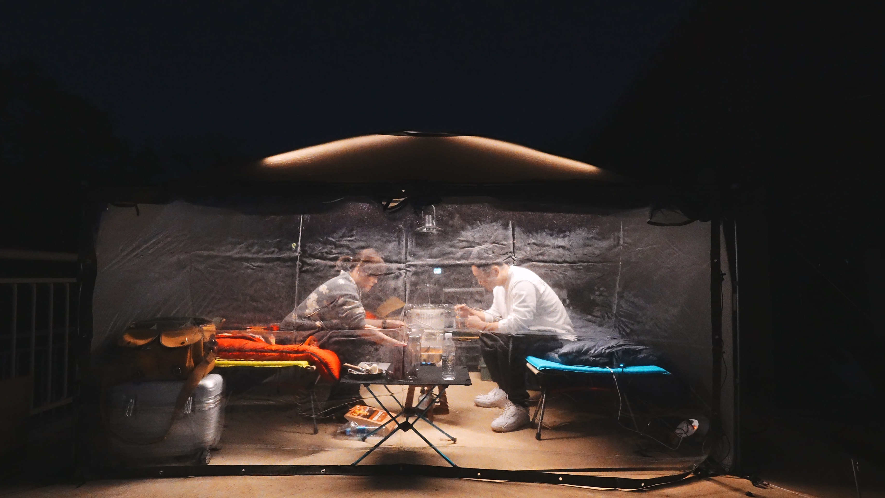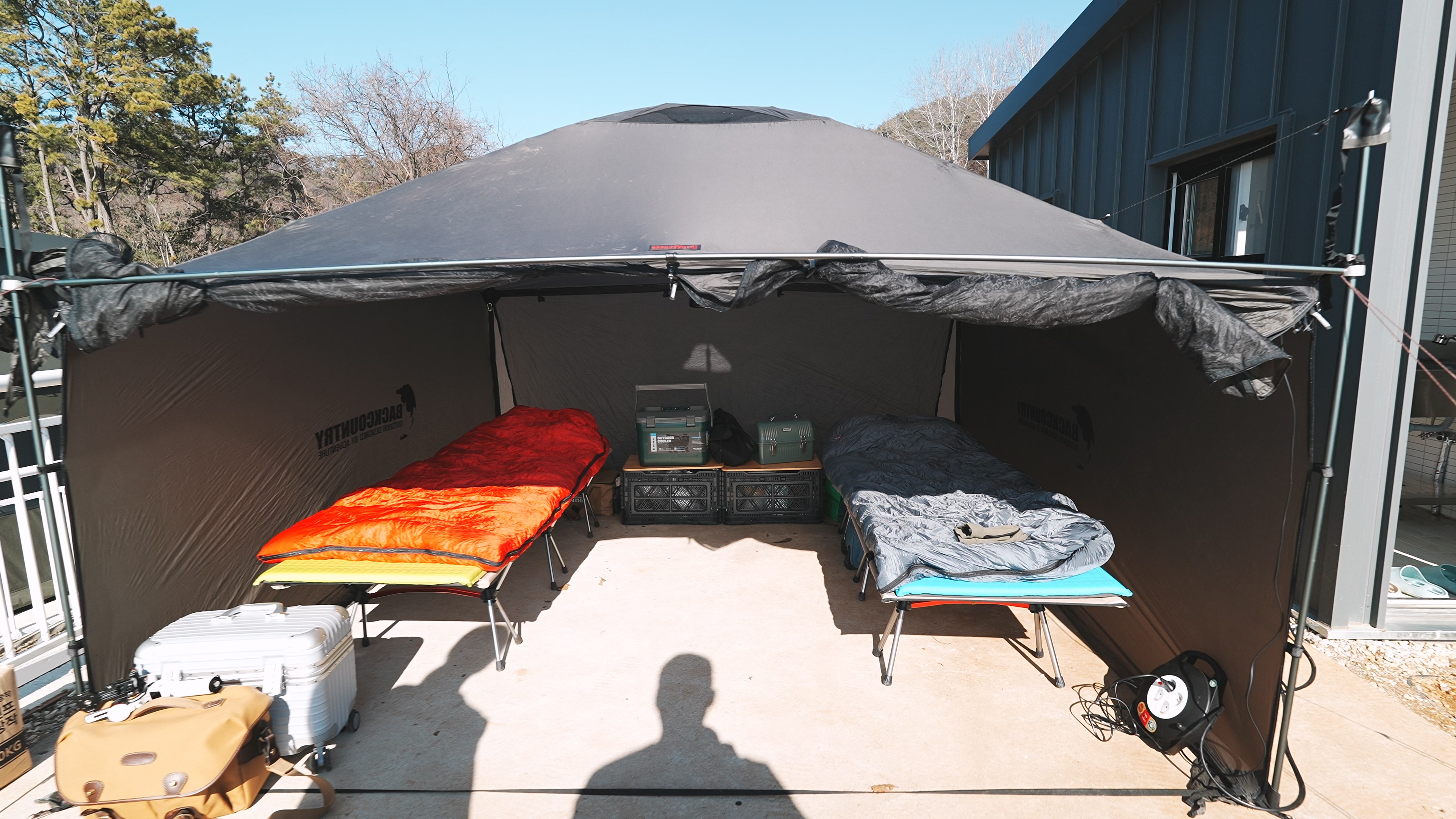 야전침대 2개와 함께 백컨트리 280 쉘터 입식으로 세팅. 콘크리트 바닥면에 텐트를 설치 하다 보니, 펙 다운 및 가이라인 설치가 여의치 않았다. 사장님께 얘기하면 드릴로 바닥에 구멍을 뚫어주시는 듯 했지만, 대충 주변 지형지물을 이용해서 설치하였다.