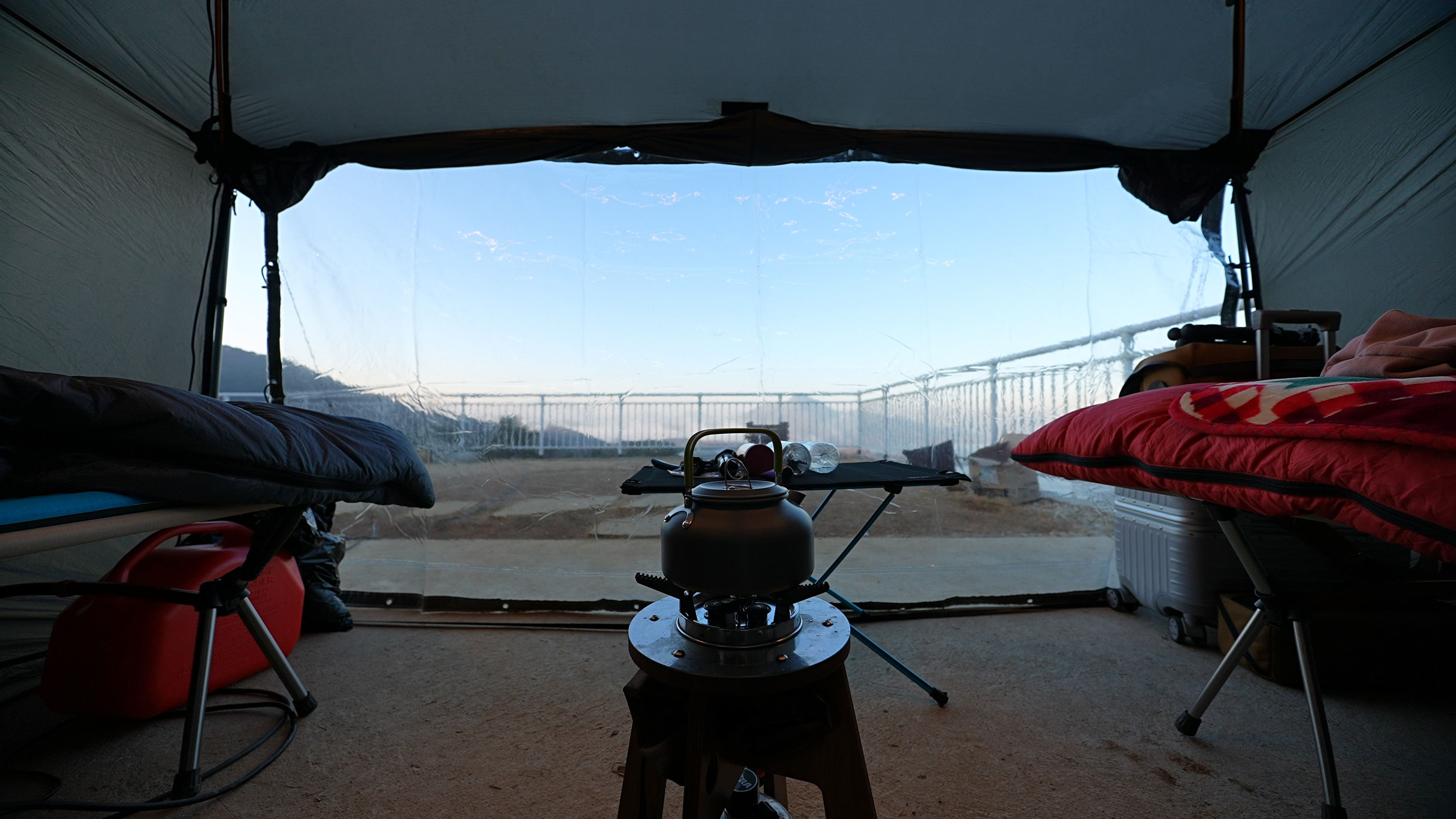야전침대 2개와 함께 백컨트리 280 쉘터 입식으로 세팅. 콘크리트 바닥면에 텐트를 설치 하다 보니, 펙 다운 및 가이라인 설치가 여의치 않았다. 사장님께 얘기하면 드릴로 바닥에 구멍을 뚫어주시는 듯 했지만, 대충 주변 지형지물을 이용해서 설치하였다.
