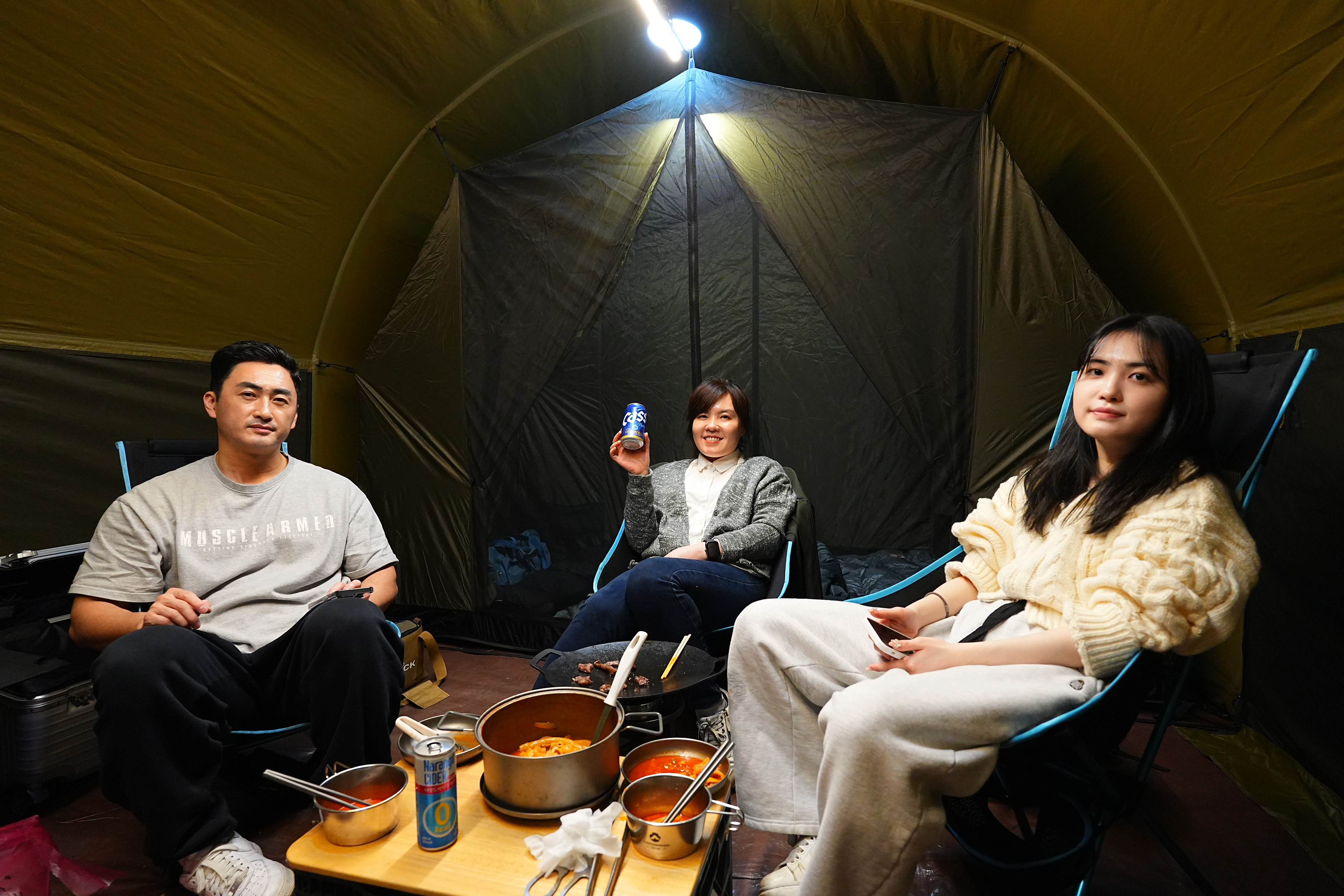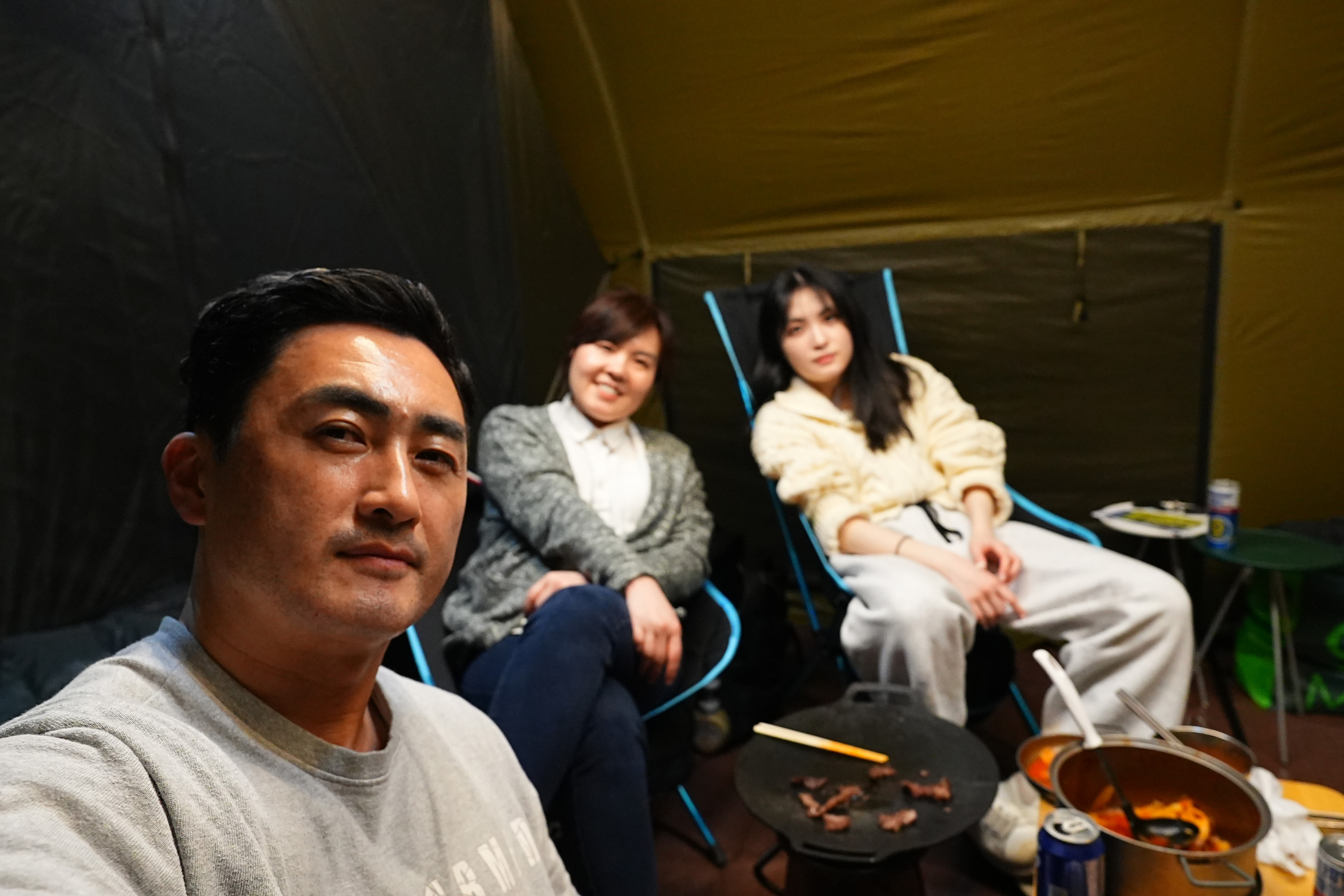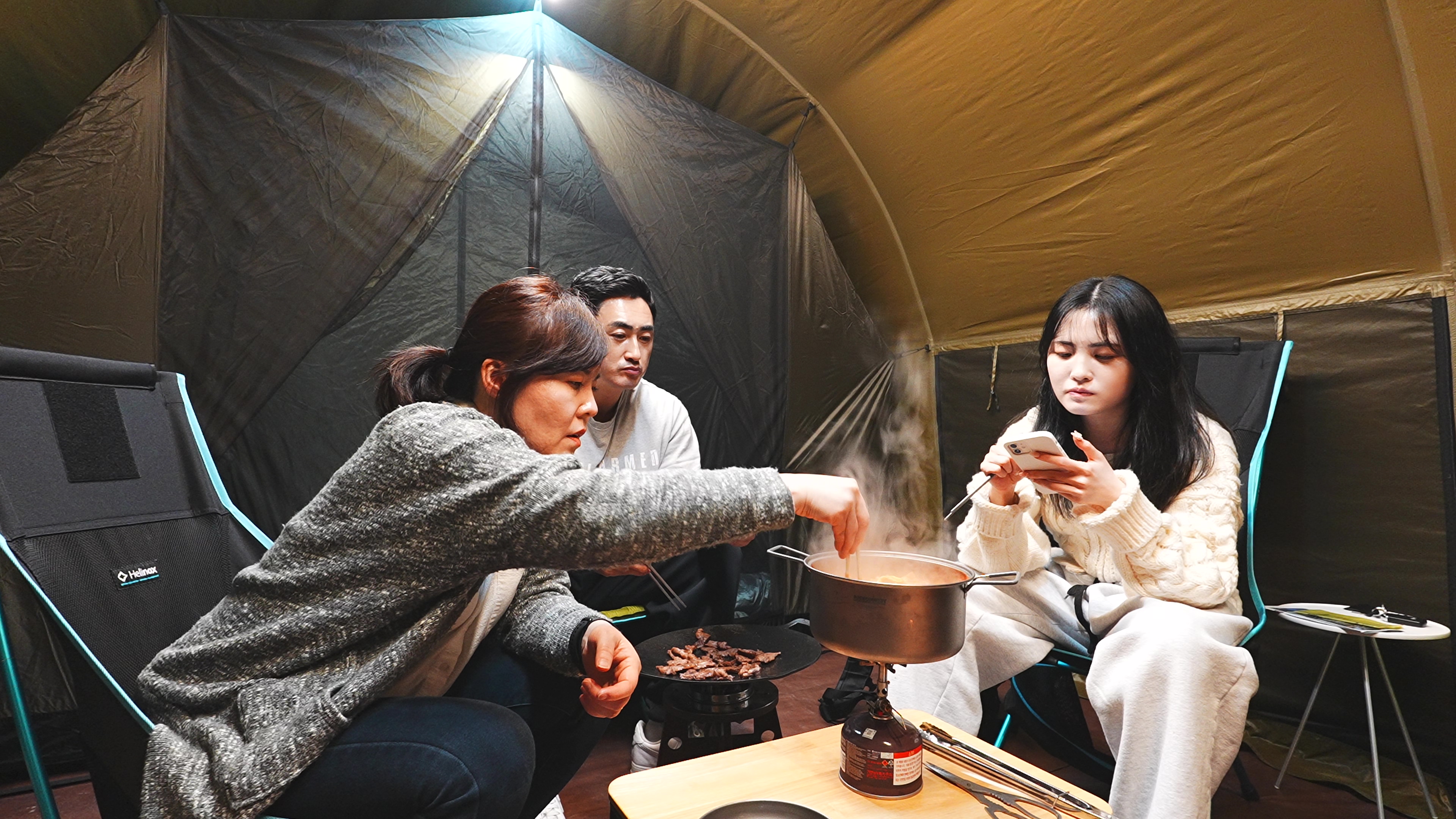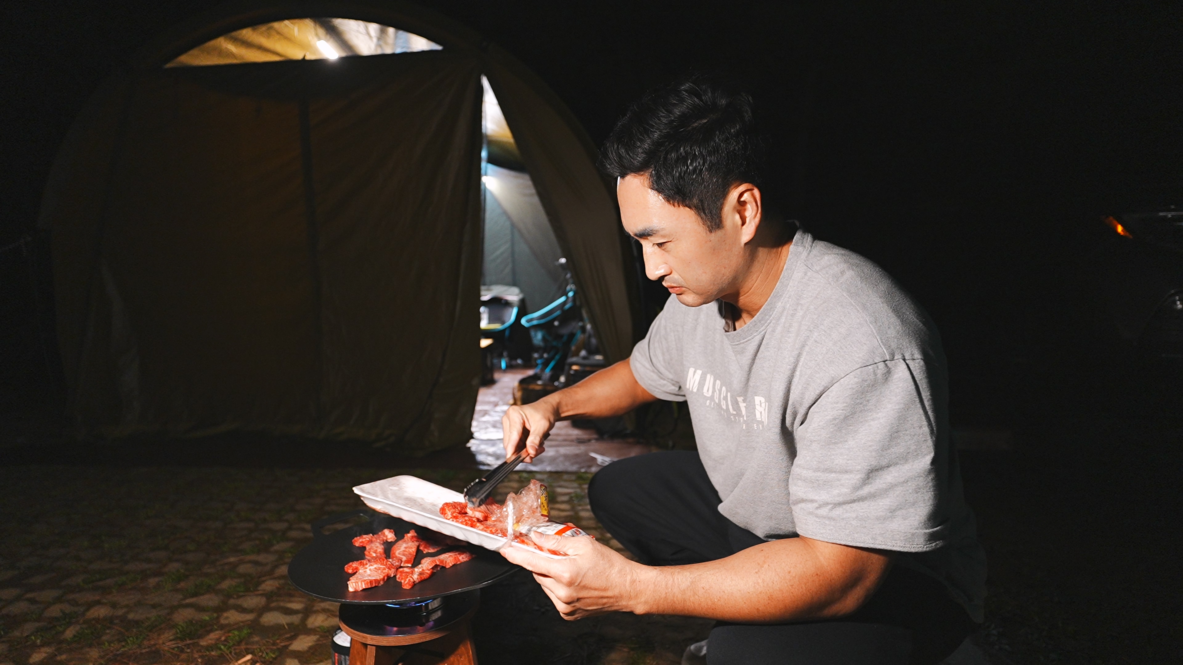텐트 개시한 날이라, 냄새 베이지 않게 고기는 텐트 밖에서 굽는 걸로