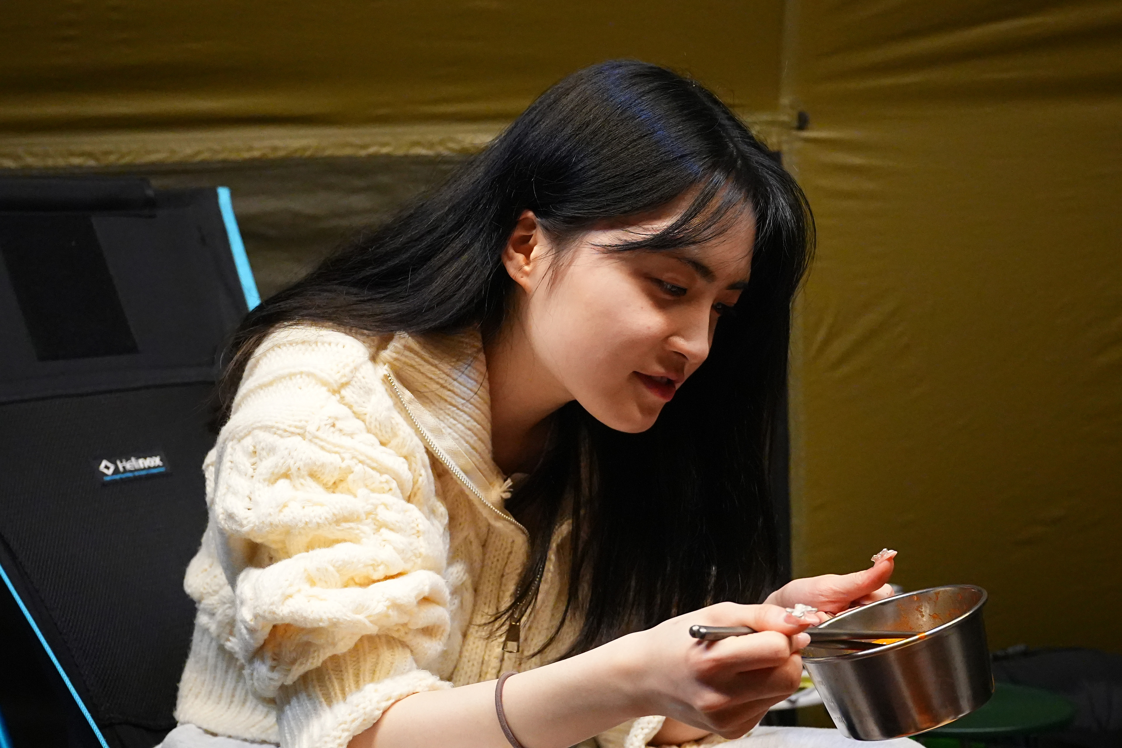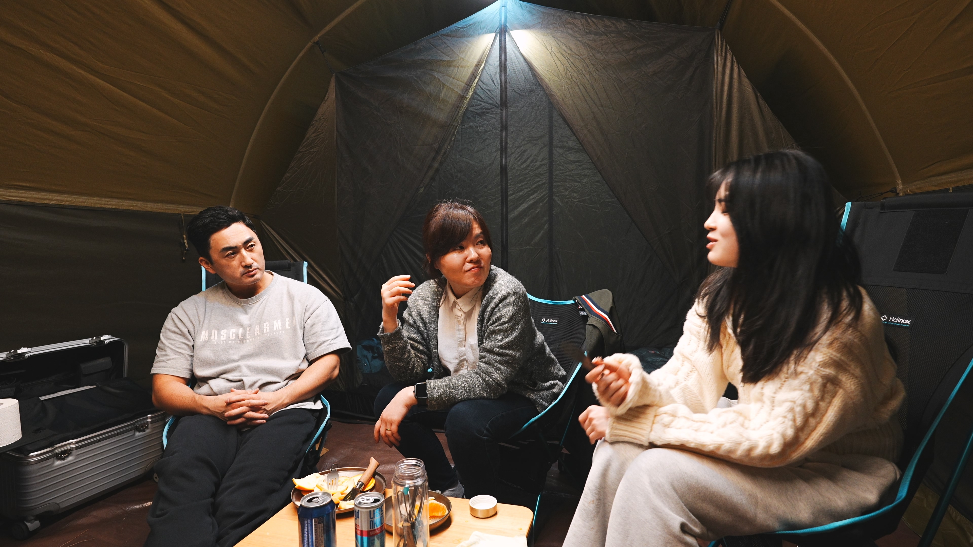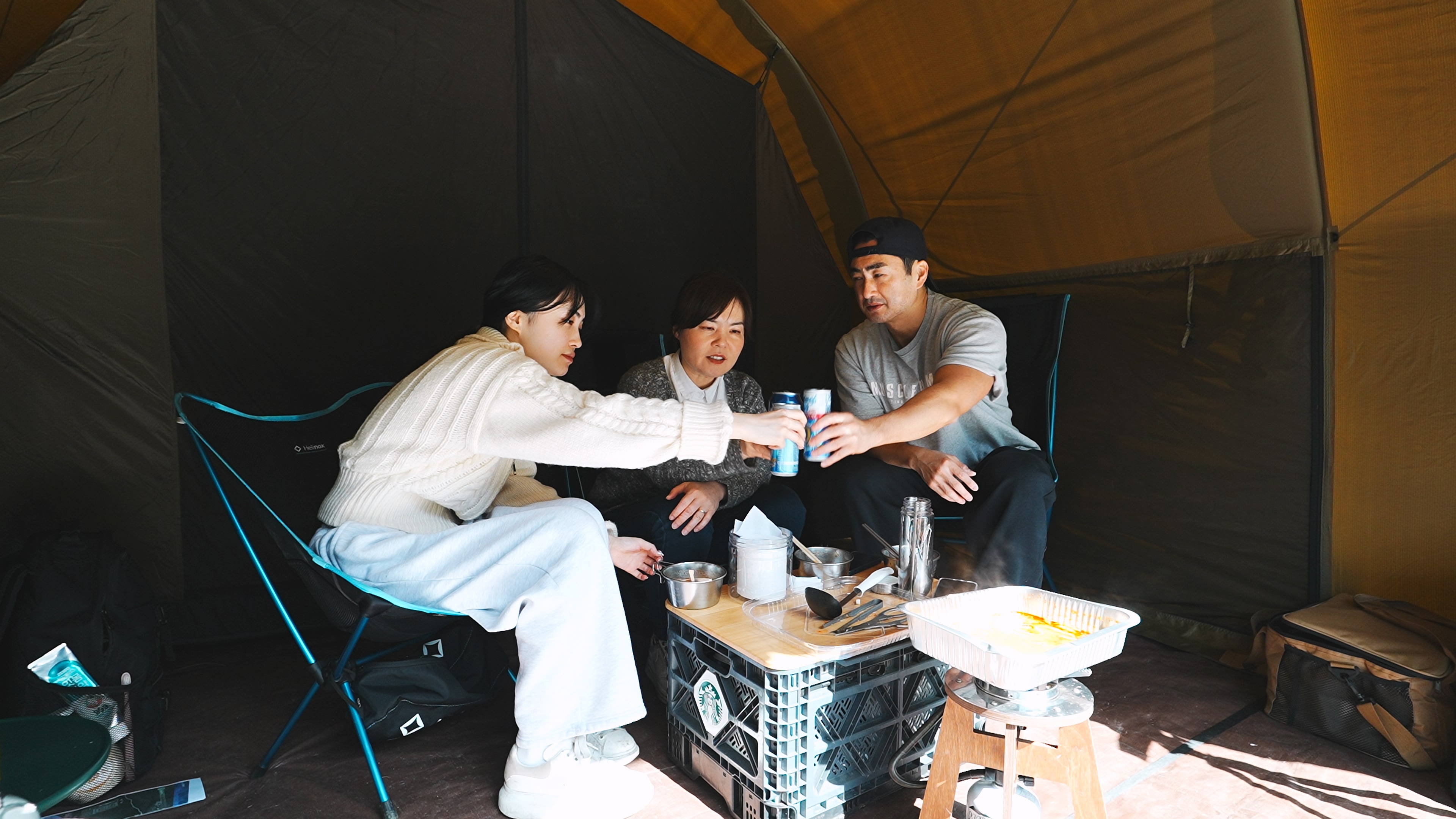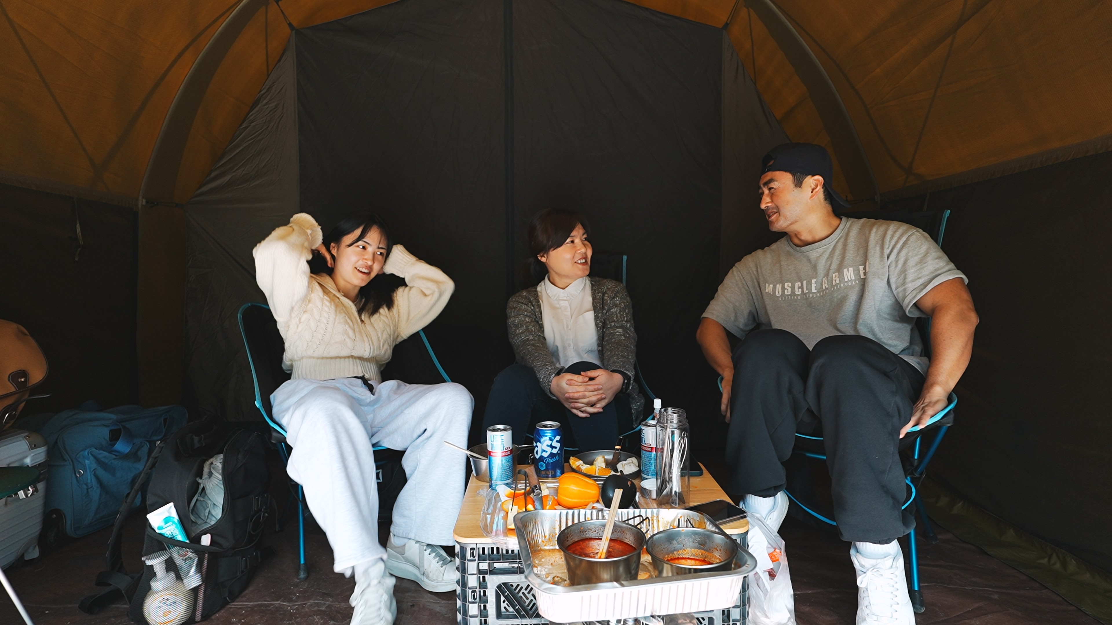 텐트 개시한 날이라, 냄새 베이지 않게 고기는 텐트 밖에서 굽는 걸로