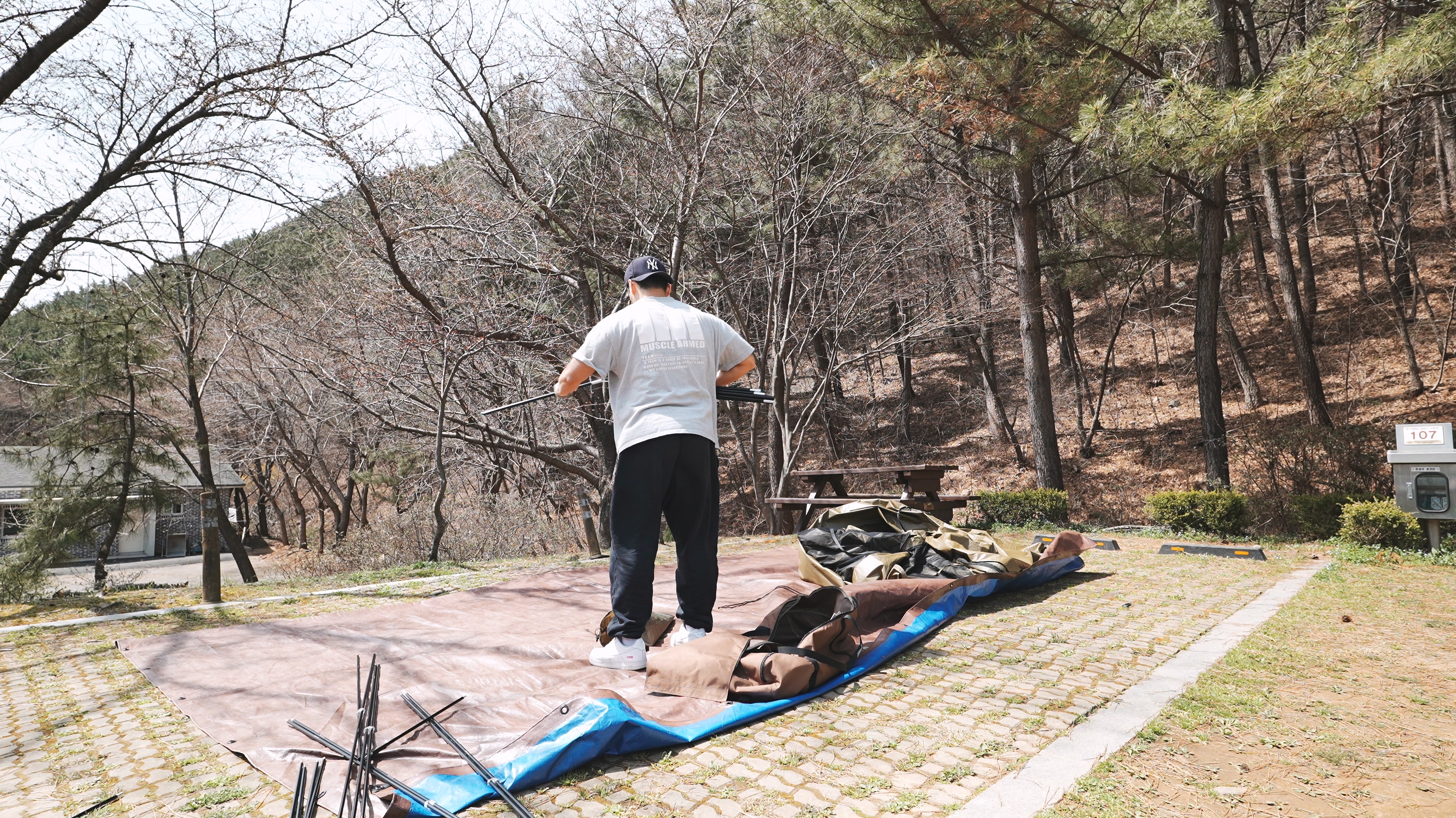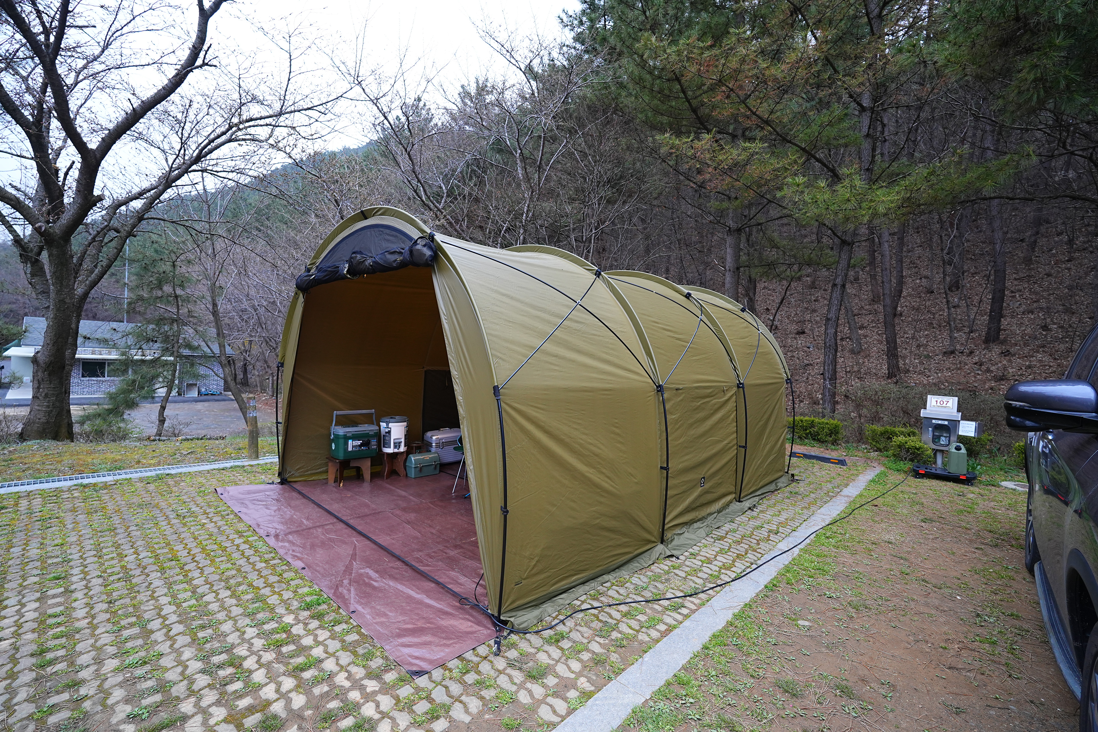 희리산 자연휴양림은 일반 야영장도 있고, 캠핑카 야영장이 있는데, 우리는 캠핑카 야영장의 107번 사이트이다. 사이트 크기는 10M * 10M 로 사이트 내에 자동차를 주차할 공간이 마련되어 있다.