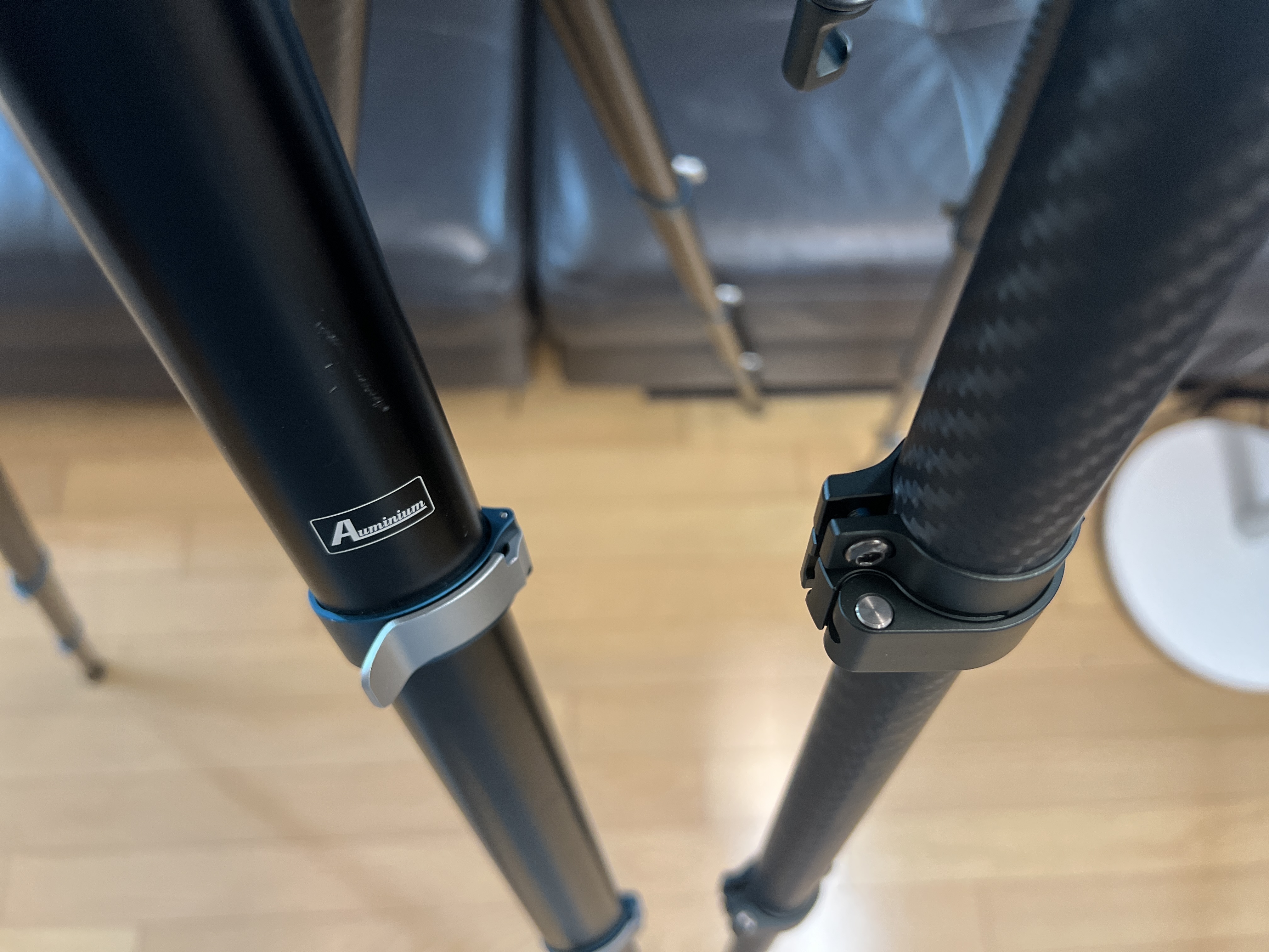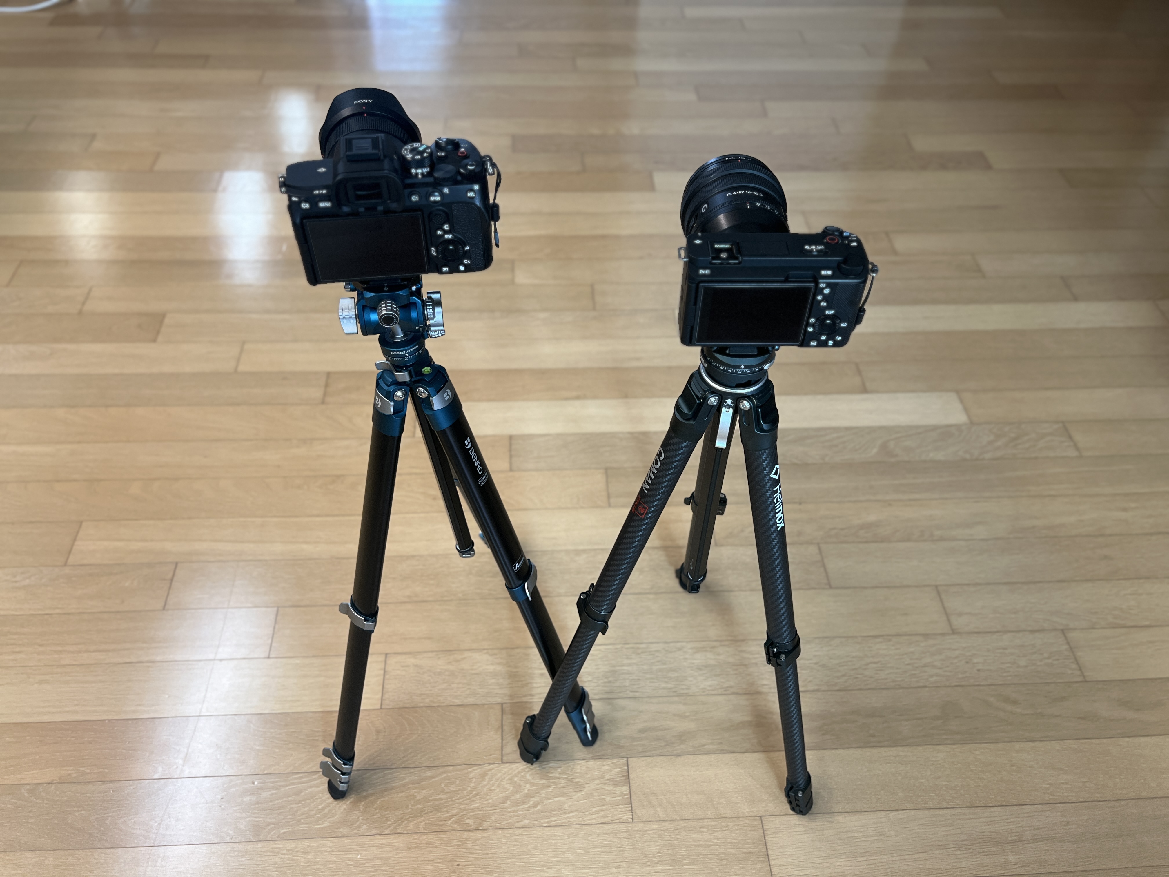 벤로 사이언버드(알루미늄모델) 삼각대와의 비교. 스펙상 코만제로 F38 이 42.5cm, 사이언버드(알루) 모델이 43.5cm 라서 1cm 차이인데, 사이언버드는 F38 플레이트를 장착해서 그런지 실측은 더 차이가 나 보인다.