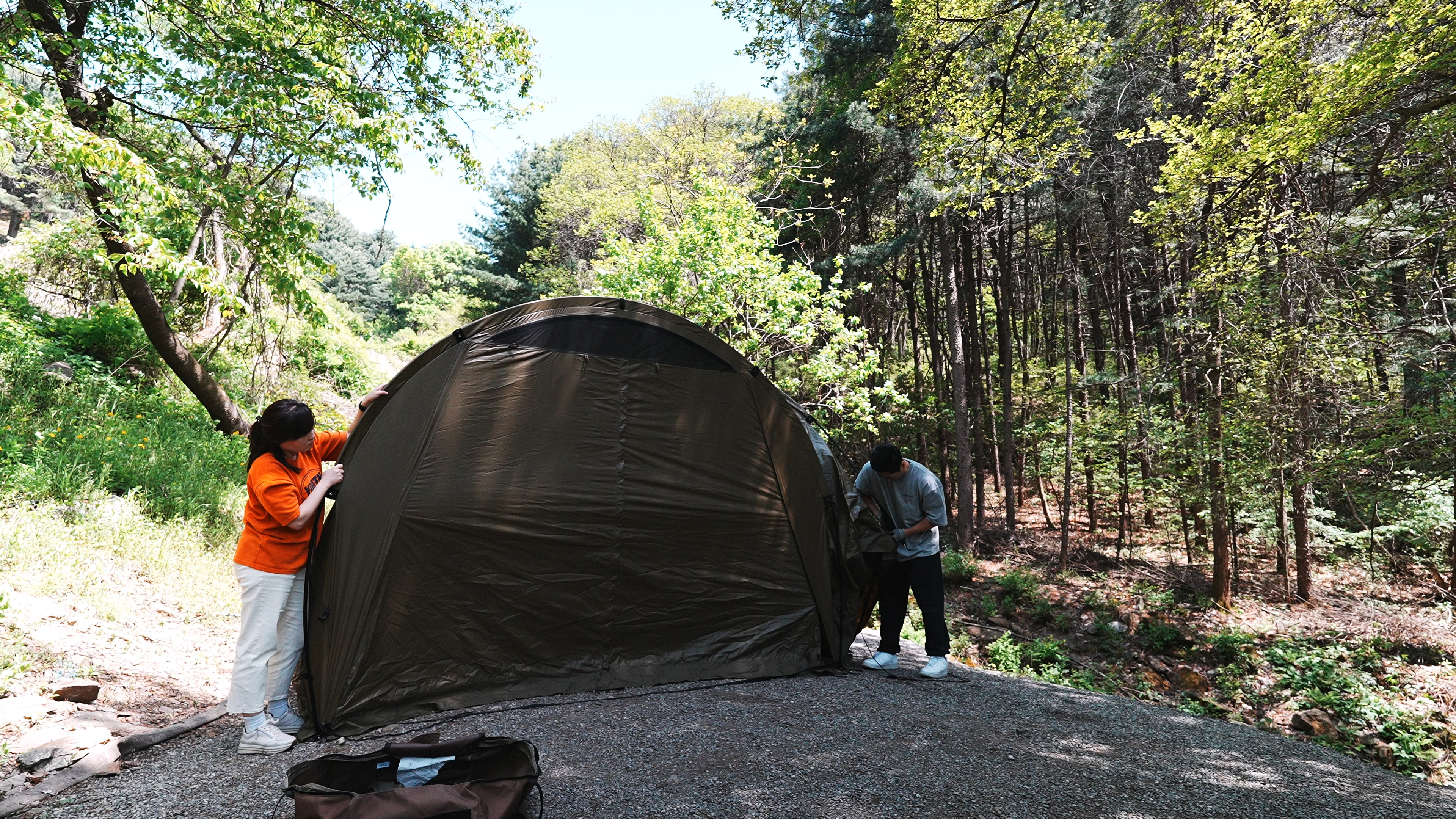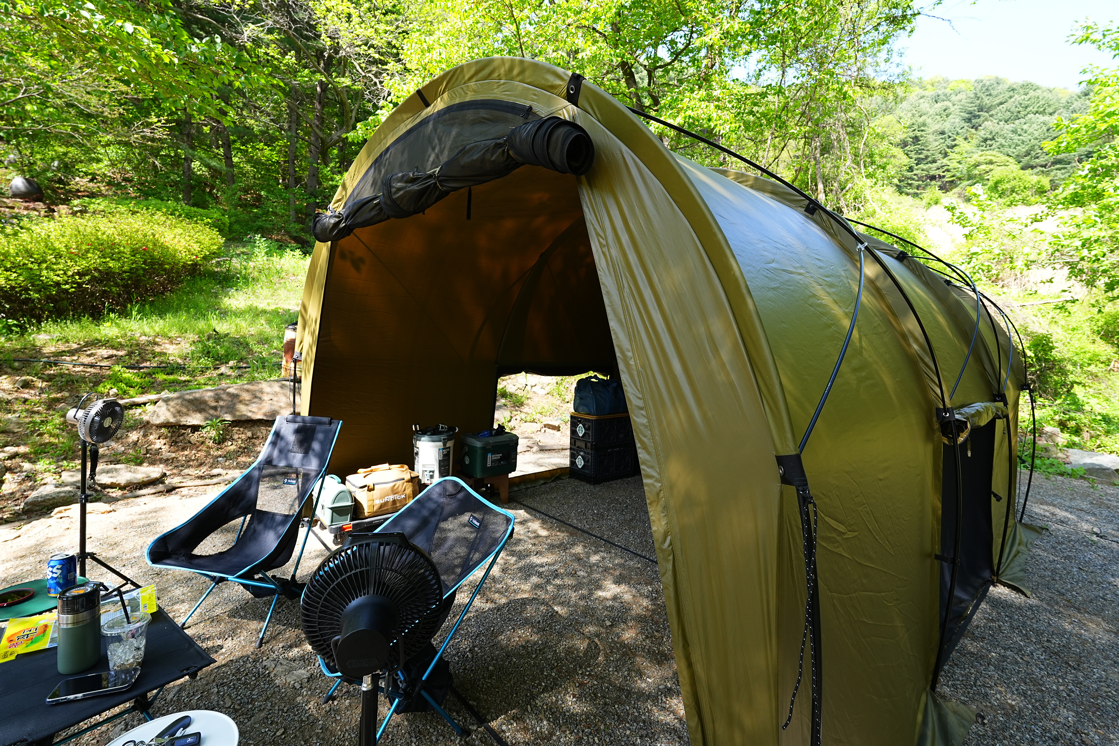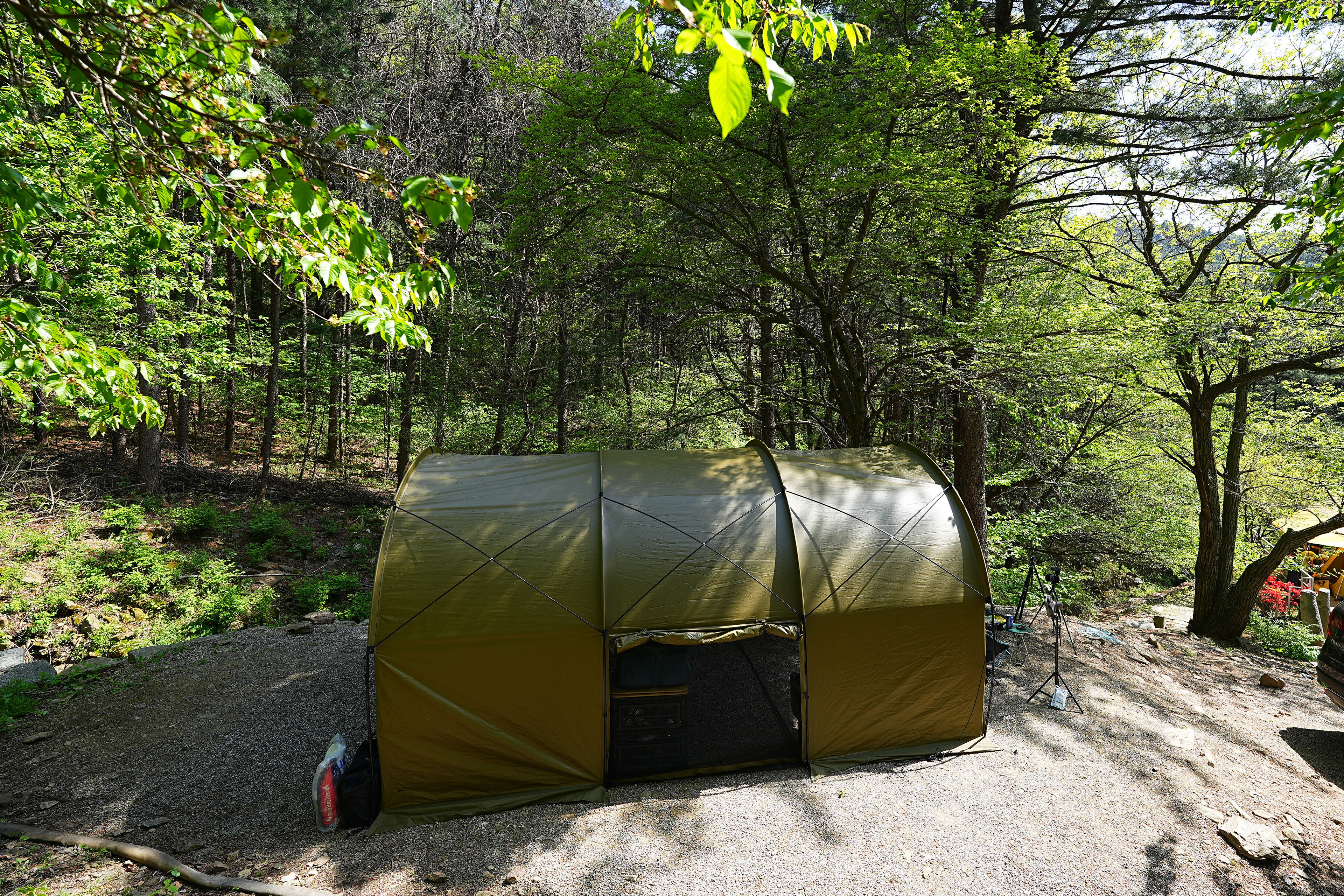 텐트 설치. 헬리녹스 터널 텐트 두번째 피칭이다. 사이트가 넓어서 3M * 4.35M 의 터널텐트가 여유있게 설치되고 앞에 앉을 공간까지 남는다.