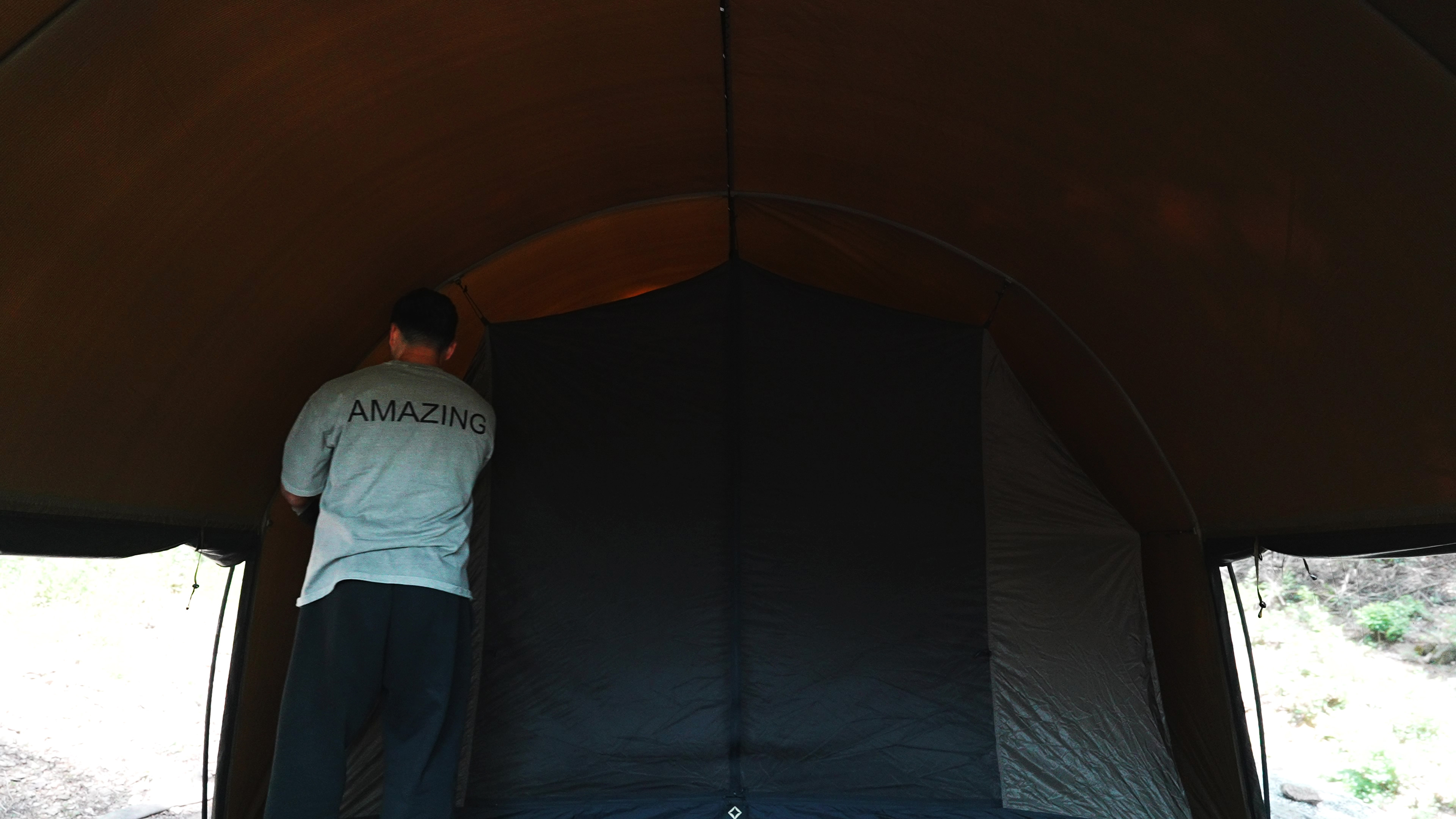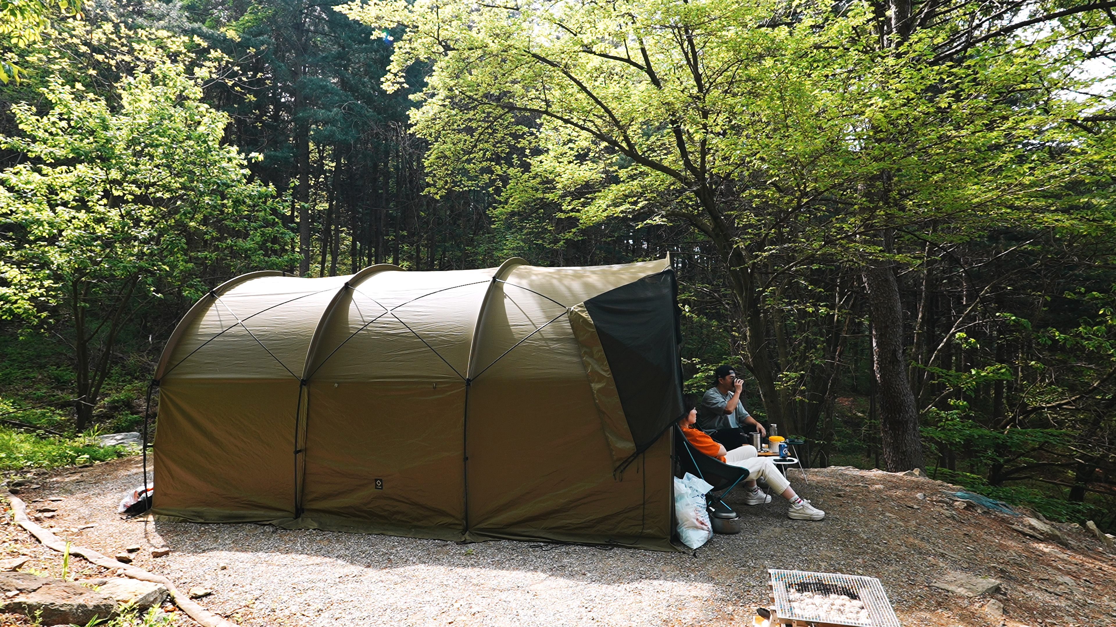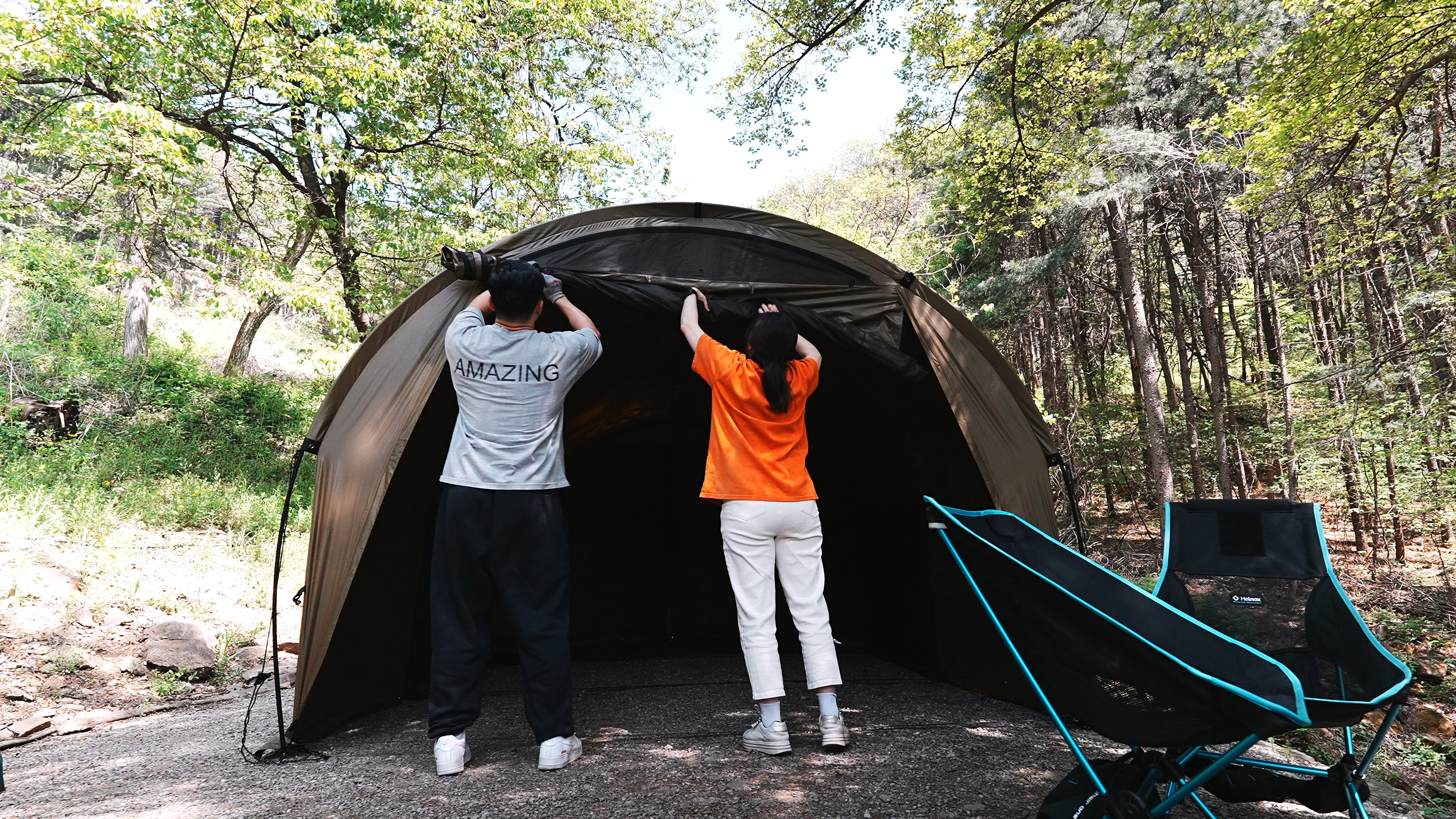 텐트 설치. 헬리녹스 터널 텐트 두번째 피칭이다. 사이트가 넓어서 3M * 4.35M 의 터널텐트가 여유있게 설치되고 앞에 앉을 공간까지 남는다.