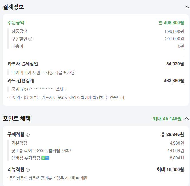 네이버 라이브쇼핑에서 구매했으며, 구입가격은 카드할인 해서 대략 46만원 정도. 적립금혜택 감안하면 42만원 정도에 구입한 셈. 게다가 운 좋게도 라이브 쇼핑때 선물에 당첨이 되어 2만원 상당의 샤오미 마우스까지 받게 되었다.