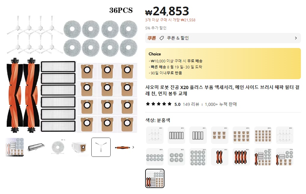 기능이 신통방통하다 보니, 거의 매일 작동을 시켜보고 있는데, 이러다간 부속품을 자주 교체 해야 할 듯 하여 알아보니, Aliexpress 에 X20 악세사리를 세트로 많이 팔고 있다. 위와 같이 2-3만원이면 한 1-2년은 거뜬히 쓸만한 부속품을 구매할 수 있으니 참고.
