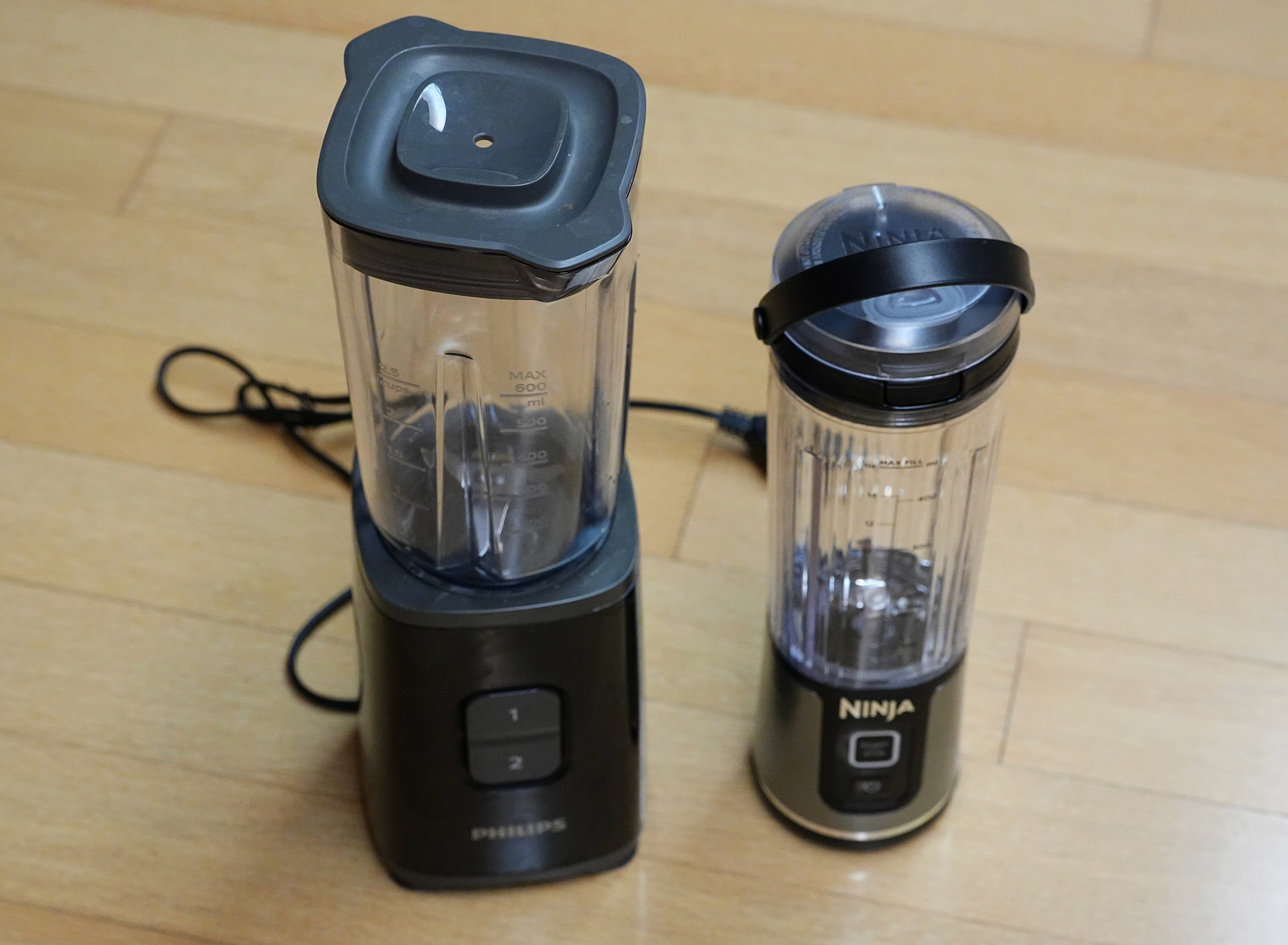 사용중인 필립스 4만원짜리 유선 블렌더와, 닌자 무선블렌더. 필립스 유선 블렌더도 작다고 생각했는데, 비교해보면 크기차이가 확 난다.