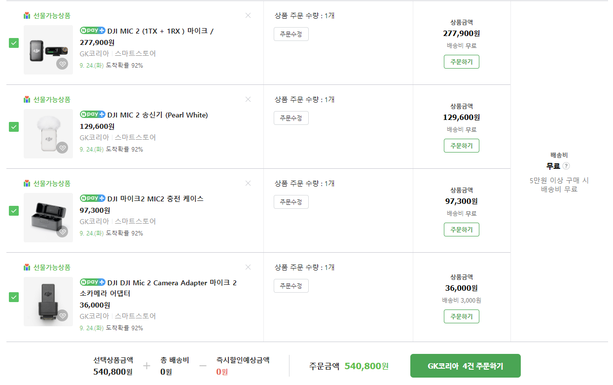 그리고 흰 옷을 자주 입었던 상황에서 검은색 송신기가 너무 눈에 띌 때가 종종 있었기 때문에, 화이트가 꼭 있었으면 했는데 검+흰색 조합의 세트상품은 없었고, 검은색 송신기1+수신기1 조합된 상품, 충전케이스 등을 별도로 판매하고 있어 화이트 송신기를 비롯하여 다른 상품들을 개별구매해서 세트로 조합하기로 결정하였다.