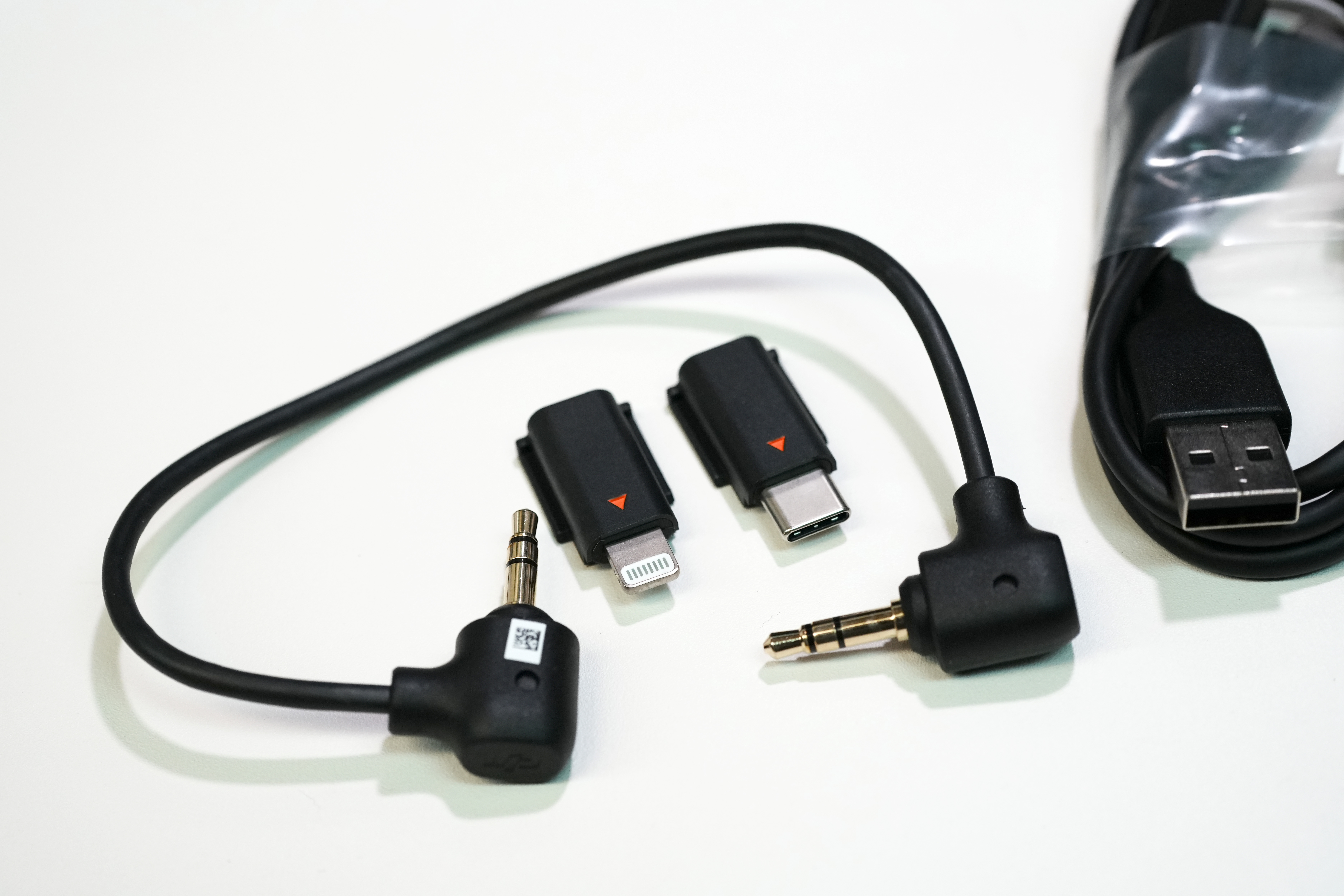 구성품은 파우치1개, 3.5mm TRS 케이블, 라이트닝 어댑터, USB-C어댑터, USB 스플리터 케이블, 송신기, 수신기, 윈드스크린